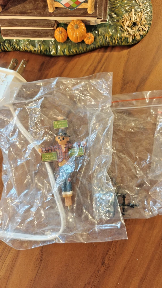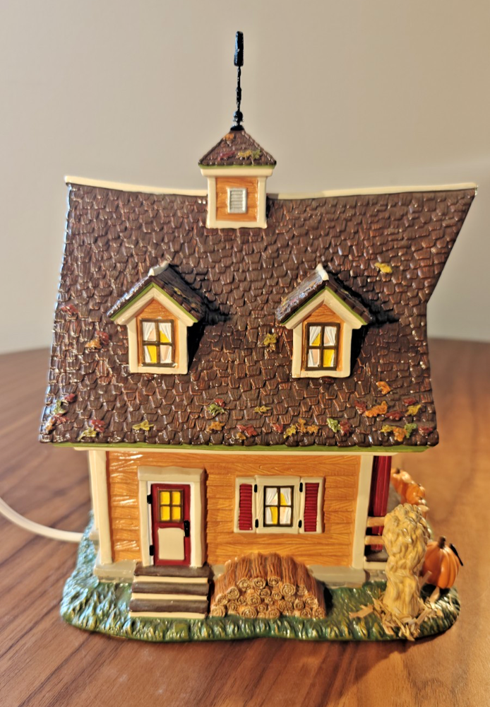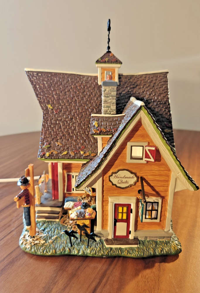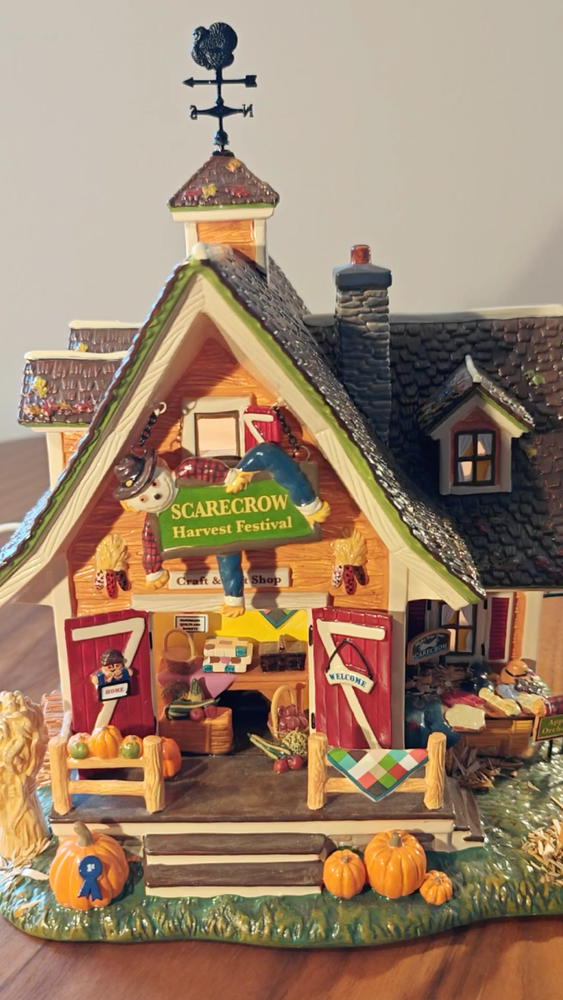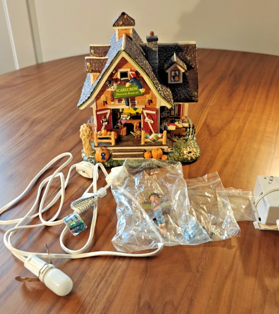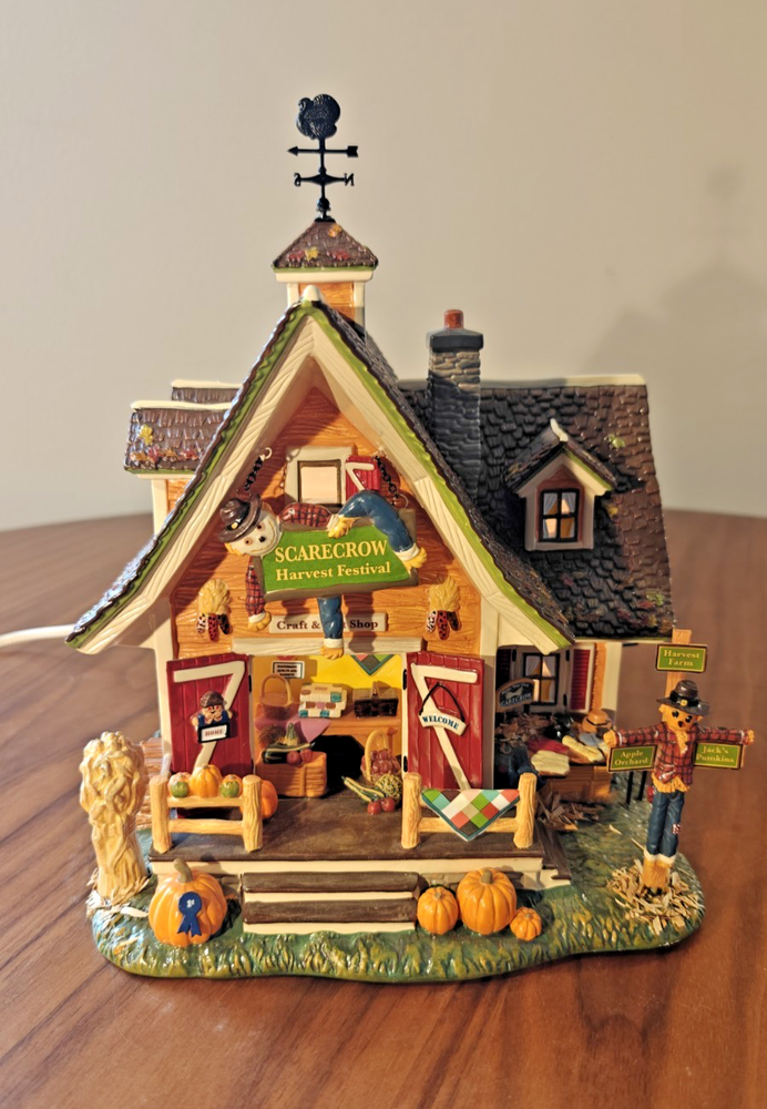 The Department 56 Snow Village Scarecrow Harvest Festival 2007 # 799932 is a collectible Halloween village house-shaped piece made of ceramic and porcelain. Part of the Snow Village collection, this original piece features a scarecrow character, perfect for adding a whimsical touch to your Halloween decor. Packaged in its original box, this village house is a charming addition to any Halloween display.