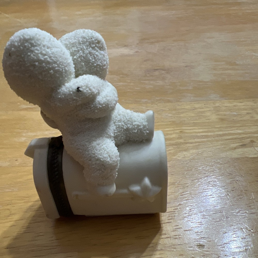 This product is a Department 56 Snowbabies trinket box called "Sending Hugs to You" with a hinged lid. It features an angel character and a boxing subject, with a white matte finish made of porcelain bisque. The figurine was manufactured in 1999 and is part of the Snowbabies collection. It is an original piece and has been retired. The trinket box would make a great addition to any Christmas or seasonal collection.