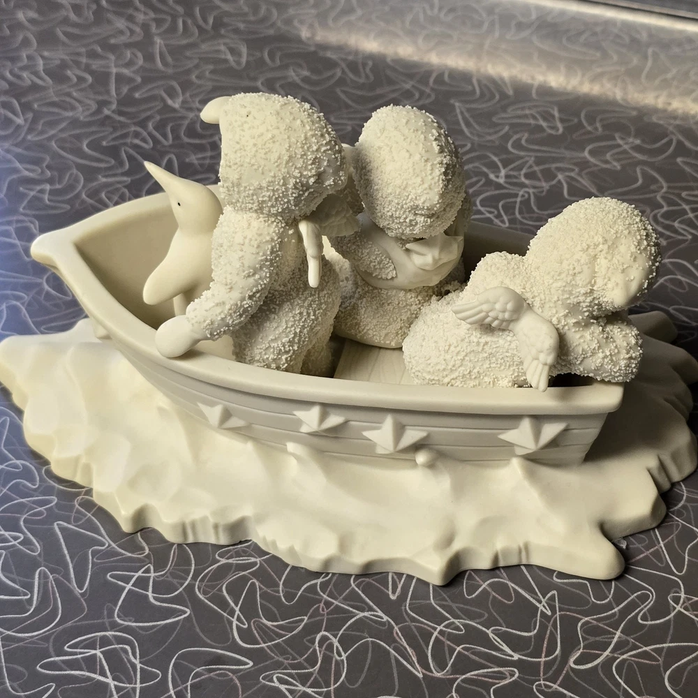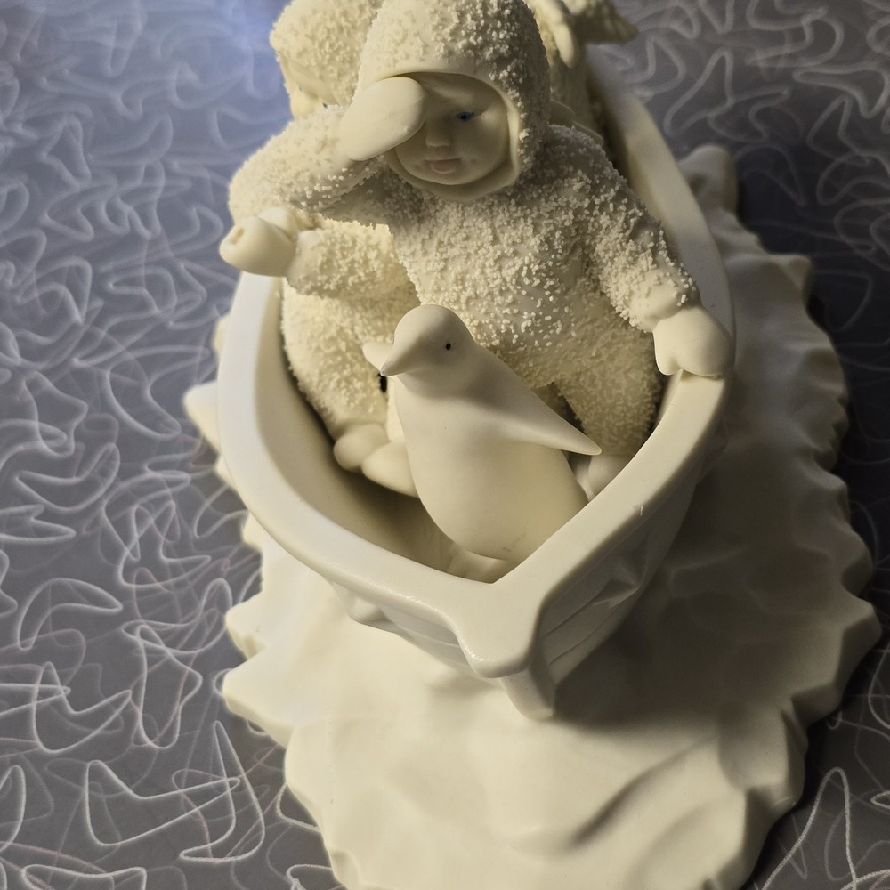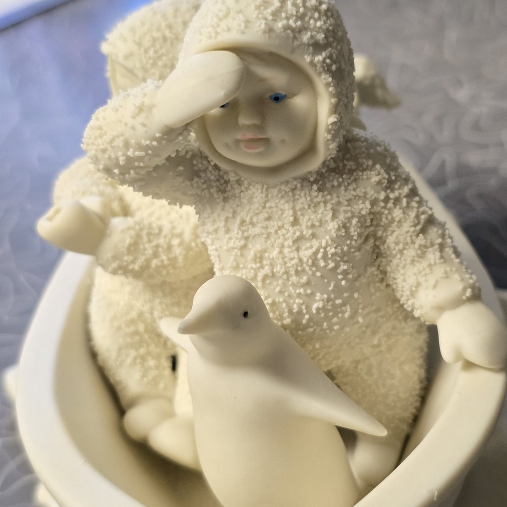 SEE PHOTOS MISSING POLE FOR STAR...STAR IS HERE..PREOWNED CONDITION This product is a rare and collectible Snowbabies figurine from Department 56. It features a penguin character in a boat with a textured finish. The porcelain material and white color are accented with winter-themed details, making it a perfect addition to any holiday collection. The item is 4.5 inches in height and 5.5 inches in width, and was manufactured in 1993. It is an original piece, retired and from the 1990-1999 time period.