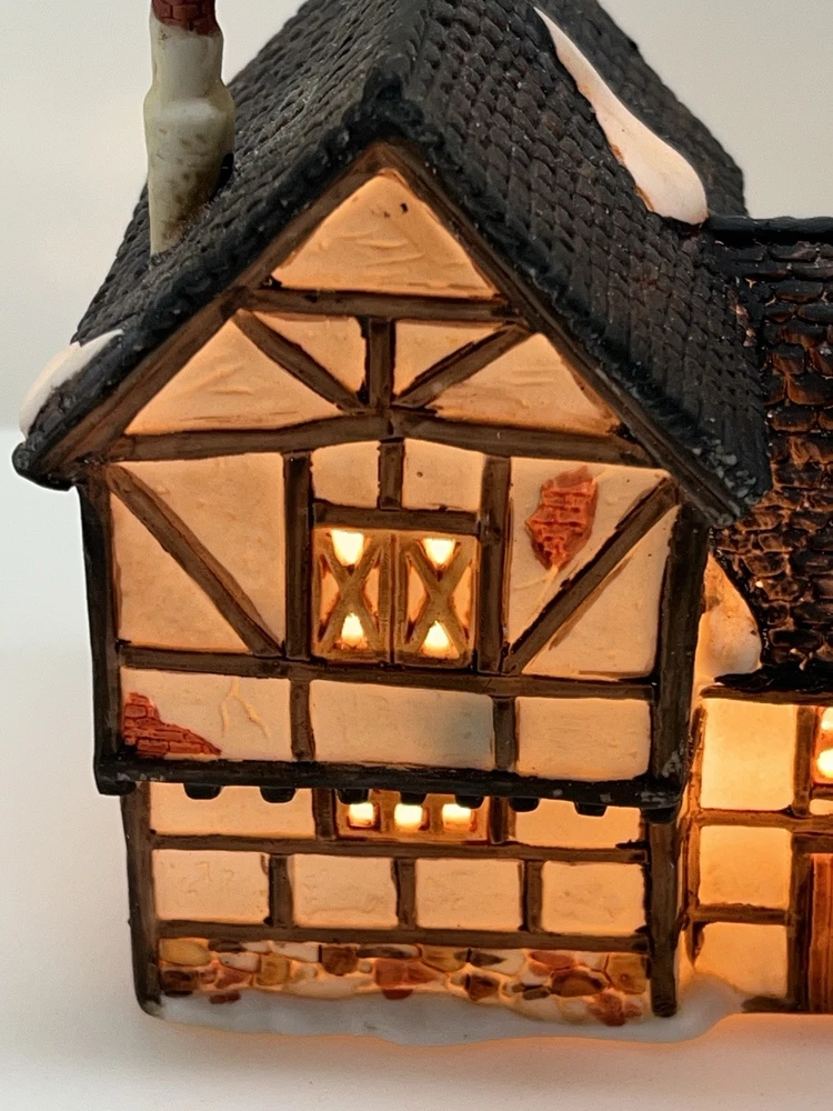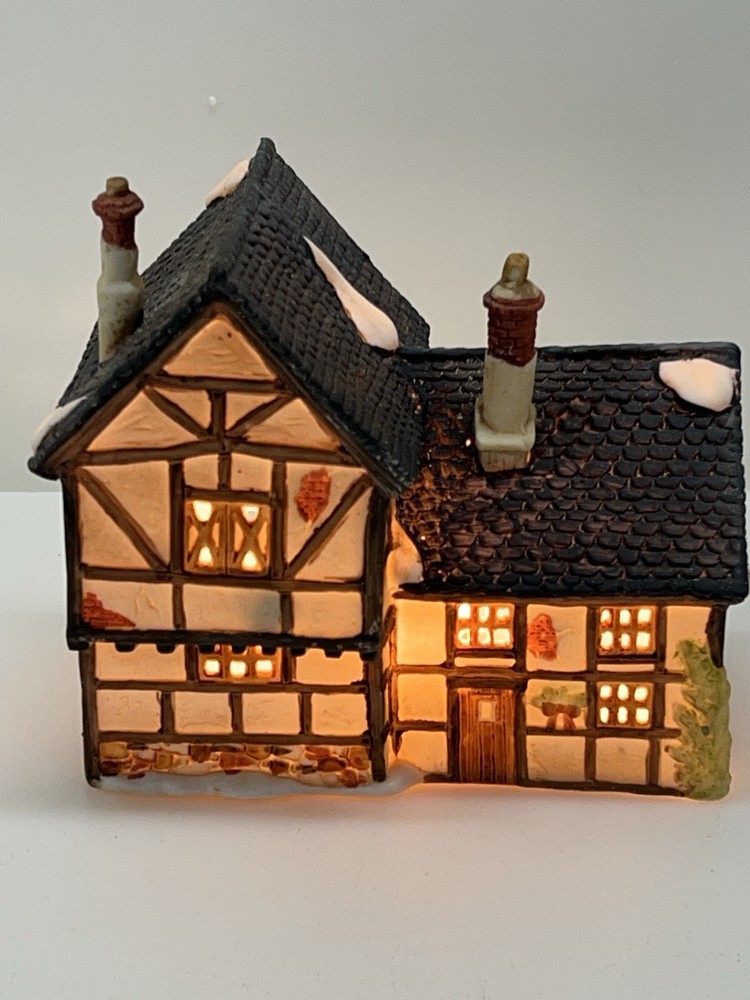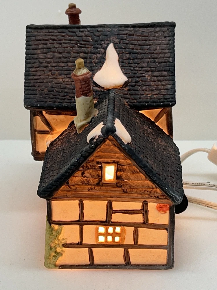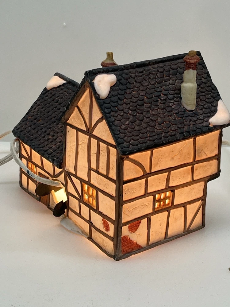 This beautiful porcelain cottage from the Department 56 Heritage Village Collection is a must-have for any collector of Christmas village houses. The Tudor Cottage, also known as the Dickens Village, features intricate hand-painted details and is illuminated for a cozy and charming display. The cottage is medium-sized, measuring 6 inches in length, 6 inches in height, and 4 inches in width, and is suitable for any room in your home. The cottage is a retired piece from 1985 and comes in its original box with the slip sleeve and styrofoam container. It is perfect for seasonal village displays and would make a great addition to any Dickens Village collection. The cottage is multi-colored and depicts a whimsical scene from Charles Dickens' Victorian era. This collectible item is a great gift for any lover of Christmas and Dickensian culture. Perfect condition with all original packaging including light & cord