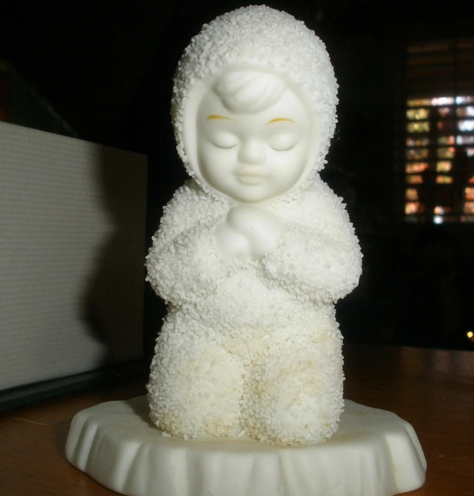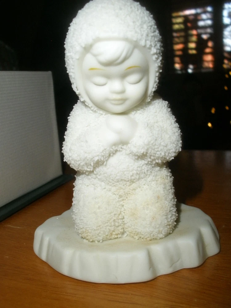 This is for Department 56 68390 Winter Tales of the Snowbabies "Now I Lay Me Down To Sleep" IT is preowned in the box. The box does show some damage on the side. - see pictures The figure is kneeling and praying. This is Part of the Winter Tales. The box is shaped like a book.