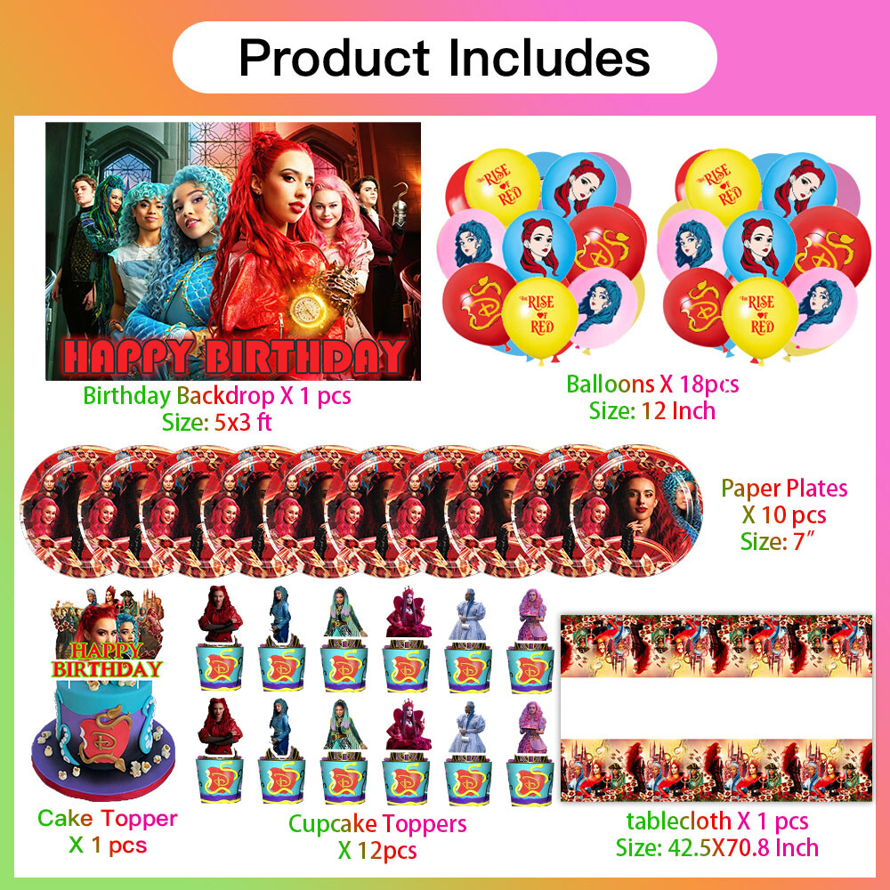 About this item 【Themed Sets of Matching Units】: ☰ Take this good favor for themed party to impress your kids and their friends. ☰ Enrich your kids’childhood dream well,giving them a fantastic surprise. 【Party Decor Is So Easy】: ☰ It contains all of your Descendants The Rise of Red birthday party tableware needs and is completely disposable. ☰ You can save more time to enjoy this party with your guests. 【Real Savings For You】 ☰ The shiny large backdrop decor will attract you eyes and make everyone laugh.The banner cloth is printed in high definition, making it the perfect party background wall. It is made of thick cloth, not paper. ☰ You will save over 70% compared to buying all 2 Descendants The Rise of Red party supplies separately. 【Super Value Descendants The Rise of Red Package】: ✪ 1PCS X Large Happy Birthday Banner 5x3ft(150x90cm) ✪ 10PCS X 9 Inch Thick Paper Plates. ✪ 16PCS Balloons. ✪ 1PCS X Cake Topper. ✪ 12PCS X Cupcake Toppers. ✪ 1PCS X Tablecloth. 【After Sale Service】: ☰ We try our best to bring the best use experience to our customers. ☰ If you are not satisfied with the purchase of this set or have any questions about the product,please contact us at any time.We will definitely solve the problem for you in the first time. ☰ We can also custom backdrop other size or pictures you want. Any questions please contact us. On Jul 12, 2025 at 21:10:15 PDT, seller added the following information: