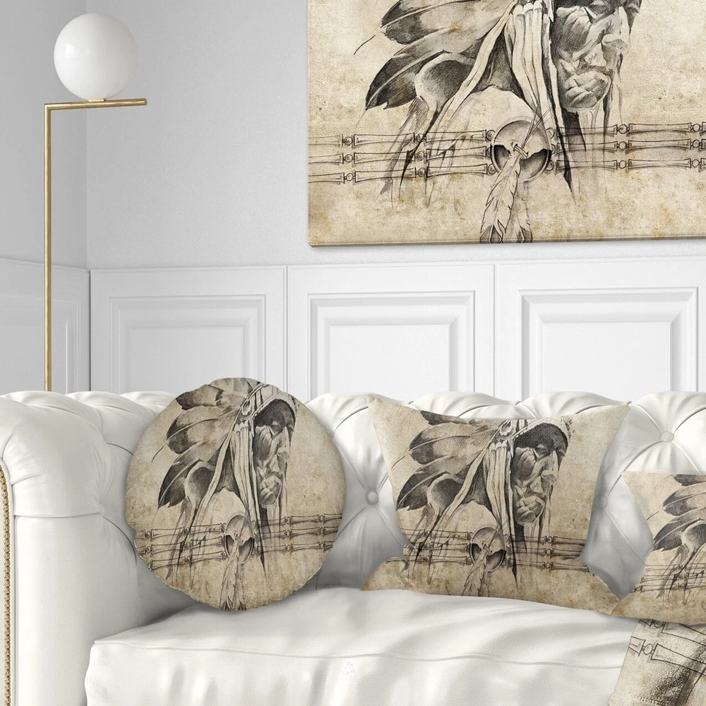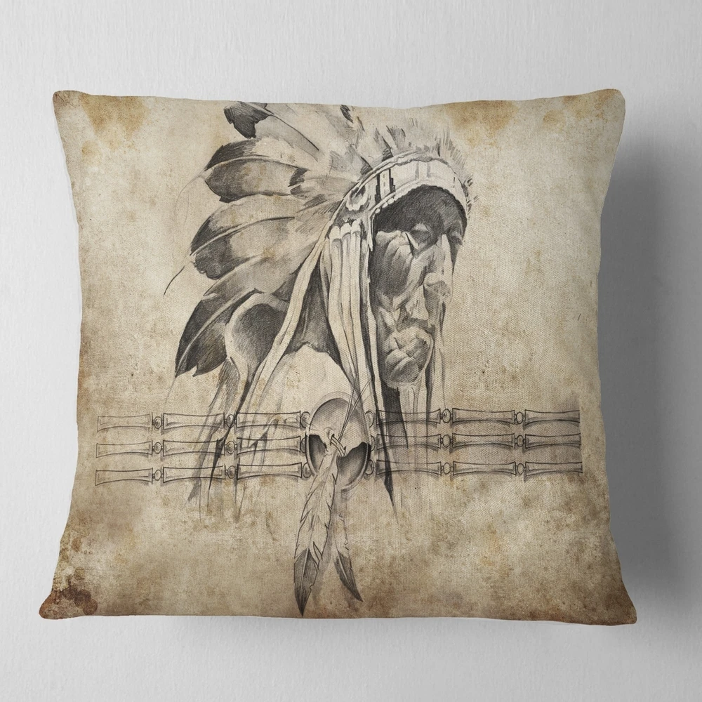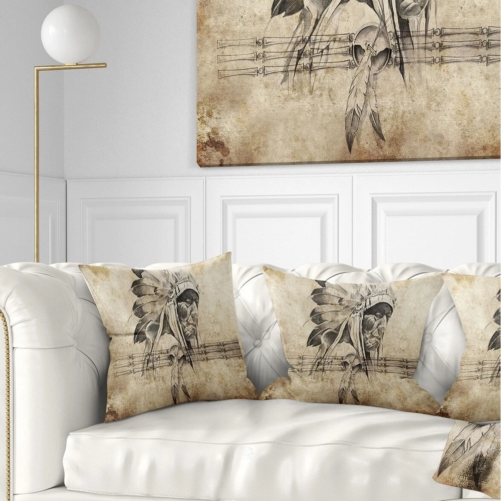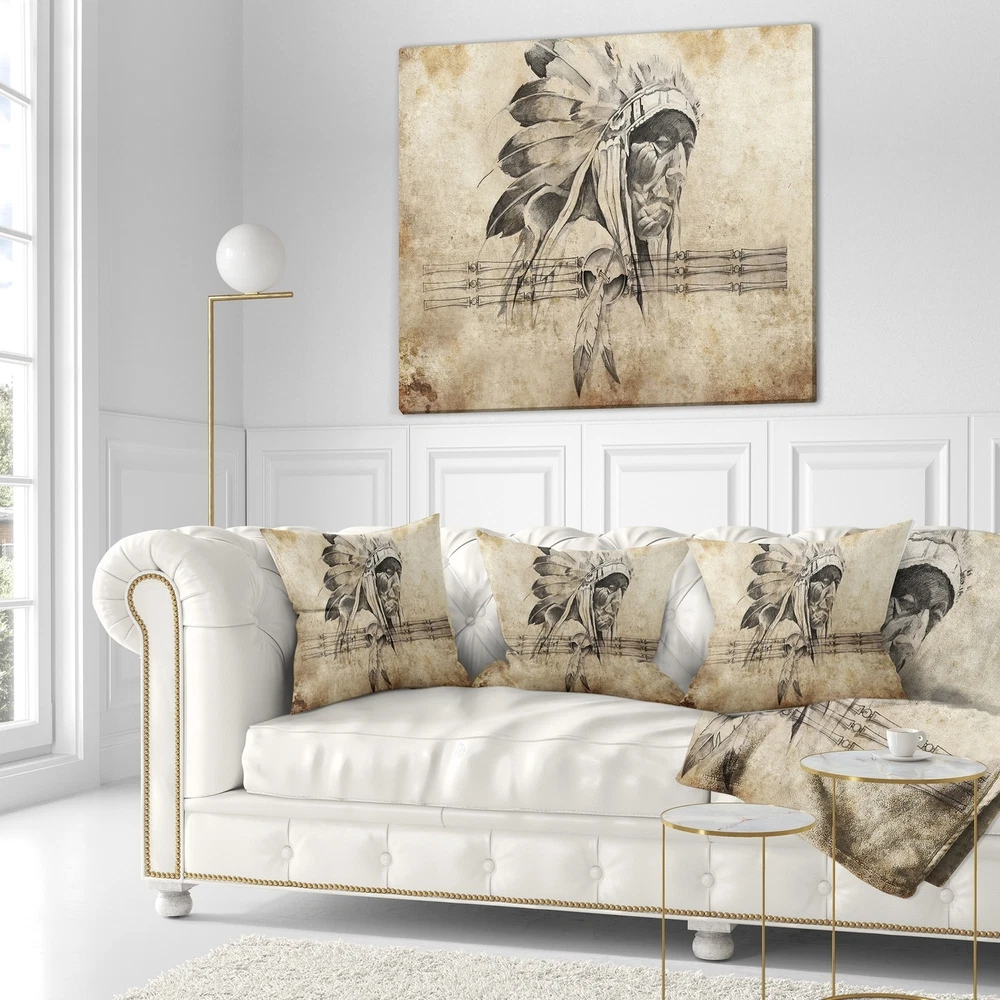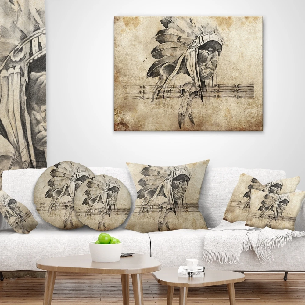 Decorative Throw Pillows for Couch Bed Sofa with Zip CoversAn easy, fun way to add a pop of color or bring new life to any room in your home or office is with these beautiful Portrait throw pillows. Dress up your bed, sofa or lounger with this decorative design art pillows. Perfect as Traditional bedroom décor, lounge décor Modern living room décor. It adds a fun accent to any room. Throw pillows really do work wonders: they can transform any room from uninviting discomfort to warm and welcoming. And they really do go almost anywhere - arrange a couple on the couch or sofa, place one in your overstuffed chair for extra coziness, toss a couple on the bed and prop yourself up for a great read.These Romantic pillow is printed using High Color Density Italian inks to create a vibrantly Free Shipping Over $49.99* Details Designart 'American Indian Warrior Tattoo Sketch' Abstract Throw Pillow Product Description: Decorative Throw Pillows for Couch Bed Sofa with Zip Covers An easy, fun way to add a pop of color or bring new life to any room in your home or office is with these beautiful Portrait throw pillows. Dress up your bed, sofa or lounger with this decorative design art pillows. Perfect as Traditional bedroom décor, lounge décor Modern living room décor. It adds a fun accent to any room. Throw pillows really do work wondersthey can transform any room from uninviting discomfort to warm and welcoming. And they really do go almost anywhere - arrange a couple on the couch or sofa, place one in your overstuffed chair for extra coziness, toss a couple on the bed and prop yourself up for a great read. These Romantic pillow is printed using High Color Density Italian inks to create a vibrantly colored, sharp artwork. Features: Perfect accent to any furniture piece Basic shapes with a modern graphic design twist Printed on 100% light weight polyester Cushion filled with 100% polyester fill Wrinkle resistant fabric Zip Closure so you can remove the pillow from its' cover Down-like comfort - Odorless 100% Hypoallergenic Machine Wash Cold Separately, Gently Cycle Only, No bleach, hang to dry Print on Demand with High Density Italian Ink Available in Several sizes Attribute :Traditional, Modern, Contemporary Subject Romantic, People, Portrait
