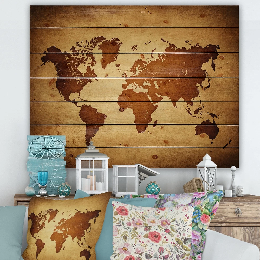 Alas, a modern take on wood wall art. Once typically a wall art piece found only in rustic or farmhouse style decor settings, this Map wood wall art will easily fit into even the most contemporary of designs.Using the highest quality 6 Color Canon UV Ink, this Vintage wood wall art incorporates several aspects of fine design into one stunning piece. With its slightly visible wood grain appearing through the colors and sleekly finished edges, it is a wonderful choice for any room in your home or office, being it a traditional or modern space. As each piece of wood has natural grain differences from the next, each of these wood wall arts is a truly unique addition to your space.Each Wood wall art is 100% handmade in Canada on Natural pine wood, using the highest quality ink which will not Free Shipping Over $49.99* Details Designart 'Ancient Map of The World VI' Vintage Print on Natural Pine Wood Product Description: Alas, a modern take on wood wall art. Once typically a wall art piece found only in rustic or farmhouse style decor settings, this Map wood wall art will easily fit into even the most contemporary of designs. Using the highest quality 6 Color Canon UV Ink, this Vintage wood wall art incorporates several aspects of fine design into one stunning piece. With its slightly visible wood grain appearing through the colors and sleekly finished edges, it is a wonderful choice for any room in your home or office, being it a traditional or modern space. As each piece of wood has natural grain differences from the next, each of these wood wall arts is a truly unique addition to your space. Each Wood wall art is 100% handmade in Canada on Natural pine wood, using the highest quality ink which will not fade over time. Available in Differents sizes - OrientationHorizontal - SubjectMap TypeWood Wall Art, Fine Art, Wood Fine Art, Print on Plaque - Arrives ready to hang on the wall with hanging kit included - MaterialMade with 100% natural pine wood - StyleVintage - Number of Pieces1 - ColorBrown