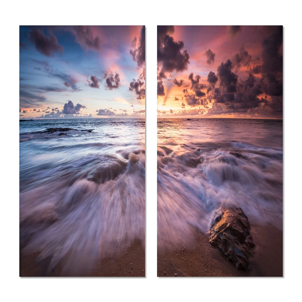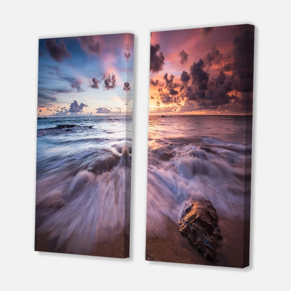 This beautiful Nautical & Coastal 2 piece set of Canvas Art is printed using the highest quality fade-resistant ink on canvas. Every one of our fine art giclee canvas prints is printed on premium quality cotton canvas, using the finest quality inks which will not fade over time. Each giclee print is stretched tightly over a 1-inch wood sub frame ensuring the canvas is taught and does not buckle. This canvas art print is gallery-wrapped (the design continues on the sides), giving it a real art gallery feel. All of our canvas prints are carefully packaged with plastic protection, fragile labeling, and sturdy boxes to ensure safe delivery. Every canvas print arrives ready to hang on the wall, with the hanging kits included.- Style : Nautical & Coastal- Subject : Beach, Landscapes- Color : Free Shipping Over $49.99* Details Designart "Beautiful Sea Waves At Sunset" Beach Canvas Wall Art Print 2 Piece Product Description: This beautiful Nautical & Coastal 2 piece set of Canvas Art is printed using the highest quality fade-resistant ink on canvas. Every one of our fine art giclee canvas prints is printed on premium quality cotton canvas, using the finest quality inks which will not fade over time. Each giclee print is stretched tightly over a 1-inch wood sub frame ensuring the canvas is taught and does not buckle. This canvas art print is gallery-wrapped (the design continues on the sides), giving it a real art gallery feel. All of our canvas prints are carefully packaged with plastic protection, fragile labeling, and sturdy boxes to ensure safe delivery. Every canvas print arrives ready to hang on the wall, with the hanging kits included. - Style Nautical & Coastal - Subject Beach, Landscapes - Color Purple - This canvas giclee print is gallery-wrapped (the design continues on the sides), giving it a real art gallery feel. - Premium quality cotton canvas. - Arrives ready to hang on the wall - Easy to Hang