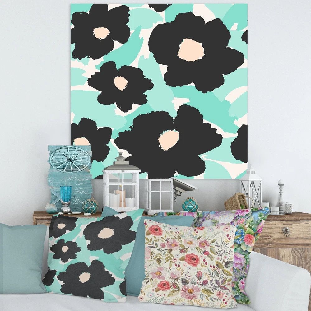 This beautiful Vintage Canvas Art is printed using the highest quality fade resistant ink on canvas. Every one of our fine art giclee canvas prints is printed on premium quality cotton canvas, using the finest quality inks which will not fade over time. Each giclee print is stretched tightly over a 1 inch wood sub frame for small size prints or a 1.5 inch wood sub frame for large size prints (40x30 60x28 ...) ensuring the canvas is taught and does not buckle. This canvas art print is gallery-wrapped (the design continues on the sides) , giving it a real art gallery feel. All of our canvas prints are carefully packaged with plastic protection, fragile labeling and sturdy boxes to ensure a safe delivery. Every canvas print arrives ready to hang on the wall, with the hanging kits included.- Free Shipping Over $49.99* Details Designart "Black Daisy Flowers On Turquoise III" Vintage Canvas Wall Art Print Product Description: This beautiful Vintage Canvas Art is printed using the highest quality fade resistant ink on canvas. Every one of our fine art giclee canvas prints is printed on premium quality cotton canvas, using the finest quality inks which will not fade over time. Each giclee print is stretched tightly over a 1 inch wood sub frame for small size prints or a 1.5 inch wood sub frame for large size prints (40x30 60x28 ...) ensuring the canvas is taught and does not buckle. This canvas art print is gallery-wrapped (the design continues on the sides) , giving it a real art gallery feel. All of our canvas prints are carefully packaged with plastic protection, fragile labeling and sturdy boxes to ensure a safe delivery. Every canvas print arrives ready to hang on the wall, with the hanging kits included.- Style Vintage, Traditional- Subject Floral, - Color Turquoise, Black- This canvas giclee print is gallery-wrapped (the design continues on the sides) , giving it a real art gallery feel.- Premium quality cotton canvas.- Arrives ready to hang on the wall- Easy to Hang