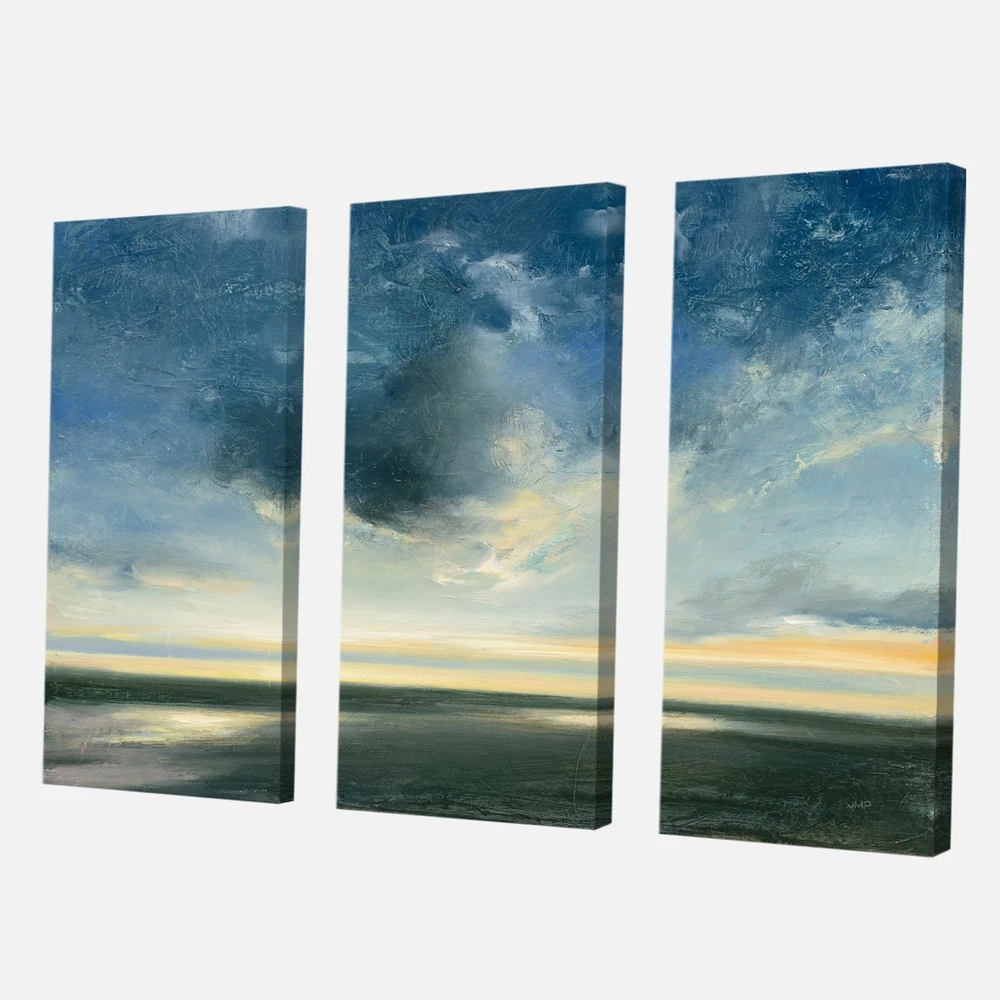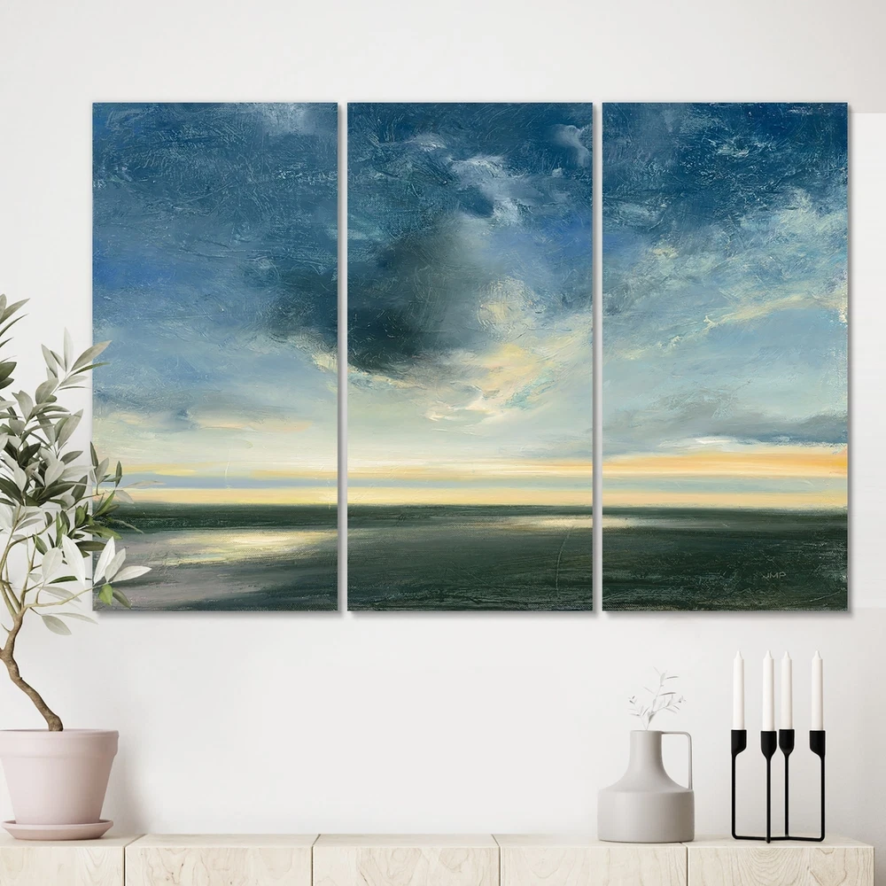 This beautiful Multipanel Blue Coastal Sunrise Canvas Art is printed using the highest quality fade resistant ink on canvas. Every one of our fine art giclee canvas prints is printed on premium quality canvas, using the finest quality inks which will not fade over time. Each giclee print is stretched tightly over a 1 inch wood sub frame for small size prints ensuring the canvas is taught and does not buckle.The canvas art print is gallery-wrapped (the design continues on the sides) , giving it a real art gallery feel. All of our canvas prints are carefully packaged with corner protection, fragile labeling and sturdy boxes to ensure a safe delivery. Every canvas print arrives ready to hang on the wall, with the hanging kits included.Features:- Style : Traditional, Nautical & Coastal- Free Shipping Over $49.99* Details Designart "Blue Coastal Sunrise" Landscape & Nature Gallery-wrapped Canvas Product Description: This beautiful Multipanel Blue Coastal Sunrise Canvas Art is printed using the highest quality fade resistant ink on canvas. Every one of our fine art giclee canvas prints is printed on premium quality canvas, using the finest quality inks which will not fade over time. Each giclee print is stretched tightly over a 1 inch wood sub frame for small size prints ensuring the canvas is taught and does not buckle. The canvas art print is gallery-wrapped (the design continues on the sides) , giving it a real art gallery feel. All of our canvas prints are carefully packaged with corner protection, fragile labeling and sturdy boxes to ensure a safe delivery. Every canvas print arrives ready to hang on the wall, with the hanging kits included. Features: - Style Traditional, Nautical & Coastal - Subject Landscapes, Beach - Color Blue - Available in sizes 36 in. x 28 in. (3 panels of 12 in. x 28 in.) 48 in. x 32 in. (3 panles of 16 in. x 32 in.) 60 in. x 40 in. (3 panels of 20 in. x 40 in.) - Premium quality cotton canvas. - Arrives ready to hang on the wall - Easy to Hang