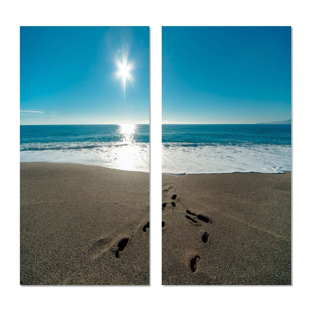 This beautiful Nautical & Coastal 2 piece set of Canvas Art is printed using the highest quality fade-resistant ink on canvas. Every one of our fine art giclee canvas prints is printed on premium quality cotton canvas, using the finest quality inks which will not fade over time. Each giclee print is stretched tightly over a 1-inch wood sub frame ensuring the canvas is taught and does not buckle. This canvas art print is gallery-wrapped (the design continues on the sides), giving it a real art gallery feel. All of our canvas prints are carefully packaged with plastic protection, fragile labeling, and sturdy boxes to ensure safe delivery. Every canvas print arrives ready to hang on the wall, with the hanging kits included.- Style : Nautical & Coastal- Subject : Beach, Landscapes- Color : Free Shipping Over $49.99* Details Designart "Blue Sea and Footprints in Sand" Seascape Canvas Wall Art Print 2 Product Description: This beautiful Nautical & Coastal 2 piece set of Canvas Art is printed using the highest quality fade-resistant ink on canvas. Every one of our fine art giclee canvas prints is printed on premium quality cotton canvas, using the finest quality inks which will not fade over time. Each giclee print is stretched tightly over a 1-inch wood sub frame ensuring the canvas is taught and does not buckle. This canvas art print is gallery-wrapped (the design continues on the sides), giving it a real art gallery feel. All of our canvas prints are carefully packaged with plastic protection, fragile labeling, and sturdy boxes to ensure safe delivery. Every canvas print arrives ready to hang on the wall, with the hanging kits included. - Style Nautical & Coastal - Subject Beach, Landscapes - Color Blue - This canvas giclee print is gallery-wrapped (the design continues on the sides), giving it a real art gallery feel. - Premium quality cotton canvas. - Arrives ready to hang on the wall - Easy to Hang