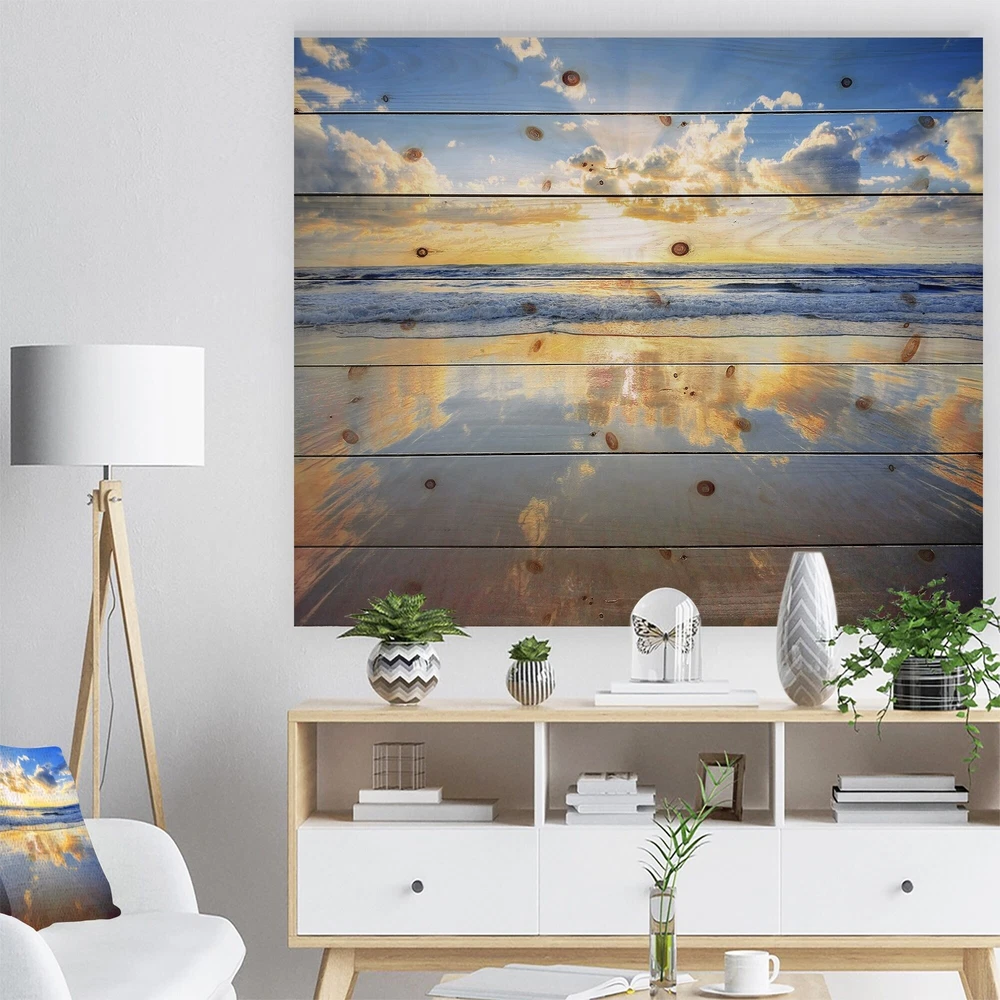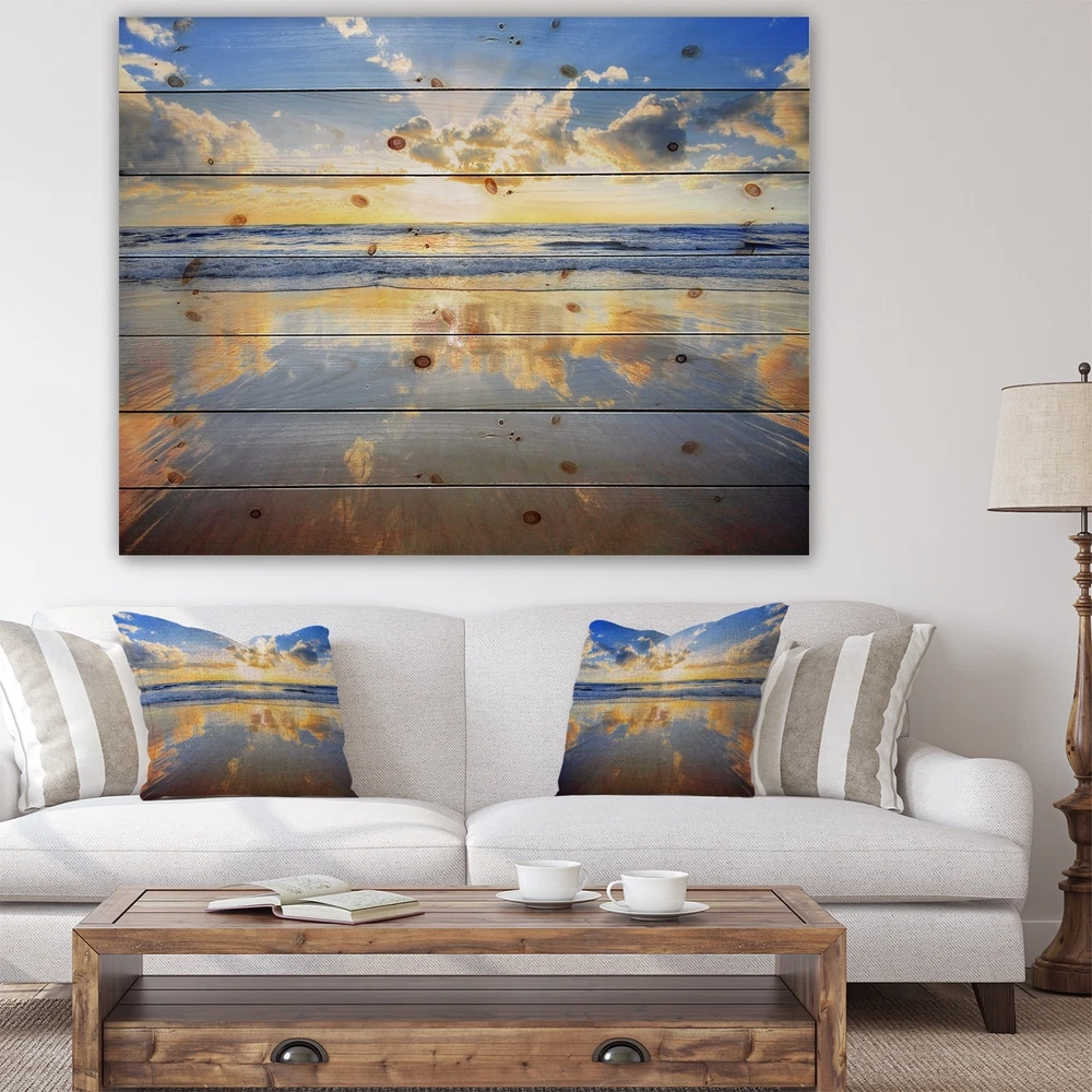 Alas, a modern take on wood wall art. Once typically a wall art piece found only in rustic or farmhouse style decor settings, this Sea & Shore wood wall art will easily fit into even the most contemporary of designs.Using the highest quality 6 Color Canon UV Ink, this Nautical & Coastal wood wall art incorporates several aspects of fine design into one stunning piece. With its slightly visible wood grain appearing through the colors and sleekly finished edges, it is a wonderful choice for any room in your home or office, being it a traditional or modern space. As each piece of wood has natural grain differences from the next, each of these wood wall arts is a truly unique addition to your space.Each Wood wall art is 100% handmade in Canada on Natural pine wood, using the highest quality Free Shipping Over $49.99* Details Designart 'Blue Sky and Clouds Mirrored in Sea' Seashore Print on Natural Pine Product Description: Alas, a modern take on wood wall art. Once typically a wall art piece found only in rustic or farmhouse style decor settings, this Sea & Shore wood wall art will easily fit into even the most contemporary of designs. Using the highest quality 6 Color Canon UV Ink, this Nautical & Coastal wood wall art incorporates several aspects of fine design into one stunning piece. With its slightly visible wood grain appearing through the colors and sleekly finished edges, it is a wonderful choice for any room in your home or office, being it a traditional or modern space. As each piece of wood has natural grain differences from the next, each of these wood wall arts is a truly unique addition to your space. Each Wood wall art is 100% handmade in Canada on Natural pine wood, using the highest quality ink which will not fade over time. Available in 3 Differents sizes 20x15, 40x30, 46x36 - OrientationHorizontal - SubjectSea & Shore TypeWood Wall Art, Fine Art, Wood Fine Art, Print on Plaque - Arrives ready to hang on the wall with hanging kit included - MaterialMade with 100% natural pine wood - StyleNautical & Coastal- Number of Pieces1 - SizeMedium, Large, Small - ColorBlue