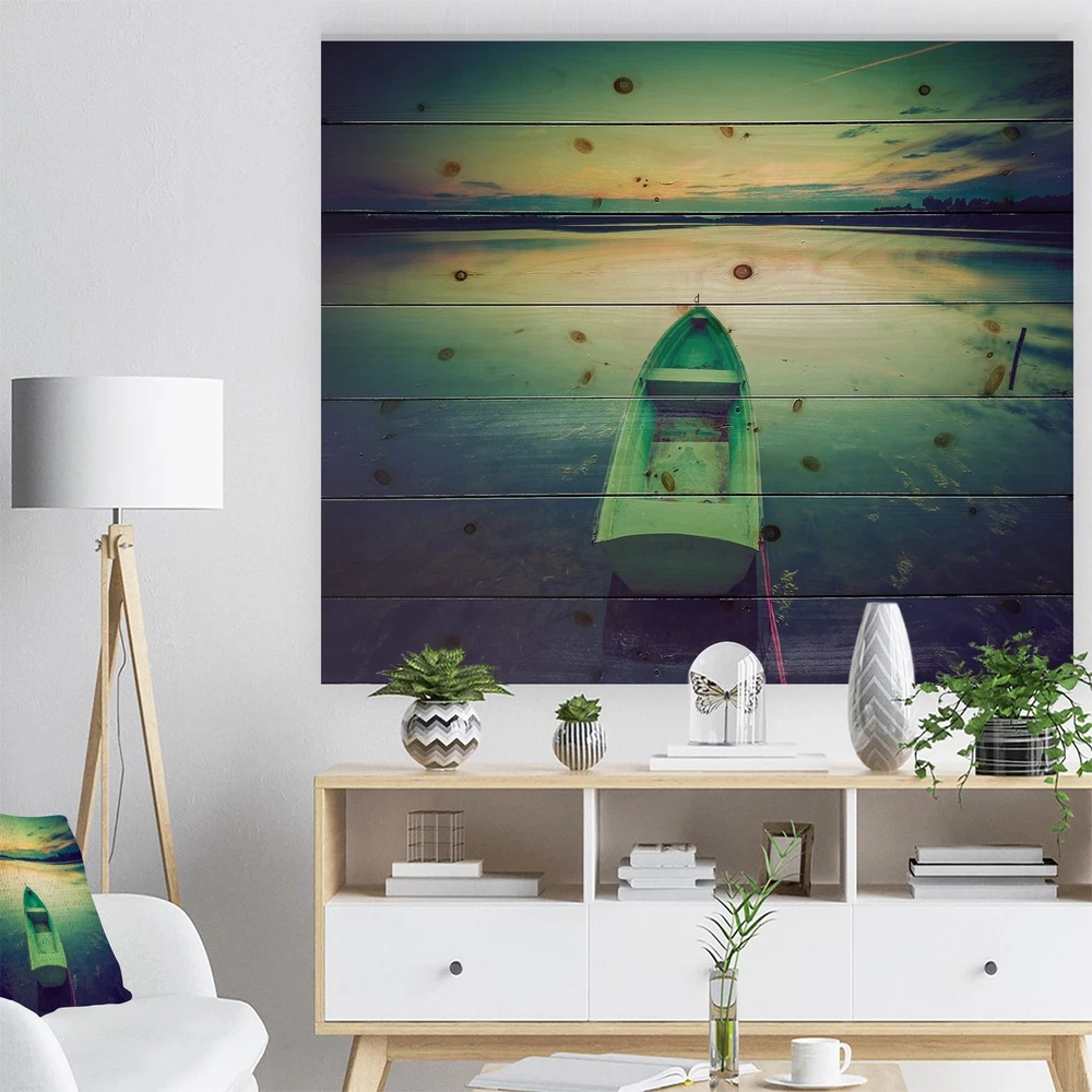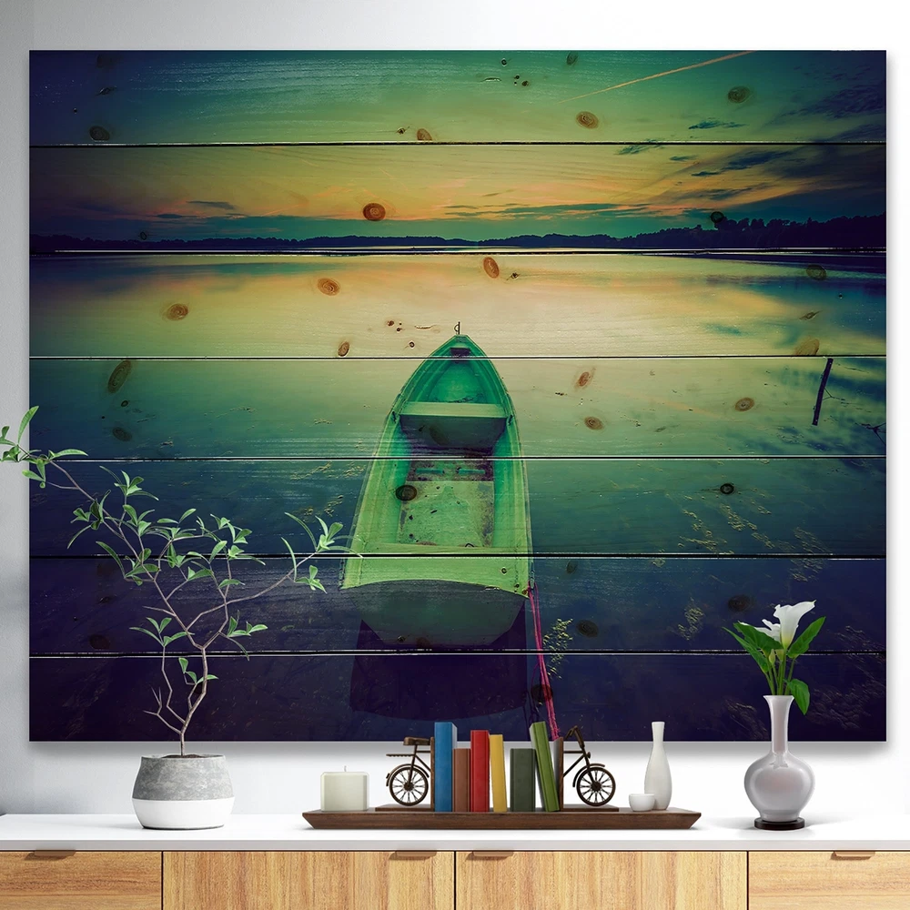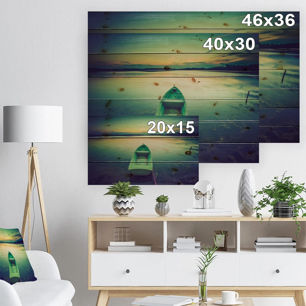 Alas, a modern take on wood wall art. Once typically a wall art piece found only in rustic or farmhouse style decor settings, this Landscapes wood wall art will easily fit into even the most contemporary of designs.Using the highest quality 6 Color Canon UV Ink, this Lake House wood wall art incorporates several aspects of fine design into one stunning piece. With its slightly visible wood grain appearing through the colors and sleekly finished edges, it is a wonderful choice for any room in your home or office, being it a traditional or modern space. As each piece of wood has natural grain differences from the next, each of these wood wall arts is a truly unique addition to your space.Each Wood wall art is 100% handmade in Canada on Natural pine wood, using the highest quality ink which Free Shipping Over $49.99* Details Designart 'Boat at Sunset in Vintage Lake' Boat Print on Natural Pine Wood - Product Description: Alas, a modern take on wood wall art. Once typically a wall art piece found only in rustic or farmhouse style decor settings, this Landscapes wood wall art will easily fit into even the most contemporary of designs. Using the highest quality 6 Color Canon UV Ink, this Lake House wood wall art incorporates several aspects of fine design into one stunning piece. With its slightly visible wood grain appearing through the colors and sleekly finished edges, it is a wonderful choice for any room in your home or office, being it a traditional or modern space. As each piece of wood has natural grain differences from the next, each of these wood wall arts is a truly unique addition to your space. Each Wood wall art is 100% handmade in Canada on Natural pine wood, using the highest quality ink which will not fade over time. Available in 3 Differents sizes 20x15, 40x30, 46x36 - OrientationHorizontal - SubjectLandscapes TypeWood Wall Art, Fine Art, Wood Fine Art, Print on Plaque - Arrives ready to hang on the wall with hanging kit included - MaterialMade with 100% natural pine wood - StyleLake House- Number of Pieces1 - SizeMedium, Large, Small - ColorMulti-Color