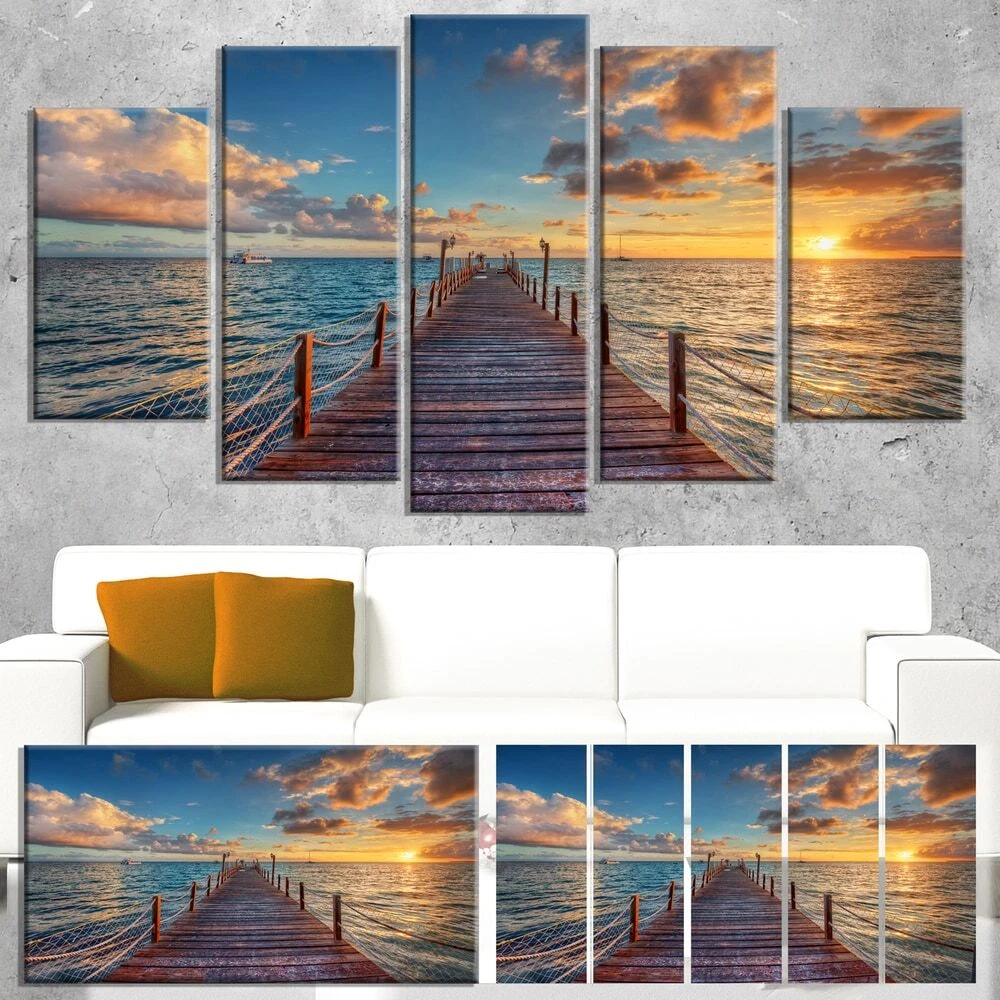 Transport yourself to the beach and consider the horizon at any time with this 'Brilliant Sunrise Over Sea Pier' wall art. Resembling fine art photography, this series of panels are actually high-grad ink applied to durable canvas. The canvas is stretched taut over a wood sub-frame and gallery-wrapped for immediate display.Shape: RectangleOrientation: HorizontalSubject: Photography, Architecture, CityscapesStyle: Contemporary, Fine Art Giclee, ModernSize: Oversized Free Shipping Over $49.99* Details Designart "Brilliant Sunrise over Sea Pier" Modern Bridge 60 in. wide x 32 in. Product Description: Transport yourself to the beach and consider the horizon at any time with this 'Brilliant Sunrise Over Sea Pier' wall art. Resembling fine art photography, this series of panels are actually high-grad ink applied to durable canvas. The canvas is stretched taut over a wood sub-frame and gallery-wrapped for immediate display. ShapeRectangle OrientationHorizontal SubjectPhotography, Architecture, Cityscapes StyleContemporary, Fine Art Giclee, Modern SizeOversized