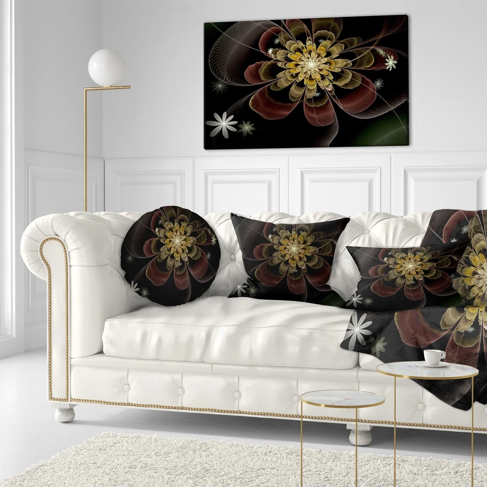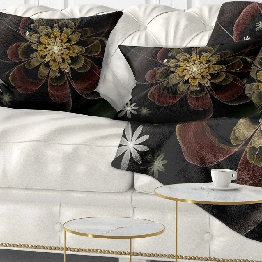 Decorative Throw Pillows for Couch Bed Sofa with Zip CoversAn easy, fun way to add a pop of color or bring new life to any room in your home or office is with these beautiful Floral throw pillows. Dress up your bed, sofa or lounger with this decorative design art pillows. Perfect as Farmhouse bedroom décor, lounge décor Traditional living room décor. It adds a fun accent to any room. Throw pillows really do work wonders: they can transform any room from uninviting discomfort to warm and welcoming. And they really do go almost anywhere - arrange a couple on the couch or sofa, place one in your overstuffed chair for extra coziness, toss a couple on the bed and prop yourself up for a great read.These Floral pillow is printed using High Color Density Italian inks to create a vibrantly colored, Free Shipping Over $49.99* Details Designart 'Brown Fractal Flower with Silver stars' Floral Throw Pillow Product Description: Decorative Throw Pillows for Couch Bed Sofa with Zip Covers An easy, fun way to add a pop of color or bring new life to any room in your home or office is with these beautiful Floral throw pillows. Dress up your bed, sofa or lounger with this decorative design art pillows. Perfect as Farmhouse bedroom décor, lounge décor Traditional living room décor. It adds a fun accent to any room. Throw pillows really do work wondersthey can transform any room from uninviting discomfort to warm and welcoming. And they really do go almost anywhere - arrange a couple on the couch or sofa, place one in your overstuffed chair for extra coziness, toss a couple on the bed and prop yourself up for a great read. These Floral pillow is printed using High Color Density Italian inks to create a vibrantly colored, sharp artwork. Features: Perfect accent to any furniture piece Basic shapes with a modern graphic design twist Printed on 100% light weight polyester Cushion filled with 100% polyester fill Wrinkle resistant fabric Zip Closure so you can remove the pillow from its' cover Down-like comfort - Odorless 100% Hypoallergenic Machine Wash Cold Separately, Gently Cycle Only, No bleach, hang to dry Print on Demand with High Density Italian Ink Available in Several sizes Attribute :Farmhouse, Traditional, Modern Subject Floral, Landscapes, Country Charm