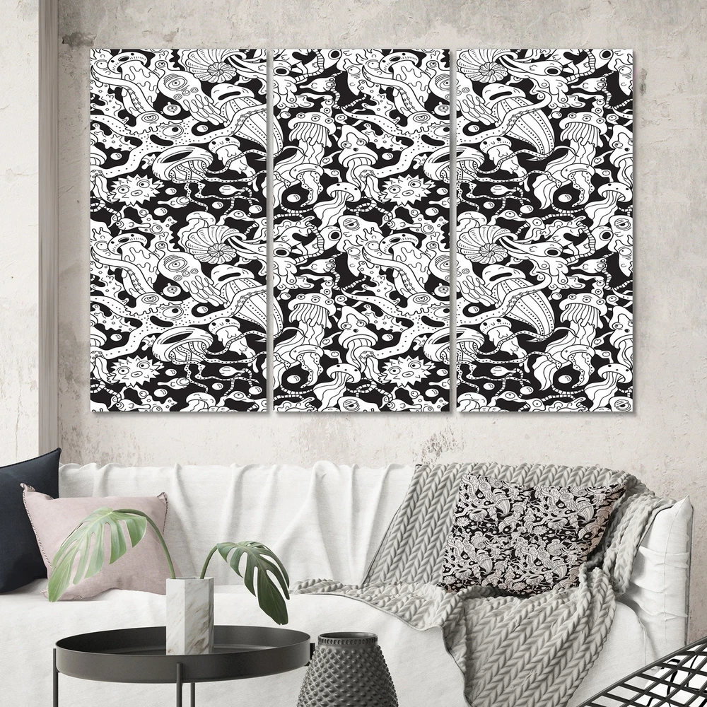 This beautiful Deep Sea Monsters In Black And White Multipanels canvas art is printed using the highest quality fade-resistant ink on canvas. Every one of our fine art giclee canvas prints is printed on premium quality cotton canvas, using the finest quality inks which will not fade over time. Each giclee print is stretched tightly over a 1-inch wood subframe ensuring the canvas is taught and does not buckle. This canvas art print is gallery-wrapped (the design continues on the sides), giving it a real art gallery feel. All of our canvas prints are carefully packaged with plastic protection, fragile labeling, and sturdy boxes to ensure safe delivery. Every canvas print arrives ready to hang on the wall, with the hanging kits included.- Style : Patterned- Subject : Animals, Abstract- Color Free Shipping Over $49.99* Details Designart "Deep Sea Monsters In Black And White" Patterned Canvas Wall Art Print Product Description: This beautiful Deep Sea Monsters In Black And White Multipanels canvas art is printed using the highest quality fade-resistant ink on canvas. Every one of our fine art giclee canvas prints is printed on premium quality cotton canvas, using the finest quality inks which will not fade over time. Each giclee print is stretched tightly over a 1-inch wood subframe ensuring the canvas is taught and does not buckle. This canvas art print is gallery-wrapped (the design continues on the sides), giving it a real art gallery feel. All of our canvas prints are carefully packaged with plastic protection, fragile labeling, and sturdy boxes to ensure safe delivery. Every canvas print arrives ready to hang on the wall, with the hanging kits included. - Style Patterned - Subject Animals, Abstract - Color Black - This canvas giclee print is gallery-wrapped (the design continues on the sides) , giving it a real art gallery feel. - Premium quality cotton canvas. - Arrives ready to hang on the wall - Easy to Hang
