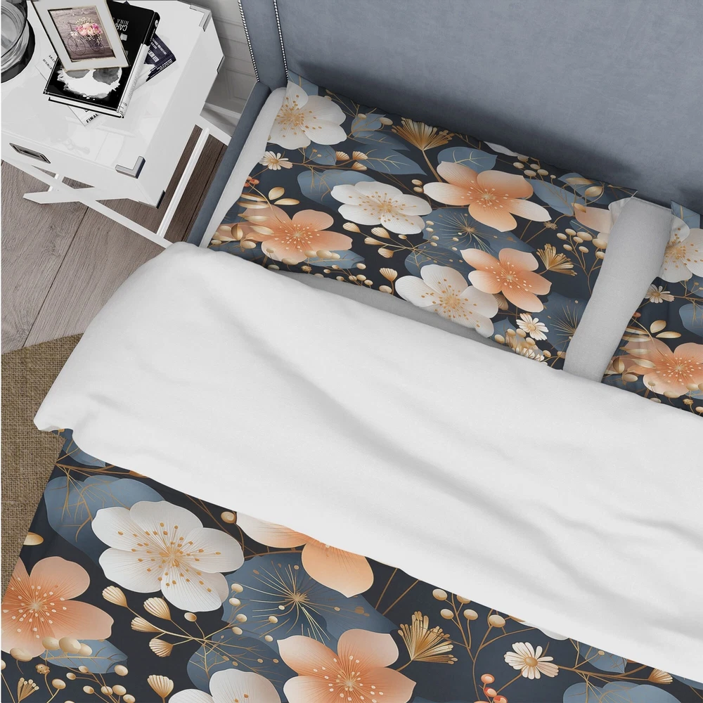 There is just nothing better than a beautiful, inviting comfortable bed after a long day. This Floral bed set is created using the richest colors stemming from high density Italian ink and the softest fabrics making it the perfect way to spruce up your bedroom, while keeping it ultra-comfortable. This luxurious Divine Dreams Floral Pattern III bed design is made with 100% microfiber polyester, making it ultra-soft to ensure you sleep comfortably all night long. This Cottage set includes 1 Bed Cover and 2 Shams and is available in twin, queen and king sizes.This Bedding Set is easily integrated into your already decorated space.What's Included? - Duvet Cover - Shams - Pillow Cases not included but can be buy separately - Comforter Insert NOT INCLUDEDFeatures - Printed Free Shipping Over $49.99* Details Designart "Divine Dreams Floral Pattern III" Green Cottage Bedding Set With Product Description: There is just nothing better than a beautiful, inviting comfortable bed after a long day. This Floral bed set is created using the richest colors stemming from high density Italian ink and the softest fabrics making it the perfect way to spruce up your bedroom, while keeping it ultra-comfortable. This luxurious Divine Dreams Floral Pattern III bed design is made with 100% microfiber polyester, making it ultra-soft to ensure you sleep comfortably all night long. This Cottage set includes 1 Bed Cover and 2 Shams and is available in twin, queen and king sizes. This Bedding Set is easily integrated into your already decorated space. What's Included? - Duvet Cover - Shams - Pillow Cases not included but can be buy separately - Comforter Insert NOT INCLUDED Features - Printed using High Density Italian Ink making the colors extra vibrant. - Made from ultra-soft, lightweight 100% microfiber polyester. Wrinkle resistant fabric. Down-like comfort, odorless. - The Cottage bed set includes one bed cover and two standard pillow shams to create a complete and stylish look. - The elegant and soft colors are both trendy and fun to brighten and update your bedroom. - Made in Canada - Decorative Wall Art and throw pillows to match this set are available but sold separately. - Actual comforter inserts and pillow inserts are not included. This set includes the two pillow shams and comforter cover only. King Dimensions: - 1 Duvet Cover104 inches wide x 88 inches long - 2 King Shams20 inches wide x 36 inches long Queen Dimensions: - 1 Duvet Cover88 inches wide x 88 inches long - 2 Standard Shams16 inches wide x 26 inches long Twin Dimensions: - 1 Duvet Cover68 inches wide x 88 inches long - 1 Standard Sham16 inches wide x 26 inches long Product Details - MaterialPolyester. - PatternFloral - ColorPeach; Green - StyleCottage; traditional - ReversibleNo Directions: Fabric Care InstructionsMachine wash on cold gentle cycle. Wash separately on first wash. Use only non- chlorine bleach when needed. Tumble dry low. Remove promptly.