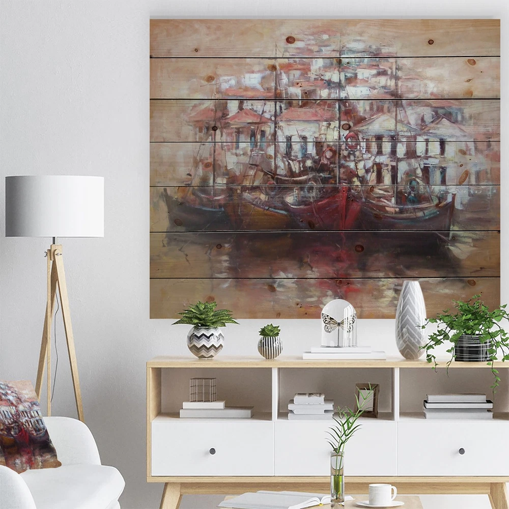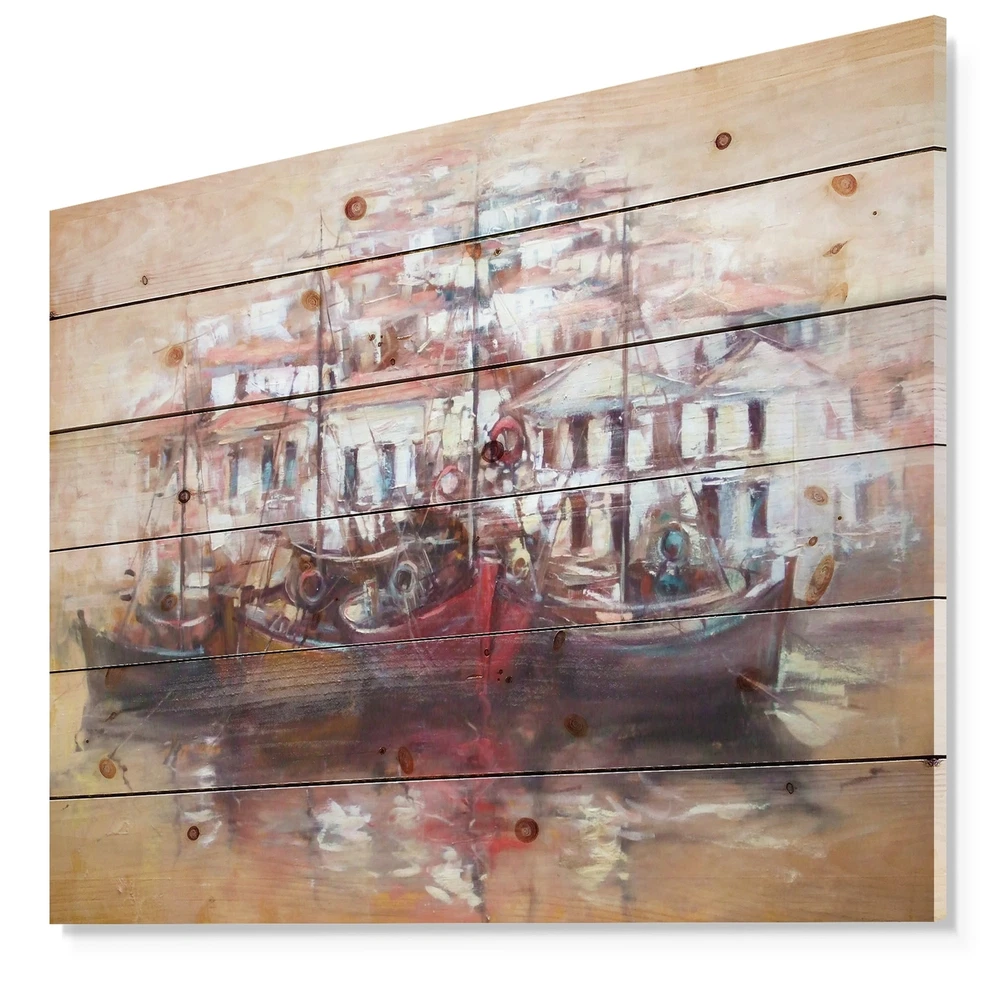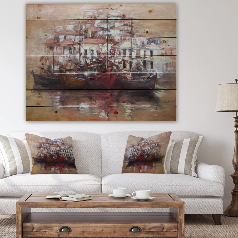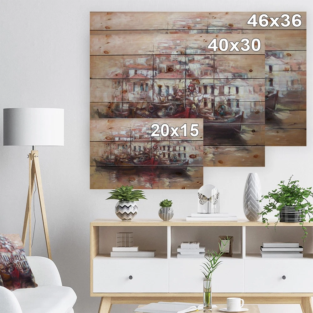 Alas, a modern take on wood wall art. Once typically a wall art piece found only in rustic or farmhouse style decor settings, this Sea & Shore wood wall art will easily fit into even the most contemporary of designs.Using the highest quality 6 Color Canon UV Ink, this Nautical & Coastal wood wall art incorporates several aspects of fine design into one stunning piece. With its slightly visible wood grain appearing through the colors and sleekly finished edges, it is a wonderful choice for any room in your home or office, being it a traditional or modern space. As each piece of wood has natural grain differences from the next, each of these wood wall arts is a truly unique addition to your space.Each Wood wall art is 100% handmade in Canada on Natural pine wood, using the highest quality Free Shipping Over $49.99* Details Designart 'Four Boats At Pier Near Village' Sea & Shore Print on Natural Pine Product Description: Alas, a modern take on wood wall art. Once typically a wall art piece found only in rustic or farmhouse style decor settings, this Sea & Shore wood wall art will easily fit into even the most contemporary of designs. Using the highest quality 6 Color Canon UV Ink, this Nautical & Coastal wood wall art incorporates several aspects of fine design into one stunning piece. With its slightly visible wood grain appearing through the colors and sleekly finished edges, it is a wonderful choice for any room in your home or office, being it a traditional or modern space. As each piece of wood has natural grain differences from the next, each of these wood wall arts is a truly unique addition to your space. Each Wood wall art is 100% handmade in Canada on Natural pine wood, using the highest quality ink which will not fade over time. Available in 3 Differents sizes 20x15, 40x30, 46x36 - OrientationHorizontal - SubjectSea & Shore TypeWood Wall Art, Fine Art, Wood Fine Art, Print on Plaque - Arrives ready to hang on the wall with hanging kit included - MaterialMade with 100% natural pine wood - StyleNautical & Coastal- Number of Pieces1 - SizeMedium, Large, Small - ColorBrown