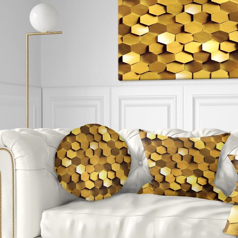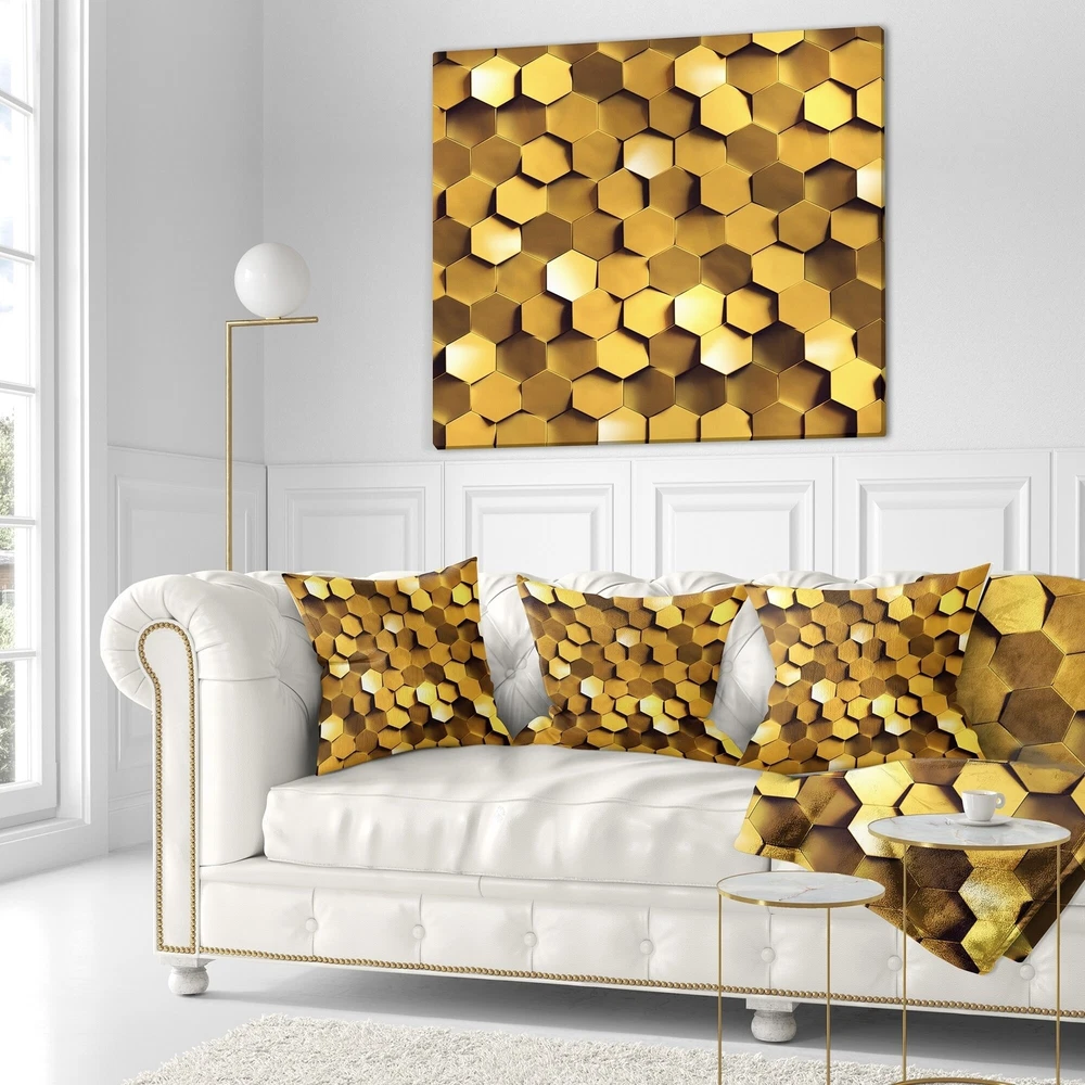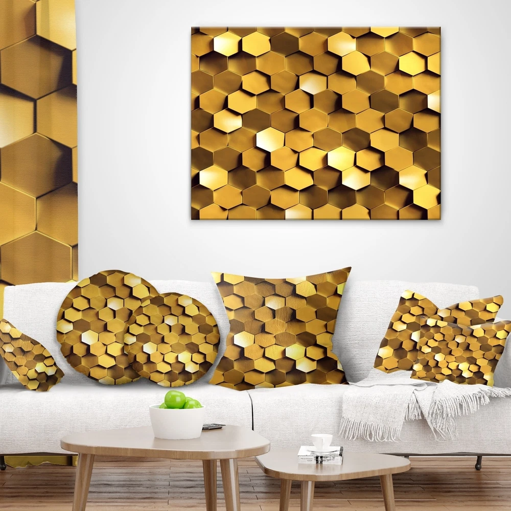 Decorative Throw Pillows for Couch Bed Sofa with Zip CoversAn easy, fun way to add a pop of color or bring new life to any room in your home or office is with these beautiful Abstract throw pillows. Dress up your bed, sofa or lounger with this decorative design art pillows. Perfect as Contemporary bedroom décor, lounge décor Modern living room décor. It adds a fun accent to any room. Throw pillows really do work wonders: they can transform any room from uninviting discomfort to warm and welcoming. And they really do go almost anywhere - arrange a couple on the couch or sofa, place one in your overstuffed chair for extra coziness, toss a couple on the bed and prop yourself up for a great read.These Abstract pillow is printed using High Color Density Italian inks to create a vibrantly Free Shipping Over $49.99* Details Designart 'Golden Honeycomb Wall Texture' Abstract Throw Pillow Product Description: Decorative Throw Pillows for Couch Bed Sofa with Zip Covers An easy, fun way to add a pop of color or bring new life to any room in your home or office is with these beautiful Abstract throw pillows. Dress up your bed, sofa or lounger with this decorative design art pillows. Perfect as Contemporary bedroom décor, lounge décor Modern living room décor. It adds a fun accent to any room. Throw pillows really do work wondersthey can transform any room from uninviting discomfort to warm and welcoming. And they really do go almost anywhere - arrange a couple on the couch or sofa, place one in your overstuffed chair for extra coziness, toss a couple on the bed and prop yourself up for a great read. These Abstract pillow is printed using High Color Density Italian inks to create a vibrantly colored, sharp artwork. Features: Perfect accent to any furniture piece Basic shapes with a modern graphic design twist Printed on 100% light weight polyester Cushion filled with 100% polyester fill Wrinkle resistant fabric Zip Closure so you can remove the pillow from its' cover Down-like comfort - Odorless 100% Hypoallergenic Machine Wash Cold Separately, Gently Cycle Only, No bleach, hang to dry Print on Demand with High Density Italian Ink Available in Several sizes Attribute :Contemporary, Modern, Transitional Subject Abstract, Impressionism, Geometric
