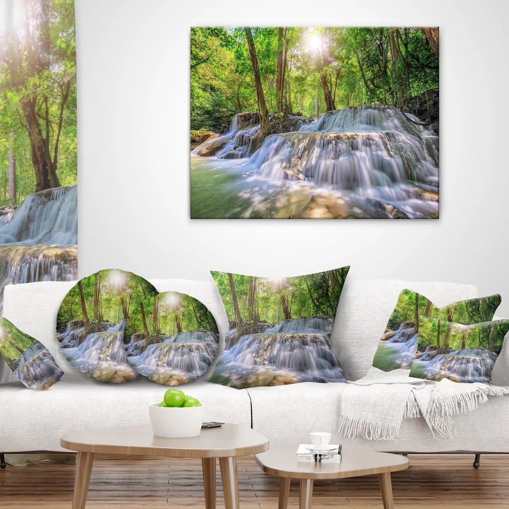 Decorative Throw Pillows for Couch Bed Sofa with Zip CoversAn easy, fun way to add a pop of color or bring new life to any room in your home or office is with these beautiful Landscape throw pillows. Dress up your bed, sofa or lounger with this decorative design art pillows. Perfect as Farmhouse bedroom décor, lounge décor Traditional living room décor. It adds a fun accent to any room. Throw pillows really do work wonders: they can transform any room from uninviting discomfort to warm and welcoming. And they really do go almost anywhere - arrange a couple on the couch or sofa, place one in your overstuffed chair for extra coziness, toss a couple on the bed and prop yourself up for a great read.These Landscapes pillow is printed using High Color Density Italian inks to create a vibrantly Free Shipping Over $49.99* Details Designart 'Kanchanaburi Waterfall' Photography Throw Pillow Product Description: Decorative Throw Pillows for Couch Bed Sofa with Zip Covers An easy, fun way to add a pop of color or bring new life to any room in your home or office is with these beautiful Landscape throw pillows. Dress up your bed, sofa or lounger with this decorative design art pillows. Perfect as Farmhouse bedroom décor, lounge décor Traditional living room décor. It adds a fun accent to any room. Throw pillows really do work wondersthey can transform any room from uninviting discomfort to warm and welcoming. And they really do go almost anywhere - arrange a couple on the couch or sofa, place one in your overstuffed chair for extra coziness, toss a couple on the bed and prop yourself up for a great read. These Landscapes pillow is printed using High Color Density Italian inks to create a vibrantly colored, sharp artwork. Features: Perfect accent to any furniture piece Basic shapes with a modern graphic design twist Printed on 100% light weight polyester Cushion filled with 100% polyester fill Wrinkle resistant fabric Zip Closure so you can remove the pillow from its' cover Down-like comfort - Odorless 100% Hypoallergenic Machine Wash Cold Separately, Gently Cycle Only, No bleach, hang to dry Print on Demand with High Density Italian Ink Available in Several sizes Attribute :Farmhouse, Traditional, Fine Art Giclee Subject Landscapes, Country Charrm, photography