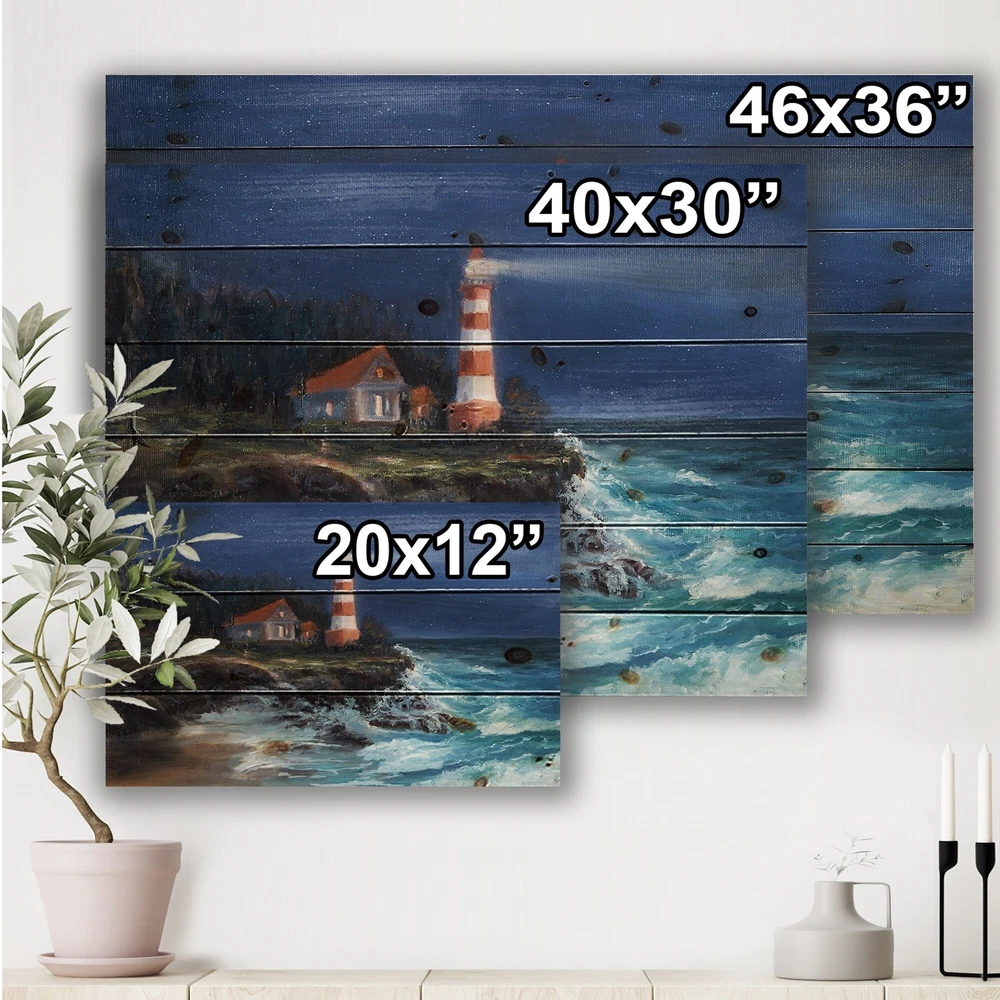 Alas, a modern take on wood wall art. Once typically a wall art piece found only in rustic or farmhouse style decor settings, this Beach wood wall art will easily fit into even the most contemporary of designs.Using the highest quality 6 Color Canon UV Ink, this Nautical & Coastal wood wall art incorporates several aspects of fine design into one stunning piece. With its slightly visible wood grain appearing through the colors and sleekly finished edges, it is a wonderful choice for any room in your home or office, being it a traditional or modern space. As each piece of wood has natural grain differences from the next, each of these wood wall arts is a truly unique addition to your space.Each Wood wall art is 100% handmade in Canada on Natural pine wood, using the highest quality ink Free Shipping Over $49.99* Details Designart 'Lighthouse Shining Over Ocean At Night' Nautical & Coastal Print on Product Description: Alas, a modern take on wood wall art. Once typically a wall art piece found only in rustic or farmhouse style decor settings, this Beach wood wall art will easily fit into even the most contemporary of designs. Using the highest quality 6 Color Canon UV Ink, this Nautical & Coastal wood wall art incorporates several aspects of fine design into one stunning piece. With its slightly visible wood grain appearing through the colors and sleekly finished edges, it is a wonderful choice for any room in your home or office, being it a traditional or modern space. As each piece of wood has natural grain differences from the next, each of these wood wall arts is a truly unique addition to your space. Each Wood wall art is 100% handmade in Canada on Natural pine wood, using the highest quality ink which will not fade over time. Available in Differents sizes - OrientationHorizontal - SubjectBeach TypeWood Wall Art, Fine Art, Wood Fine Art, Print on Plaque - Arrives ready to hang on the wall with hanging kit included - MaterialMade with 100% natural pine wood - StyleNautical & Coastal - Number of Pieces1 - ColorBlue