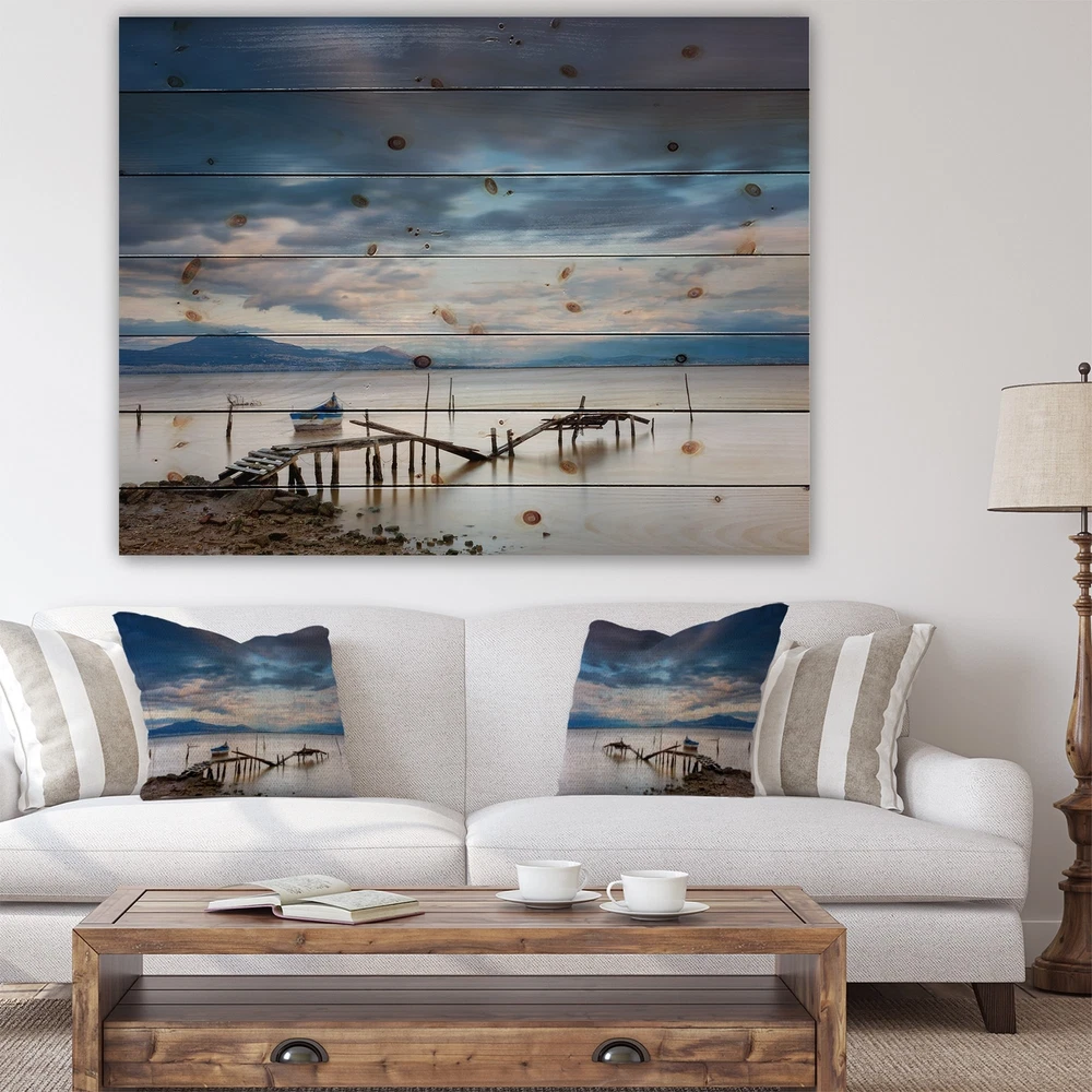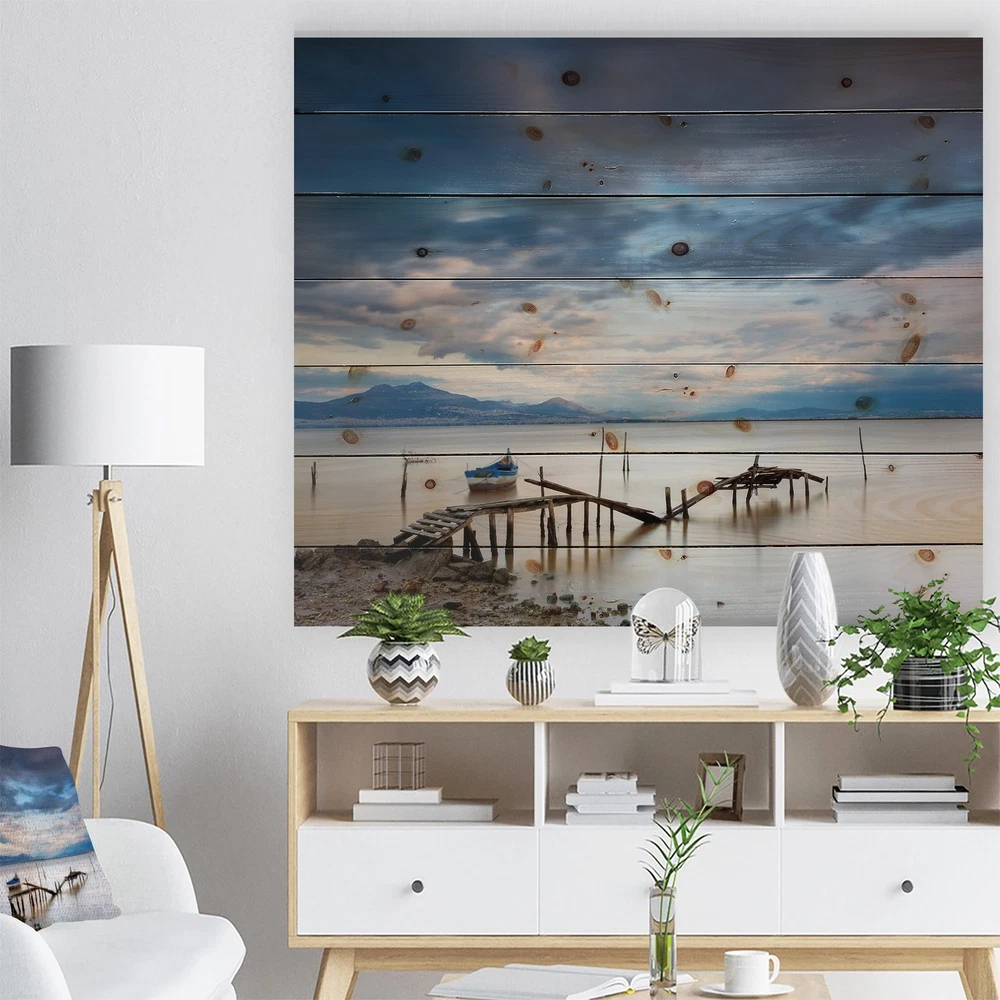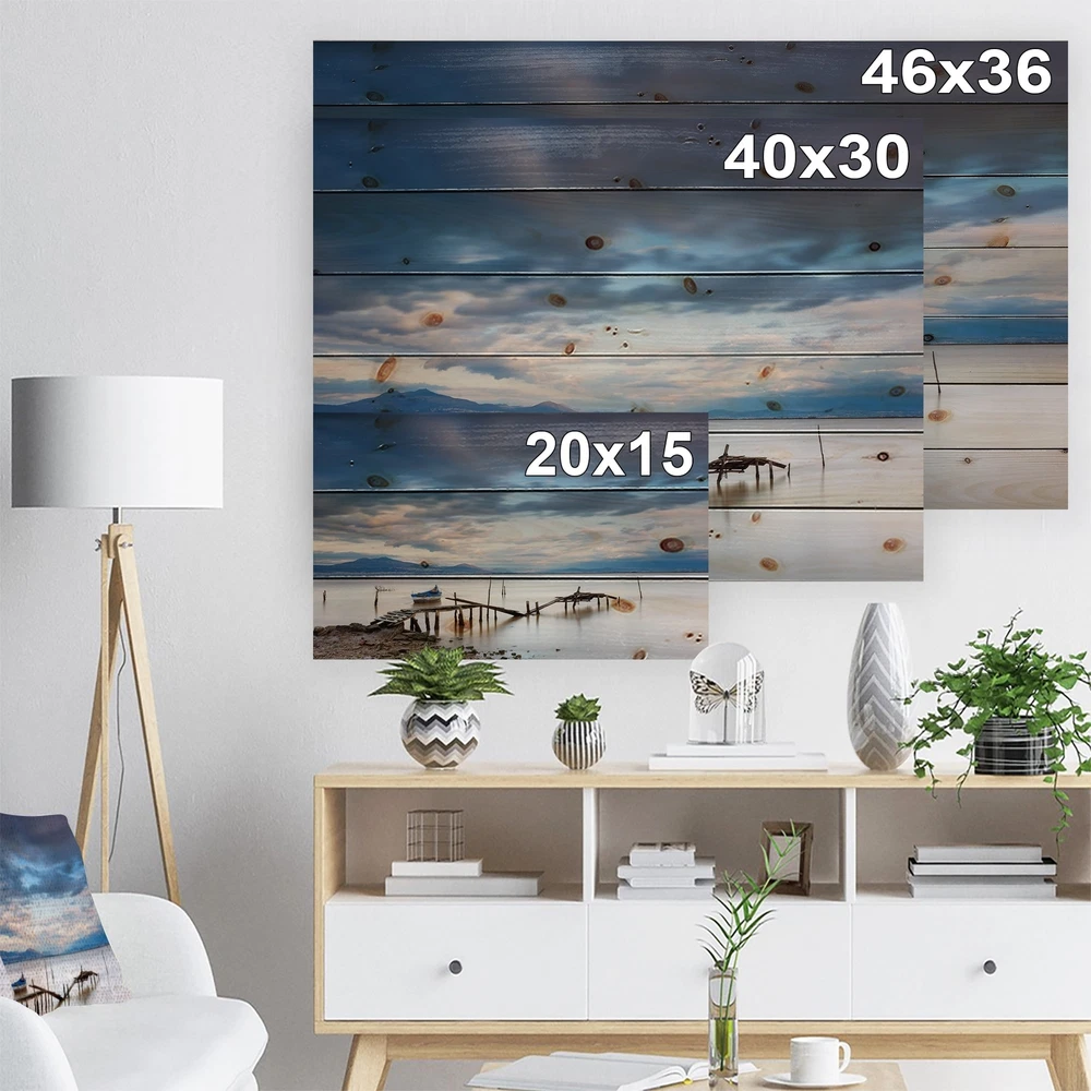 Alas, a modern take on wood wall art. Once typically a wall art piece found only in rustic or farmhouse style decor settings, this Sea & Shore wood wall art will easily fit into even the most contemporary of designs.Using the highest quality 6 Color Canon UV Ink, this Nautical & Coastal wood wall art incorporates several aspects of fine design into one stunning piece. With its slightly visible wood grain appearing through the colors and sleekly finished edges, it is a wonderful choice for any room in your home or office, being it a traditional or modern space. As each piece of wood has natural grain differences from the next, each of these wood wall arts is a truly unique addition to your space.Each Wood wall art is 100% handmade in Canada on Natural pine wood, using the highest quality Free Shipping Over $49.99* Details Designart 'Magic Sunrise and Wooden Pier' Landscapes Sea & Shore Print on Product Description: Alas, a modern take on wood wall art. Once typically a wall art piece found only in rustic or farmhouse style decor settings, this Sea & Shore wood wall art will easily fit into even the most contemporary of designs. Using the highest quality 6 Color Canon UV Ink, this Nautical & Coastal wood wall art incorporates several aspects of fine design into one stunning piece. With its slightly visible wood grain appearing through the colors and sleekly finished edges, it is a wonderful choice for any room in your home or office, being it a traditional or modern space. As each piece of wood has natural grain differences from the next, each of these wood wall arts is a truly unique addition to your space. Each Wood wall art is 100% handmade in Canada on Natural pine wood, using the highest quality ink which will not fade over time. Available in 3 Differents sizes 20x15, 40x30, 46x36 - OrientationHorizontal - SubjectSea & Shore TypeWood Wall Art, Fine Art, Wood Fine Art, Print on Plaque - Arrives ready to hang on the wall with hanging kit included - MaterialMade with 100% natural pine wood - StyleNautical & Coastal- Number of Pieces1 - SizeMedium, Large, Small - ColorBlue