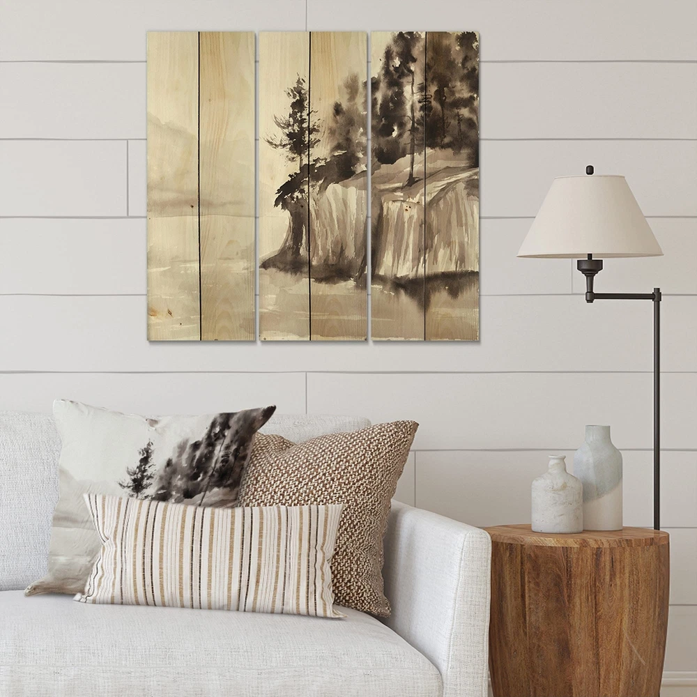 Alas, a modern take on wood wall art. Once typically a wall art piece found only in rustic or farmhouse style decor settings, this Landscapes wood wall art will easily fit into even the most contemporary of designs.Using the highest quality 6 Color Canon UV Ink, this Nautical & Coastal wood wall art incorporates several aspects of fine design into one stunning piece. With its slightly visible wood grain appearing through the colors and sleekly finished edges, it is a wonderful choice for any room in your home or office, being it a traditional or modern space. As each piece of wood has natural grain differences from the next, each of these wood wall arts is a truly unique addition to your space.Each Wood wall art is 100% handmade in Canada on Natural pine wood, using the highest quality ink Free Shipping Over $49.99* Details Designart 'Monochrome Cliffs By The Lake' Nautical & Coastal Print on Natural Product Description: Alas, a modern take on wood wall art. Once typically a wall art piece found only in rustic or farmhouse style decor settings, this Landscapes wood wall art will easily fit into even the most contemporary of designs. Using the highest quality 6 Color Canon UV Ink, this Nautical & Coastal wood wall art incorporates several aspects of fine design into one stunning piece. With its slightly visible wood grain appearing through the colors and sleekly finished edges, it is a wonderful choice for any room in your home or office, being it a traditional or modern space. As each piece of wood has natural grain differences from the next, each of these wood wall arts is a truly unique addition to your space. Each Wood wall art is 100% handmade in Canada on Natural pine wood, using the highest quality ink which will not fade over time. - OrientationHorizontal - SubjectLandscapes TypeWood Wall Art, Fine Art, Wood Fine Art, Print on Plaque - Arrives ready to hang on the wall with hanging kit included - MaterialMade with 100% natural pine wood - StyleNautical & Coastal - Number of Pieces3 - ColorGrey
