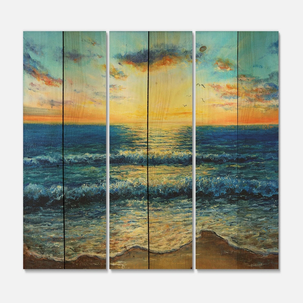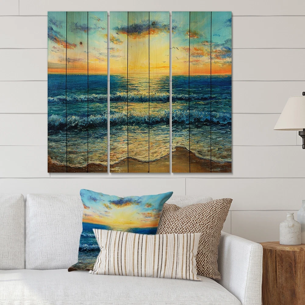Alas, a modern take on wood wall art. Once typically a wall art piece found only in rustic or farmhouse style decor settings, this Beach wood wall art will easily fit into even the most contemporary of designs.Using the highest quality 6 Color Canon UV Ink, this Nautical & Coastal wood wall art incorporates several aspects of fine design into one stunning piece. With its slightly visible wood grain appearing through the colors and sleekly finished edges, it is a wonderful choice for any room in your home or office, being it a traditional or modern space. As each piece of wood has natural grain differences from the next, each of these wood wall arts is a truly unique addition to your space.Each Wood wall art is 100% handmade in Canada on Natural pine wood, using the highest quality ink Free Shipping Over $49.99* Details Designart 'Morning Light On The Ocean Waves I' Nautical & Coastal Print on Product Description: Alas, a modern take on wood wall art. Once typically a wall art piece found only in rustic or farmhouse style decor settings, this Beach wood wall art will easily fit into even the most contemporary of designs. Using the highest quality 6 Color Canon UV Ink, this Nautical & Coastal wood wall art incorporates several aspects of fine design into one stunning piece. With its slightly visible wood grain appearing through the colors and sleekly finished edges, it is a wonderful choice for any room in your home or office, being it a traditional or modern space. As each piece of wood has natural grain differences from the next, each of these wood wall arts is a truly unique addition to your space. Each Wood wall art is 100% handmade in Canada on Natural pine wood, using the highest quality ink which will not fade over time. - OrientationHorizontal - SubjectBeach TypeWood Wall Art, Fine Art, Wood Fine Art, Print on Plaque - Arrives ready to hang on the wall with hanging kit included - MaterialMade with 100% natural pine wood - StyleNautical & Coastal - Number of Pieces3 - ColorBlue
