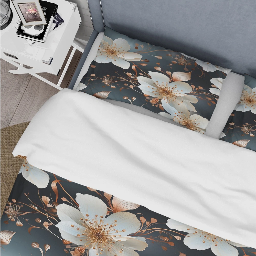 There is just nothing better than a beautiful, inviting comfortable bed after a long day. This Floral bed set is created using the richest colors stemming from high density Italian ink and the softest fabrics making it the perfect way to spruce up your bedroom, while keeping it ultra-comfortable. This luxurious Mystic Aura White And Gold Floral Delight bed design is made with 100% microfiber polyester, making it ultra-soft to ensure you sleep comfortably all night long. This Cottage set includes 1 Bed Cover and 2 Shams and is available in twin, queen and king sizes.This Bedding Set is easily integrated into your already decorated space.What's Included? - Duvet Cover - Shams - Pillow Cases not included but can be buy separately - Comforter Insert NOT INCLUDEDFeatures - Free Shipping Over $49.99* Details Designart "Mystic Aura White And Gold Floral Delight" Gold Cottage Bedding Set Product Description: There is just nothing better than a beautiful, inviting comfortable bed after a long day. This Floral bed set is created using the richest colors stemming from high density Italian ink and the softest fabrics making it the perfect way to spruce up your bedroom, while keeping it ultra-comfortable. This luxurious Mystic Aura White And Gold Floral Delight bed design is made with 100% microfiber polyester, making it ultra-soft to ensure you sleep comfortably all night long. This Cottage set includes 1 Bed Cover and 2 Shams and is available in twin, queen and king sizes. This Bedding Set is easily integrated into your already decorated space. What's Included? - Duvet Cover - Shams - Pillow Cases not included but can be buy separately - Comforter Insert NOT INCLUDED Features - Printed using High Density Italian Ink making the colors extra vibrant. - Made from ultra-soft, lightweight 100% microfiber polyester. Wrinkle resistant fabric. Down-like comfort, odorless. - The Cottage bed set includes one bed cover and two standard pillow shams to create a complete and stylish look. - The elegant and soft colors are both trendy and fun to brighten and update your bedroom. - Made in Canada - Decorative Wall Art and throw pillows to match this set are available but sold separately. - Actual comforter inserts and pillow inserts are not included. This set includes the two pillow shams and comforter cover only. King Dimensions: - 1 Duvet Cover104 inches wide x 88 inches long - 2 King Shams20 inches wide x 36 inches long Queen Dimensions: - 1 Duvet Cover88 inches wide x 88 inches long - 2 Standard Shams16 inches wide x 26 inches long Twin Dimensions: - 1 Duvet Cover68 inches wide x 88 inches long - 1 Standard Sham16 inches wide x 26 inches long Product Details - MaterialPolyester. - PatternFloral - ColorWhite; Gold - StyleCottage; traditional - ReversibleNo Directions: Fabric Care InstructionsMachine wash on cold gentle cycle. Wash separately on first wash. Use only non- chlorine bleach when needed. Tumble dry low. Remove promptly.