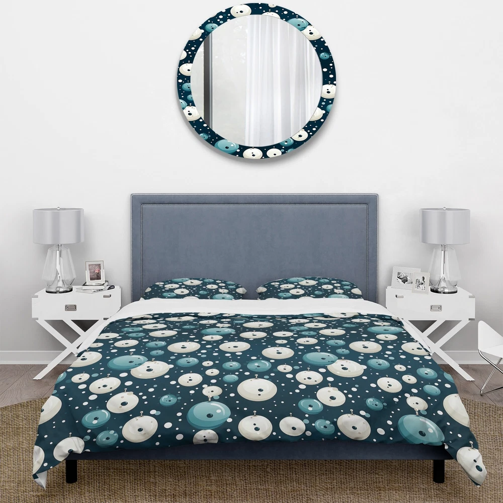 There is just nothing better than a beautiful, inviting comfortable bed after a long day. This Graphic Print, Geometric bed set is created using the richest colors stemming from high density Italian ink and the softest fabrics making it the perfect way to spruce up your bedroom, while keeping it ultra-comfortable. This luxurious Nautical Allure Polka Dots Pattern I bed design is made with 100% microfiber polyester, making it ultra-soft to ensure you sleep comfortably all night long. This Modern & Contemporary set includes 1 Bed Cover and 2 Shams and is available in twin, queen and king sizes.This Bedding Set is easily integrated into your already decorated space.What's Included? - Duvet Cover - Shams - Pillow Cases not included but can be buy separately - Comforter Insert Free Shipping Over $49.99* Details Designart "Nautical Allure Polka Dots Pattern I" Modern Bed Cover Set With 2 Product Description: There is just nothing better than a beautiful, inviting comfortable bed after a long day. This Graphic Print, Geometric bed set is created using the richest colors stemming from high density Italian ink and the softest fabrics making it the perfect way to spruce up your bedroom, while keeping it ultra-comfortable. This luxurious Nautical Allure Polka Dots Pattern I bed design is made with 100% microfiber polyester, making it ultra-soft to ensure you sleep comfortably all night long. This Modern & Contemporary set includes 1 Bed Cover and 2 Shams and is available in twin, queen and king sizes. This Bedding Set is easily integrated into your already decorated space. What's Included? - Duvet Cover - Shams - Pillow Cases not included but can be buy separately - Comforter Insert NOT INCLUDED Features - Printed using High Density Italian Ink making the colors extra vibrant. - Made from ultra-soft, lightweight 100% microfiber polyester. Wrinkle resistant fabric. Down-like comfort, odorless. - The Modern & Contemporary bed set includes one bed cover and two standard pillow shams to create a complete and stylish look. - The elegant and soft colors are both trendy and fun to brighten and update your bedroom. - Made in Canada - Decorative Wall Art and throw pillows to match this set are available but sold separately. - Actual comforter inserts and pillow inserts are not included. This set includes the two pillow shams and comforter cover only. King Dimensions: - 1 Duvet Cover104 inches wide x 88 inches long - 2 King Shams20 inches wide x 36 inches long Queen Dimensions: - 1 Duvet Cover88 inches wide x 88 inches long - 2 Standard Shams16 inches wide x 26 inches long Twin Dimensions: - 1 Duvet Cover68 inches wide x 88 inches long - 1 Standard Sham16 inches wide x 26 inches long Product Details - MaterialPolyester. - PatternPolka Dots - ColorBlue - StyleModern & Contemporary - ReversibleNo Directions: Fabric Care InstructionsMachine wash on cold gentle cycle. Wash separately on first wash. Use only non- chlorine bleach when needed. Tumble dry low. Remove promptly.