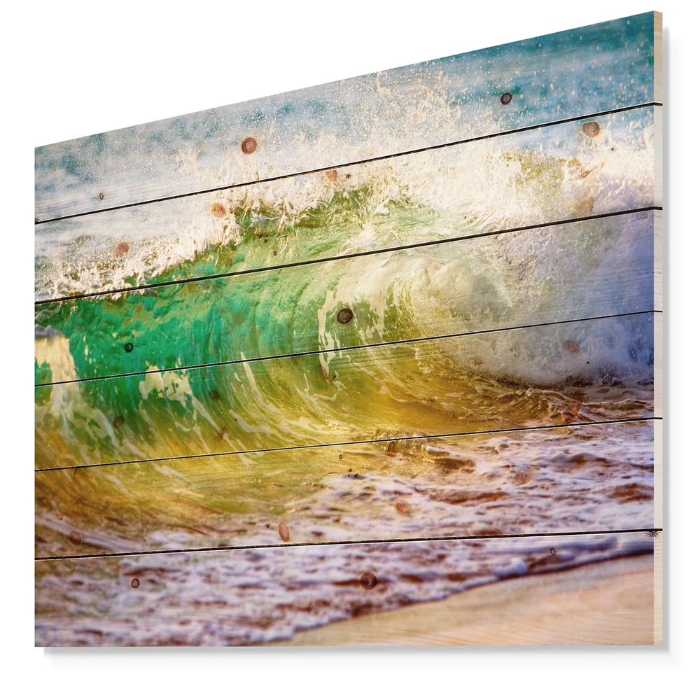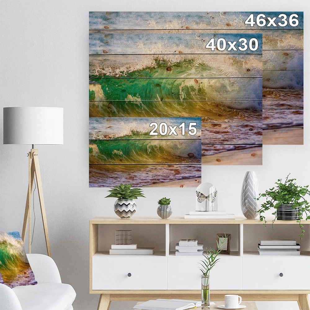 Alas, a modern take on wood wall art. Once typically a wall art piece found only in rustic or farmhouse style decor settings, this Sea & Shore wood wall art will easily fit into even the most contemporary of designs.Using the highest quality 6 Color Canon UV Ink, this Nautical & Coastal wood wall art incorporates several aspects of fine design into one stunning piece. With its slightly visible wood grain appearing through the colors and sleekly finished edges, it is a wonderful choice for any room in your home or office, being it a traditional or modern space. As each piece of wood has natural grain differences from the next, each of these wood wall arts is a truly unique addition to your space.Each Wood wall art is 100% handmade in Canada on Natural pine wood, using the highest quality Free Shipping Over $49.99* Details Designart 'Ocean Turning Green' Seascape Print on Natural Pine Wood - Green Product Description: Alas, a modern take on wood wall art. Once typically a wall art piece found only in rustic or farmhouse style decor settings, this Sea & Shore wood wall art will easily fit into even the most contemporary of designs. Using the highest quality 6 Color Canon UV Ink, this Nautical & Coastal wood wall art incorporates several aspects of fine design into one stunning piece. With its slightly visible wood grain appearing through the colors and sleekly finished edges, it is a wonderful choice for any room in your home or office, being it a traditional or modern space. As each piece of wood has natural grain differences from the next, each of these wood wall arts is a truly unique addition to your space. Each Wood wall art is 100% handmade in Canada on Natural pine wood, using the highest quality ink which will not fade over time. Available in 3 Differents sizes 20x15, 40x30, 46x36 - OrientationHorizontal - SubjectSea & Shore TypeWood Wall Art, Fine Art, Wood Fine Art, Print on Plaque - Arrives ready to hang on the wall with hanging kit included - MaterialMade with 100% natural pine wood - StyleNautical & Coastal- Number of Pieces1 - SizeMedium, Large, Small - ColorGreen