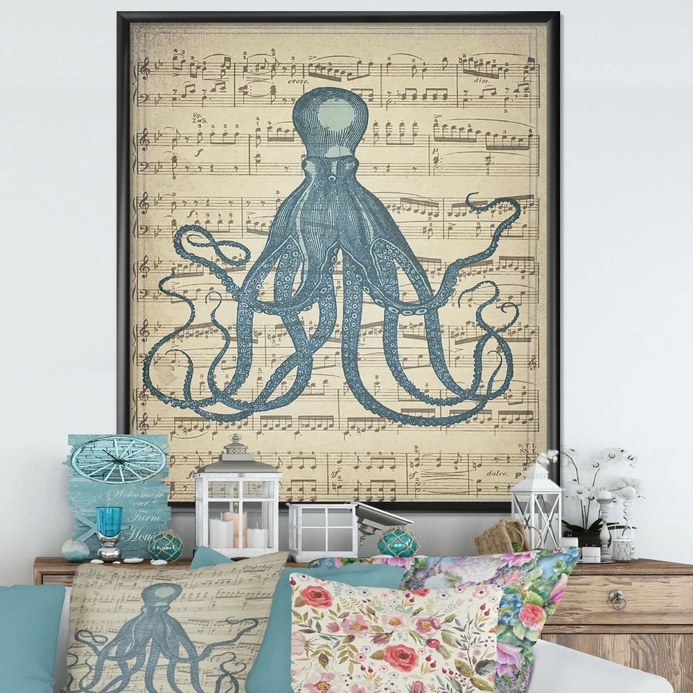 Up the nautical appeal of your home decor with the Designart 'Octopus Music Score II' premium framed art print. This unique print features a large octopus against a sheet music background, offering a great conversation starter that lends an imaginative element to your space, and the frame comes in your choice of color so you can easily match this artwork to your home decor. The premium-quality canvas is printed with fade-resistant inks to ensure longevity of display, and a hanging kit is included for your convenience.This framed art print is available in many different color frames. All of our framed art prints are carefully packaged with corner protectors, fragile labeling, and sturdy boxes to ensure a safe delivery. Every framed art arrives ready to hang on the wall, with the hanging kit Free Shipping Over $49.99* Details Designart "Octopus Music Score II" Nautical & Coastal Premium Framed Art Print Product Description: Up the nautical appeal of your home decor with the Designart 'Octopus Music Score II' premium framed art print. This unique print features a large octopus against a sheet music background, offering a great conversation starter that lends an imaginative element to your space, and the frame comes in your choice of color so you can easily match this artwork to your home decor. The premium-quality canvas is printed with fade-resistant inks to ensure longevity of display, and a hanging kit is included for your convenience. This framed art print is available in many different color frames. All of our framed art prints are carefully packaged with corner protectors, fragile labeling, and sturdy boxes to ensure a safe delivery. Every framed art arrives ready to hang on the wall, with the hanging kit included. Features: Style Traditional Subject Animals Color Blue Premium quality cotton canvas mounted. Available in several frame colors. Arrives with instructions and hanging kit