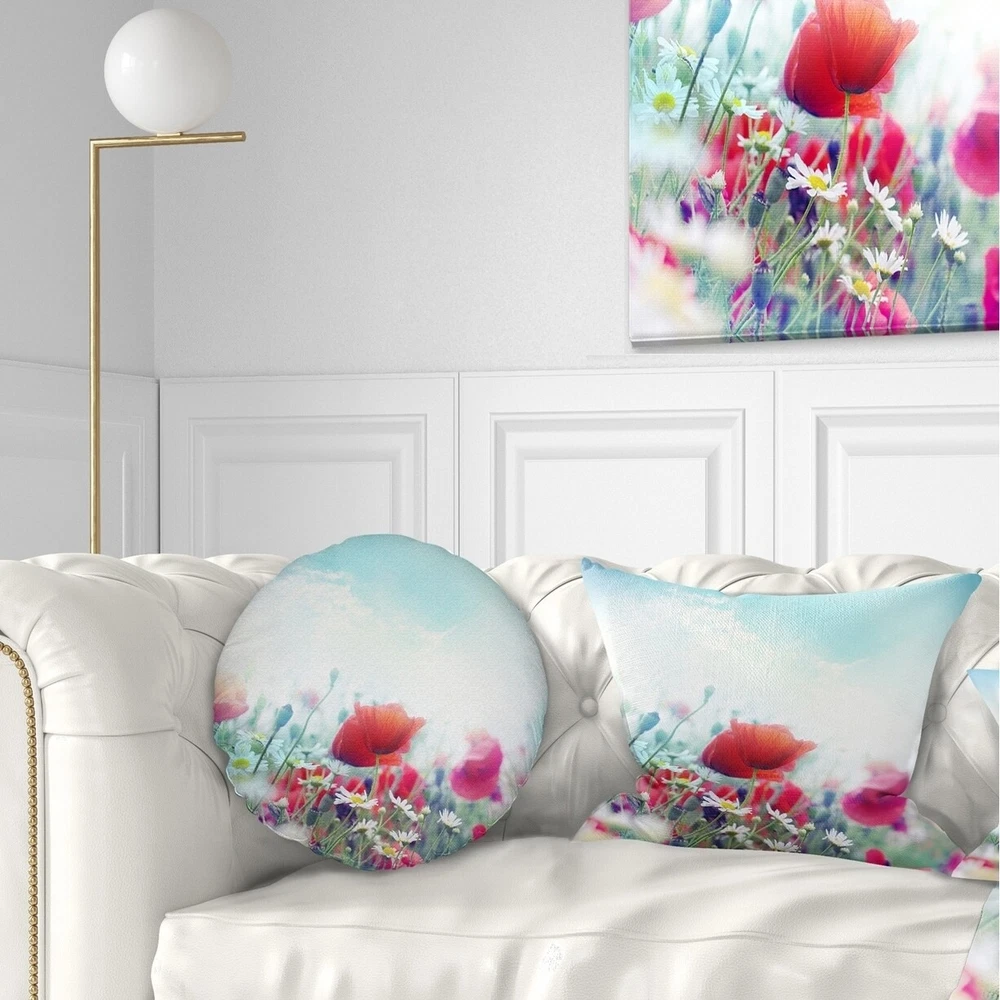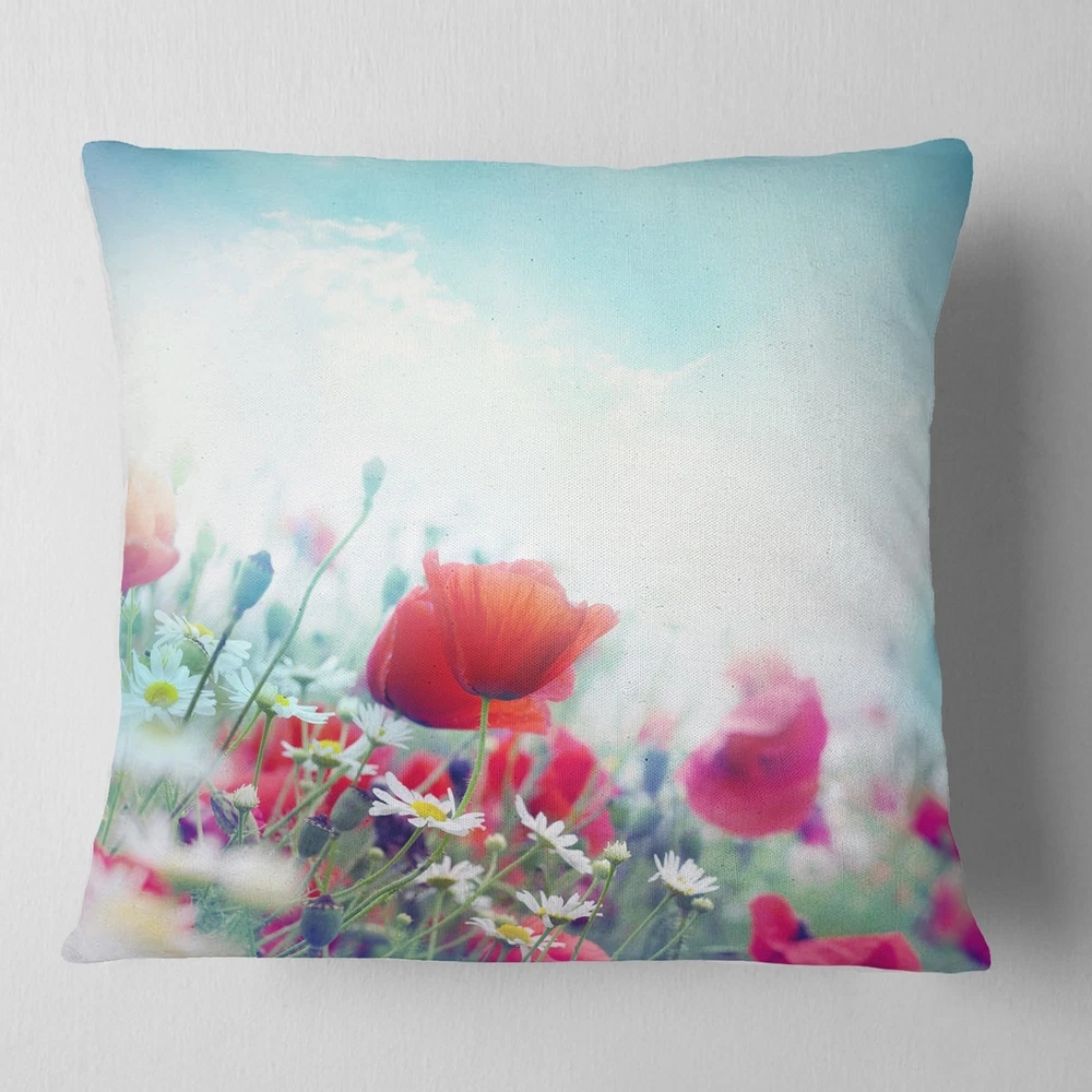 Decorative Throw Pillows for Couch Bed Sofa with Zip CoversAn easy, fun way to add a pop of color or bring new life to any room in your home or office is with these beautiful Floral throw pillows. Dress up your bed, sofa or lounger with this decorative design art pillows. Perfect as Farmhouse bedroom décor, lounge décor Traditional living room décor. It adds a fun accent to any room. Throw pillows really do work wonders: they can transform any room from uninviting discomfort to warm and welcoming. And they really do go almost anywhere - arrange a couple on the couch or sofa, place one in your overstuffed chair for extra coziness, toss a couple on the bed and prop yourself up for a great read.These Floral pillow is printed using High Color Density Italian inks to create a vibrantly colored, Free Shipping Over $49.99* Details Designart 'Red Poppies on Blue Background' Floral Throw Pillow Product Description: Decorative Throw Pillows for Couch Bed Sofa with Zip Covers An easy, fun way to add a pop of color or bring new life to any room in your home or office is with these beautiful Floral throw pillows. Dress up your bed, sofa or lounger with this decorative design art pillows. Perfect as Farmhouse bedroom décor, lounge décor Traditional living room décor. It adds a fun accent to any room. Throw pillows really do work wondersthey can transform any room from uninviting discomfort to warm and welcoming. And they really do go almost anywhere - arrange a couple on the couch or sofa, place one in your overstuffed chair for extra coziness, toss a couple on the bed and prop yourself up for a great read. These Floral pillow is printed using High Color Density Italian inks to create a vibrantly colored, sharp artwork. Features: Perfect accent to any furniture piece Basic shapes with a modern graphic design twist Printed on 100% light weight polyester Cushion filled with 100% polyester fill Wrinkle resistant fabric Zip Closure so you can remove the pillow from its' cover Down-like comfort - Odorless 100% Hypoallergenic Machine Wash Cold Separately, Gently Cycle Only, No bleach, hang to dry Print on Demand with High Density Italian Ink Available in Several sizes Attribute :Farmhouse, Traditional, Modern Subject Floral, Landscapes, Country Charm