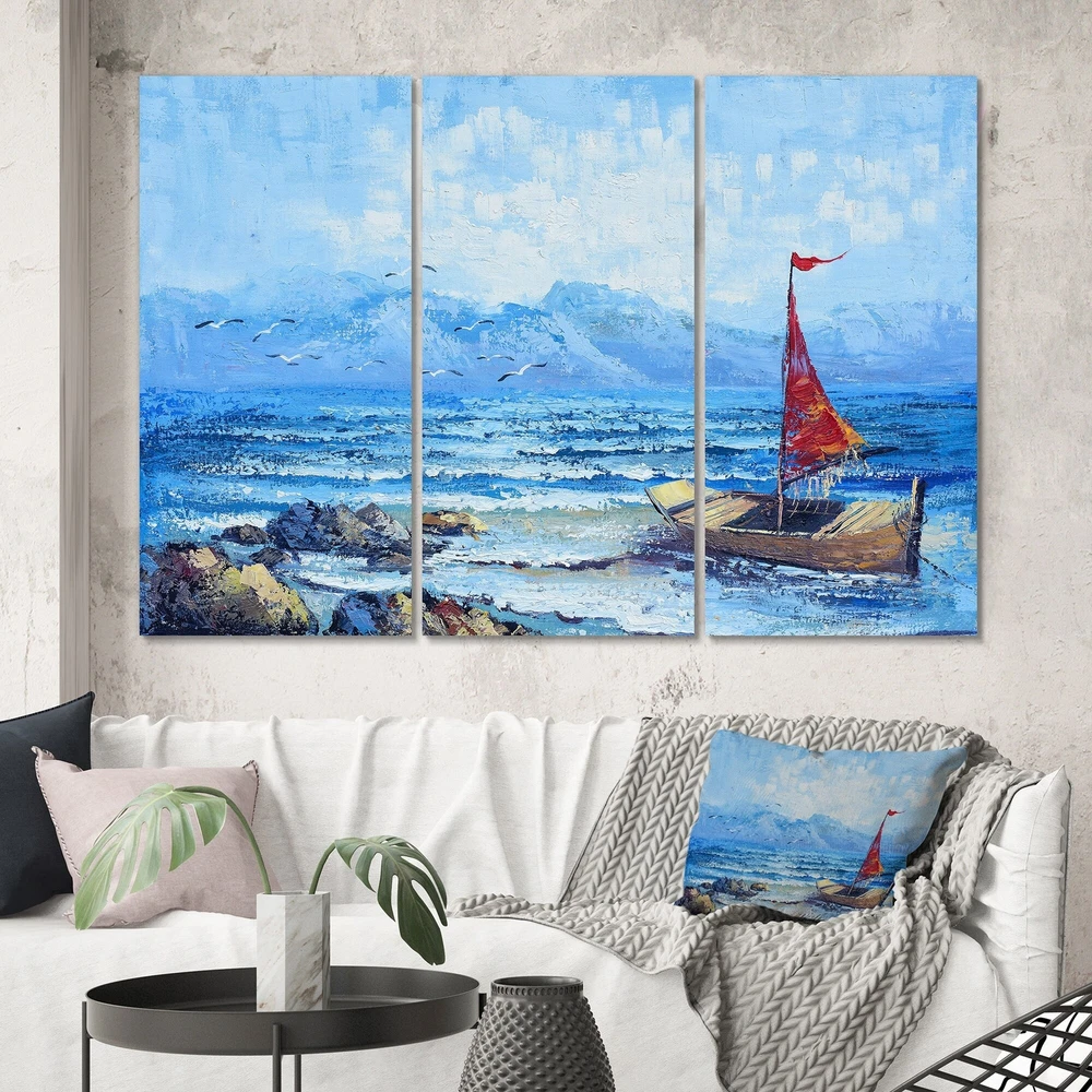 This beautiful Red Sailboat On Blue Ocean Multipanels canvas art is printed using the highest quality fade-resistant ink on canvas. Every one of our fine art giclee canvas prints is printed on premium quality cotton canvas, using the finest quality inks which will not fade over time. Each giclee print is stretched tightly over a 1-inch wood subframe ensuring the canvas is taught and does not buckle. This canvas art print is gallery-wrapped (the design continues on the sides), giving it a real art gallery feel. All of our canvas prints are carefully packaged with plastic protection, fragile labeling, and sturdy boxes to ensure safe delivery. Every canvas print arrives ready to hang on the wall, with the hanging kits included.- Style : Nautical & Coastal- Subject : Beach, Landscapes- Color : Free Shipping Over $49.99* Details Designart "Red Sailboat On Blue Ocean" Nautical & Coastal Canvas Wall Art Print Product Description: This beautiful Red Sailboat On Blue Ocean Multipanels canvas art is printed using the highest quality fade-resistant ink on canvas. Every one of our fine art giclee canvas prints is printed on premium quality cotton canvas, using the finest quality inks which will not fade over time. Each giclee print is stretched tightly over a 1-inch wood subframe ensuring the canvas is taught and does not buckle. This canvas art print is gallery-wrapped (the design continues on the sides), giving it a real art gallery feel. All of our canvas prints are carefully packaged with plastic protection, fragile labeling, and sturdy boxes to ensure safe delivery. Every canvas print arrives ready to hang on the wall, with the hanging kits included. - Style Nautical & Coastal - Subject Beach, Landscapes - Color Blue - This canvas giclee print is gallery-wrapped (the design continues on the sides) , giving it a real art gallery feel. - Premium quality cotton canvas. - Arrives ready to hang on the wall - Easy to Hang