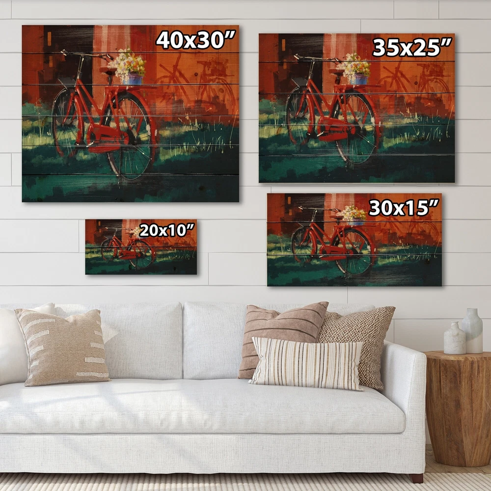 Alas, a modern take on wood wall art. Once typically a wall art piece found only in rustic or farmhouse style decor settings, this Transportation wood wall art will easily fit into even the most contemporary of designs.Using the highest quality 6 Color Canon UV Ink, this Vintage wood wall art incorporates several aspects of fine design into one stunning piece. With its slightly visible wood grain appearing through the colors and sleekly finished edges, it is a wonderful choice for any room in your home or office, being it a traditional or modern space. As each piece of wood has natural grain differences from the next, each of these wood wall arts is a truly unique addition to your space.Each Wood wall art is 100% handmade in Canada on Natural pine wood, using the highest quality ink which Free Shipping Over $49.99* Details Designart 'Red VIntage Bicycle With Bucket' Vintage Print on Natural Pine Wood Product Description: Alas, a modern take on wood wall art. Once typically a wall art piece found only in rustic or farmhouse style decor settings, this Transportation wood wall art will easily fit into even the most contemporary of designs. Using the highest quality 6 Color Canon UV Ink, this Vintage wood wall art incorporates several aspects of fine design into one stunning piece. With its slightly visible wood grain appearing through the colors and sleekly finished edges, it is a wonderful choice for any room in your home or office, being it a traditional or modern space. As each piece of wood has natural grain differences from the next, each of these wood wall arts is a truly unique addition to your space. Each Wood wall art is 100% handmade in Canada on Natural pine wood, using the highest quality ink which will not fade over time. Available in Differents sizes - OrientationHorizontal - SubjectTransportation TypeWood Wall Art, Fine Art, Wood Fine Art, Print on Plaque - Arrives ready to hang on the wall with hanging kit included - MaterialMade with 100% natural pine wood - StyleVintage - Number of Pieces1 - ColorOrange