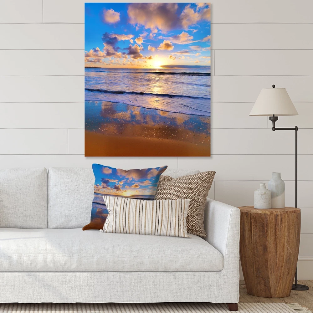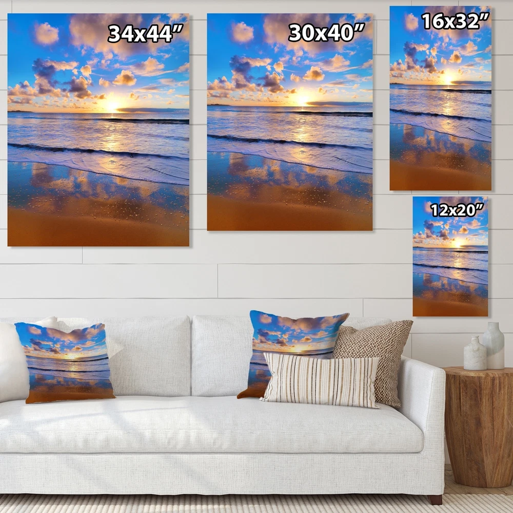This beautiful Rising Sun Over Beach Horizon Canvas Art is printed using the highest quality fade-resistant ink on canvas. Every one of our fine art giclee canvas prints is printed on premium quality cotton canvas, using the finest quality inks which will not fade over time. Each giclee print is stretched tightly over a 1-inch wood sub frame for small size prints or a 1.5-inch wood subframe for large size prints (40x30 60x28 ...) ensuring the canvas is taught and does not buckle. This canvas art print is gallery-wrapped (the design continues on the sides), giving it a real art gallery feel. All of our canvas prints are carefully packaged with plastic protection, fragile labeling, and sturdy boxes to ensure safe delivery. Every canvas print arrives ready to hang on the wall, with the Free Shipping Over $49.99* Details Designart "Rising Sun Over Beach Horizon" Nautical & Coastal Canvas Wall Art Product Description: This beautiful Rising Sun Over Beach Horizon Canvas Art is printed using the highest quality fade-resistant ink on canvas. Every one of our fine art giclee canvas prints is printed on premium quality cotton canvas, using the finest quality inks which will not fade over time. Each giclee print is stretched tightly over a 1-inch wood sub frame for small size prints or a 1.5-inch wood subframe for large size prints (40x30 60x28 ...) ensuring the canvas is taught and does not buckle. This canvas art print is gallery-wrapped (the design continues on the sides), giving it a real art gallery feel. All of our canvas prints are carefully packaged with plastic protection, fragile labeling, and sturdy boxes to ensure safe delivery. Every canvas print arrives ready to hang on the wall, with the hanging kits included. - Style Nautical & Coastal - Subject Beach, Landscapes - Color Blue - This canvas giclee print is gallery-wrapped (the design continues on the sides) , giving it a real art gallery feel. - Premium quality cotton canvas. - Arrives ready to hang on the wall - Easy to Hang