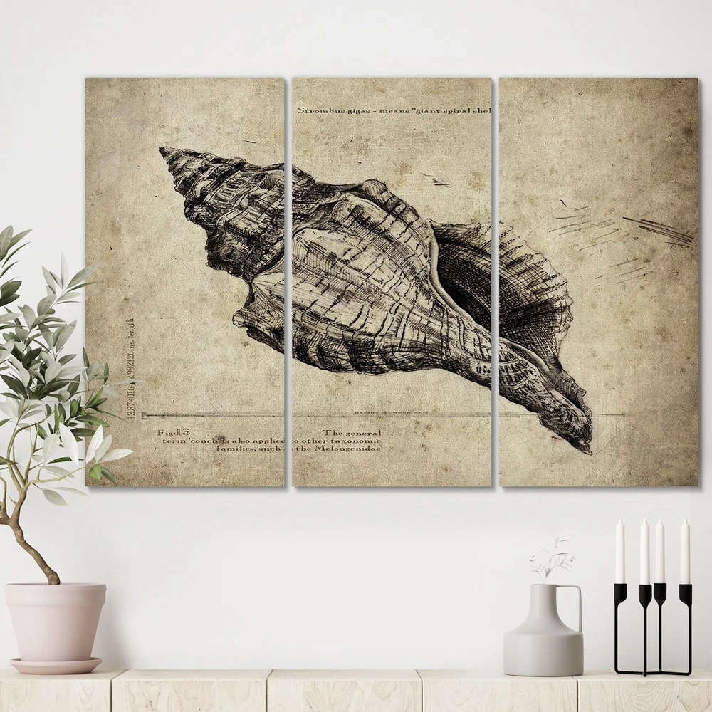 This beautiful Multipanel Sea Shell Old Style Sketch II Canvas Art is printed using the highest quality fade resistant ink on canvas. Every one of our fine art giclee canvas prints is printed on premium quality cotton canvas, using the finest quality inks which will not fade over time. Each giclee print is stretched tightly over a 1 inch wood sub frame for small size prints ensuring the canvas is taught and does not buckle. This canvas art print is gallery-wrapped (the design continues on the sides) , giving it a real art gallery feel. All of our canvas prints are carefully packaged with plastic protection, fragile labeling and sturdy boxes to ensure a safe delivery. Every canvas print arrives ready to hang on the wall, with the hanging kits included.- Style : Nautical & Coastal- Subject : Free Shipping Over $49.99* Details Designart "Sea Shell Old Style Sketch II" Nautical & Coastal Canvas Artwork Product Description: This beautiful Multipanel Sea Shell Old Style Sketch II Canvas Art is printed using the highest quality fade resistant ink on canvas. Every one of our fine art giclee canvas prints is printed on premium quality cotton canvas, using the finest quality inks which will not fade over time. Each giclee print is stretched tightly over a 1 inch wood sub frame for small size prints ensuring the canvas is taught and does not buckle. This canvas art print is gallery-wrapped (the design continues on the sides) , giving it a real art gallery feel. All of our canvas prints are carefully packaged with plastic protection, fragile labeling and sturdy boxes to ensure a safe delivery. Every canvas print arrives ready to hang on the wall, with the hanging kits included. - Style Nautical & Coastal - Subject Animals, Country Charm - Color Brown - This canvas giclee print is gallery-wrapped (the design continues on the sides) , giving it a real art gallery feel. - Premium quality cotton canvas. - Arrives ready to hang on the wall - Easy to Hang