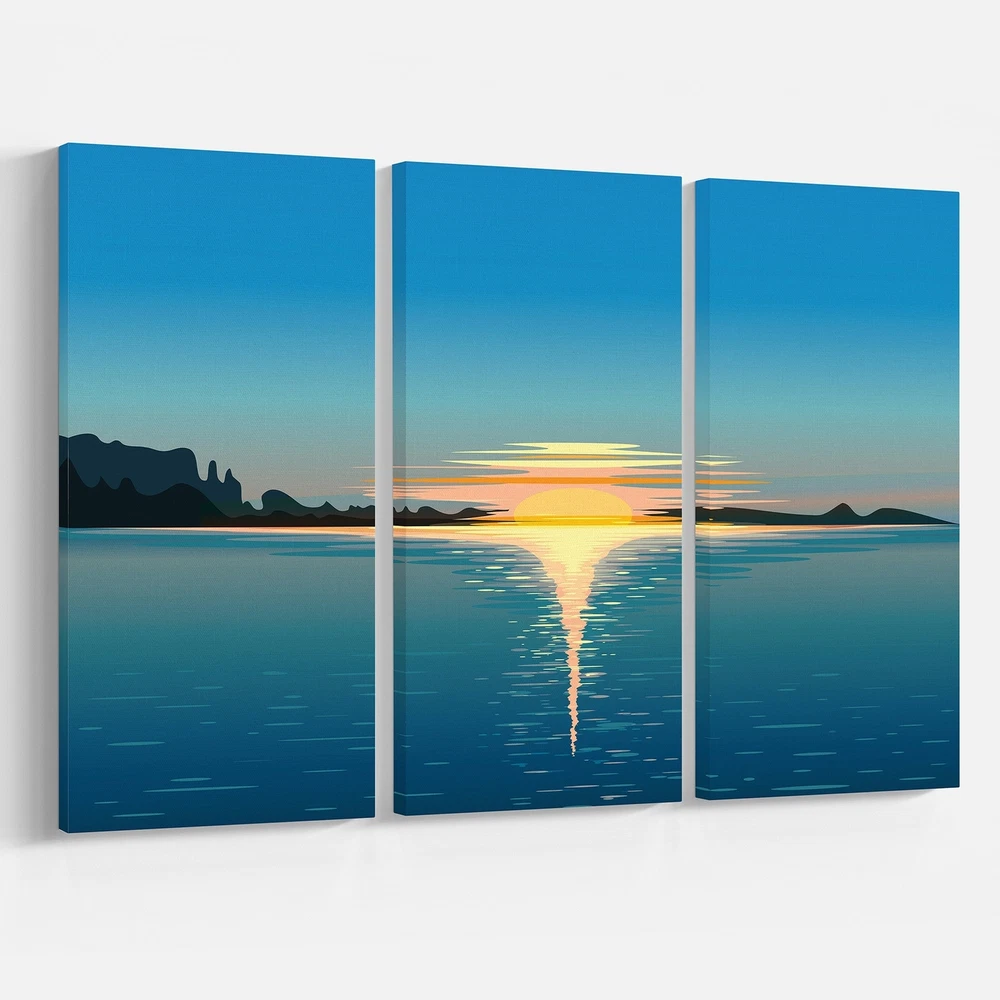 This beautiful Sea & Shore Canvas Art is printed using the highest quality fade resistant ink on canvas. Every one of our fine art giclee canvas prints is printed on premium quality cotton canvas, using the finest quality inks which will not fade over time. Each giclee print is stretched tightly over a 1 inch wood sub frame ensuring the canvas is taught and does not buckle. This canvas art print is gallery-wrapped (the design continues on the sides) , giving it a real art gallery feel. All of our canvas prints are carefully packaged with plastic protection, fragile labeling and sturdy boxes to ensure a safe delivery. Every canvas print arrives ready to hang on the wall, with the hanging kits included.- Style : Nautical & Coastal- Subject : Sea & Shore, Nautical- Color : Blue- This canvas Free Shipping Over $49.99* Details Designart "Sea Sinking Sun" Seascape Canvas Art Print - 36x28 - 3 Panels Product Description: This beautiful Sea & Shore Canvas Art is printed using the highest quality fade resistant ink on canvas. Every one of our fine art giclee canvas prints is printed on premium quality cotton canvas, using the finest quality inks which will not fade over time. Each giclee print is stretched tightly over a 1 inch wood sub frame ensuring the canvas is taught and does not buckle. This canvas art print is gallery-wrapped (the design continues on the sides) , giving it a real art gallery feel. All of our canvas prints are carefully packaged with plastic protection, fragile labeling and sturdy boxes to ensure a safe delivery. Every canvas print arrives ready to hang on the wall, with the hanging kits included. - Style Nautical & Coastal - Subject Sea & Shore, Nautical - Color Blue - This canvas giclee print is gallery-wrapped (the design continues on the sides) , giving it a real art gallery feel. - Premium quality cotton canvas. - Arrives ready to hang on the wall - Easy to Hang