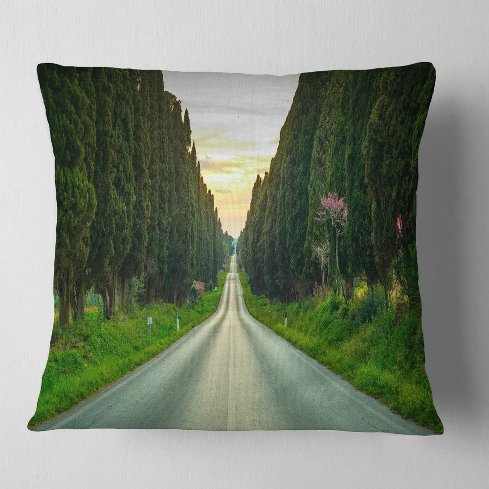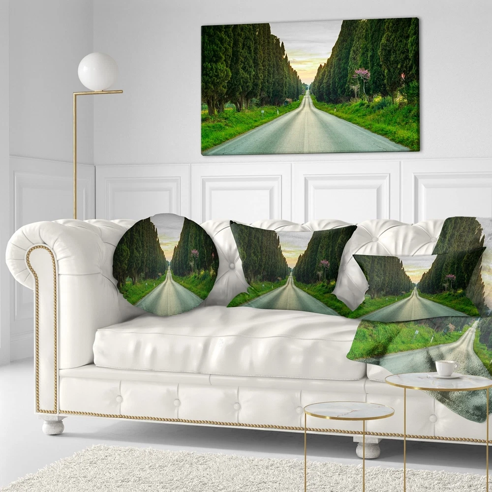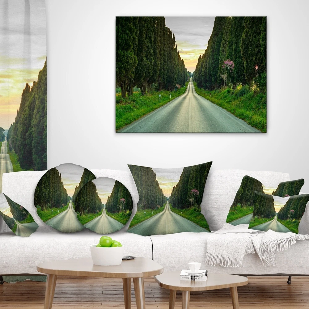 Decorative Throw Pillows for Couch Bed Sofa with Zip CoversAn easy, fun way to add a pop of color or bring new life to any room in your home or office is with these beautiful Landscape throw pillows. Dress up your bed, sofa or lounger with this decorative design art pillows. Perfect as Farmhouse bedroom décor, lounge décor Traditional living room décor. It adds a fun accent to any room. Throw pillows really do work wonders: they can transform any room from uninviting discomfort to warm and welcoming. And they really do go almost anywhere - arrange a couple on the couch or sofa, place one in your overstuffed chair for extra coziness, toss a couple on the bed and prop yourself up for a great read.These Landscapes pillow is printed using High Color Density Italian inks to create a vibrantly Free Shipping Over $49.99* Details Designart 'Straight Road through Cypress Trees' Landscape Wall Throw Pillow Product Description: Decorative Throw Pillows for Couch Bed Sofa with Zip Covers An easy, fun way to add a pop of color or bring new life to any room in your home or office is with these beautiful Landscape throw pillows. Dress up your bed, sofa or lounger with this decorative design art pillows. Perfect as Farmhouse bedroom décor, lounge décor Traditional living room décor. It adds a fun accent to any room. Throw pillows really do work wondersthey can transform any room from uninviting discomfort to warm and welcoming. And they really do go almost anywhere - arrange a couple on the couch or sofa, place one in your overstuffed chair for extra coziness, toss a couple on the bed and prop yourself up for a great read. These Landscapes pillow is printed using High Color Density Italian inks to create a vibrantly colored, sharp artwork. Features: Perfect accent to any furniture piece Basic shapes with a modern graphic design twist Printed on 100% light weight polyester Cushion filled with 100% polyester fill Wrinkle resistant fabric Zip Closure so you can remove the pillow from its' cover Down-like comfort - Odorless 100% Hypoallergenic Machine Wash Cold Separately, Gently Cycle Only, No bleach, hang to dry Print on Demand with High Density Italian Ink Available in Several sizes Attribute :Farmhouse, Traditional, Fine Art Giclee Subject Landscapes, Country Charrm, photography