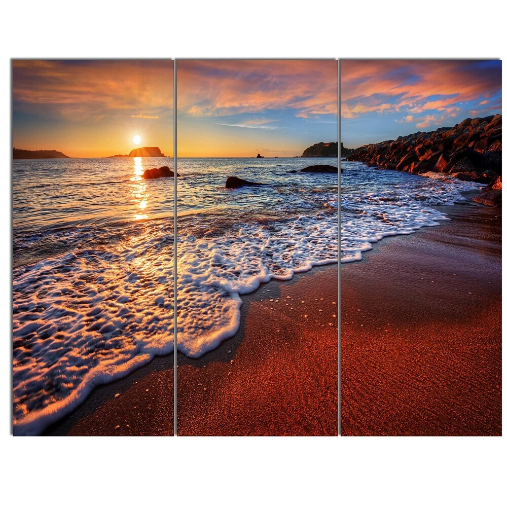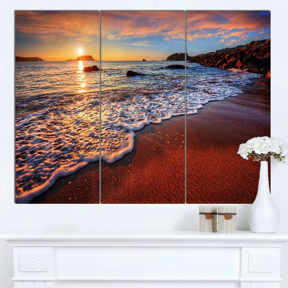 This beautiful Seascapes Canvas Art is printed using the highest quality fade resistant ink on canvas. Every one of our fine art giclee canvas prints is printed on premium quality cotton canvas, using the finest quality inks which will not fade over time. Each giclee print is stretched tightly over a 1 inch wood sub frame ensuring the canvas is taught and does not buckle. This canvas art print is gallery-wrapped (the design continues on the sides) , giving it a real art gallery feel. All of our canvas prints are carefully packaged with bubble wrap, fragile labeling and sturdy boxes to ensure a safe delivery. Every canvas print arrives ready to hang on the wall, with the hanging kits includedShape: RectangleOrientation: HorizontalSubject: Photography, Sea & Shore, Nautical, LandscapesStyle: Free Shipping Over $49.99* Details Designart "Stunning Ocean Beach at Sunset" Seashore Art Print on Canvas Product Description: This beautiful Seascapes Canvas Art is printed using the highest quality fade resistant ink on canvas. Every one of our fine art giclee canvas prints is printed on premium quality cotton canvas, using the finest quality inks which will not fade over time. Each giclee print is stretched tightly over a 1 inch wood sub frame ensuring the canvas is taught and does not buckle. This canvas art print is gallery-wrapped (the design continues on the sides) , giving it a real art gallery feel. All of our canvas prints are carefully packaged with bubble wrap, fragile labeling and sturdy boxes to ensure a safe delivery. Every canvas print arrives ready to hang on the wall, with the hanging kits included ShapeRectangle OrientationHorizontal SubjectPhotography, Sea & Shore, Nautical, Landscapes StyleContemporary, Fine Art Giclee, Modern Set Size3-piece Set SizeLarge