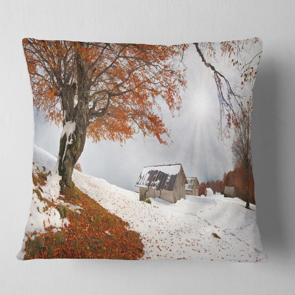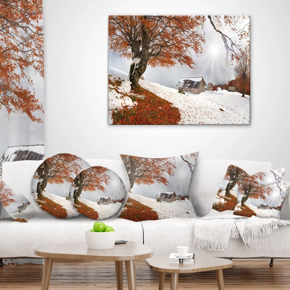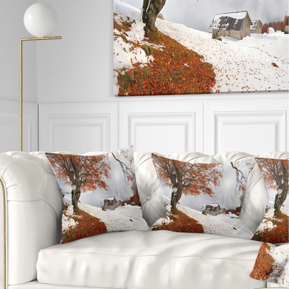 Decorative Throw Pillows for Couch Bed Sofa with Zip CoversAn easy, fun way to add a pop of color or bring new life to any room in your home or office is with these beautiful Landscape throw pillows. Dress up your bed, sofa or lounger with this decorative design art pillows. Perfect as Farmhouse bedroom décor, lounge décor Traditional living room décor. It adds a fun accent to any room. Throw pillows really do work wonders: they can transform any room from uninviting discomfort to warm and welcoming. And they really do go almost anywhere - arrange a couple on the couch or sofa, place one in your overstuffed chair for extra coziness, toss a couple on the bed and prop yourself up for a great read.These Landscapes pillow is printed using High Color Density Italian inks to create a vibrantly Free Shipping Over $49.99* Details Designart 'Sudden Snow in First Autumn' Landscape Photography Throw Pillow Product Description: Decorative Throw Pillows for Couch Bed Sofa with Zip Covers An easy, fun way to add a pop of color or bring new life to any room in your home or office is with these beautiful Landscape throw pillows. Dress up your bed, sofa or lounger with this decorative design art pillows. Perfect as Farmhouse bedroom décor, lounge décor Traditional living room décor. It adds a fun accent to any room. Throw pillows really do work wondersthey can transform any room from uninviting discomfort to warm and welcoming. And they really do go almost anywhere - arrange a couple on the couch or sofa, place one in your overstuffed chair for extra coziness, toss a couple on the bed and prop yourself up for a great read. These Landscapes pillow is printed using High Color Density Italian inks to create a vibrantly colored, sharp artwork. Features: Perfect accent to any furniture piece Basic shapes with a modern graphic design twist Printed on 100% light weight polyester Cushion filled with 100% polyester fill Wrinkle resistant fabric Zip Closure so you can remove the pillow from its' cover Down-like comfort - Odorless 100% Hypoallergenic Machine Wash Cold Separately, Gently Cycle Only, No bleach, hang to dry Print on Demand with High Density Italian Ink Available in Several sizes Attribute :Farmhouse, Traditional, Fine Art Giclee Subject Landscapes, Country Charrm, photography