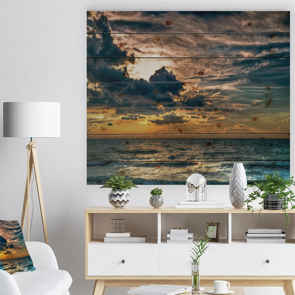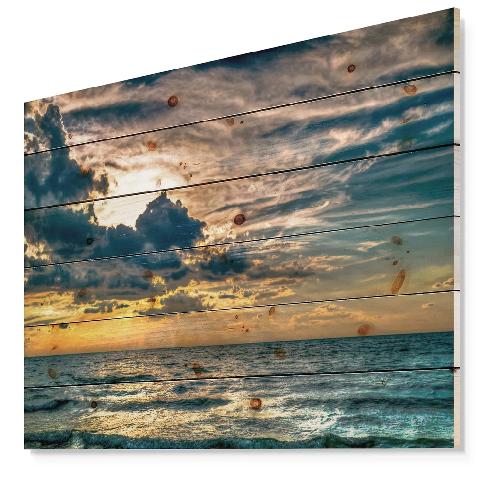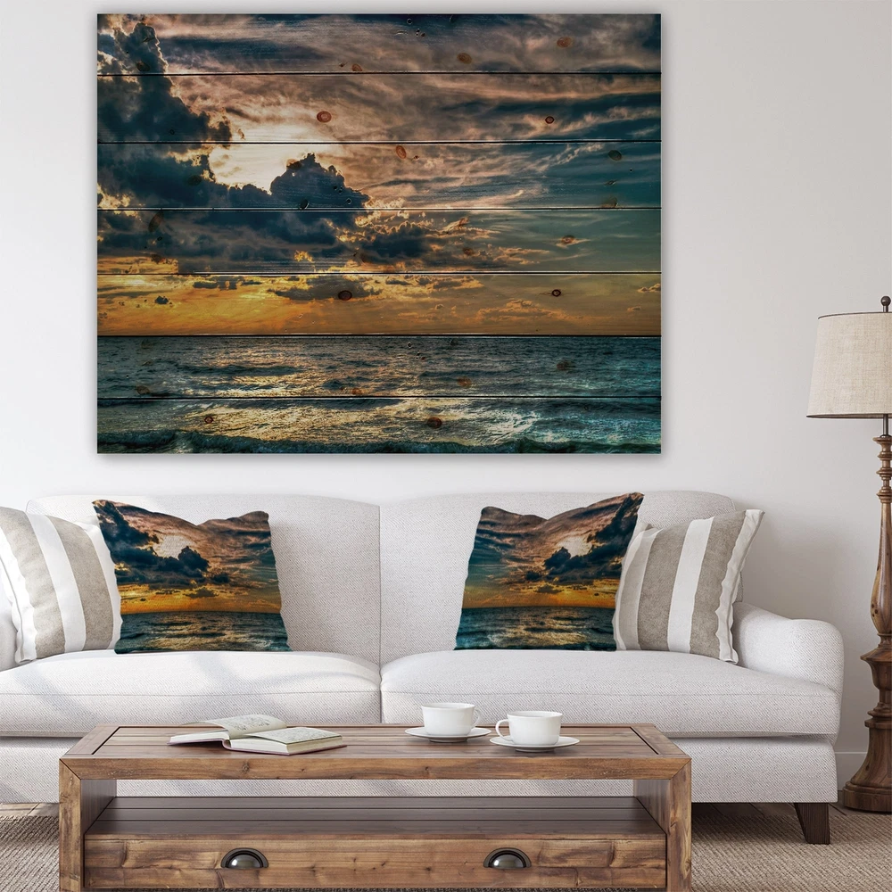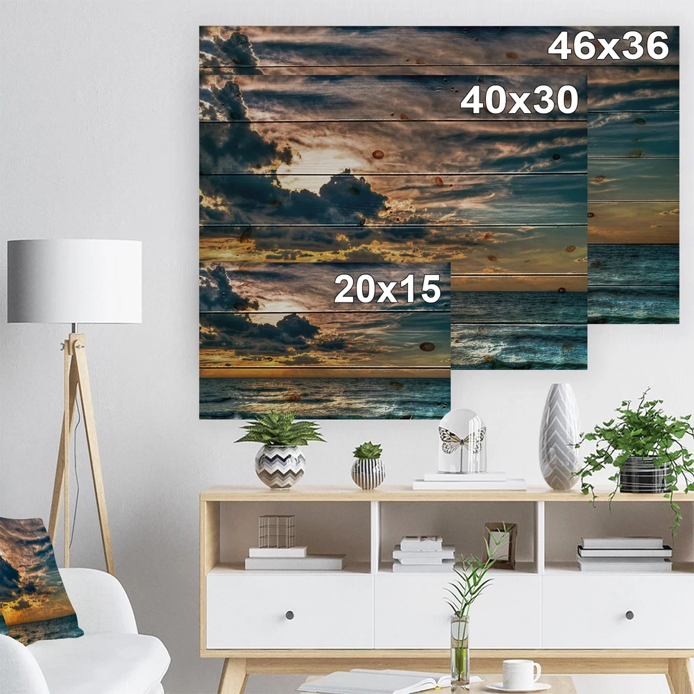 Alas, a modern take on wood wall art. Once typically a wall art piece found only in rustic or farmhouse style decor settings, this Sea & Shore wood wall art will easily fit into even the most contemporary of designs.Using the highest quality 6 Color Canon UV Ink, this Nautical & Coastal wood wall art incorporates several aspects of fine design into one stunning piece. With its slightly visible wood grain appearing through the colors and sleekly finished edges, it is a wonderful choice for any room in your home or office, being it a traditional or modern space. As each piece of wood has natural grain differences from the next, each of these wood wall arts is a truly unique addition to your space.Each Wood wall art is 100% handmade in Canada on Natural pine wood, using the highest quality Free Shipping Over $49.99* Details Designart 'Sun Break over Blue Ocean' Seashore Print on Natural Pine Wood Product Description: Alas, a modern take on wood wall art. Once typically a wall art piece found only in rustic or farmhouse style decor settings, this Sea & Shore wood wall art will easily fit into even the most contemporary of designs. Using the highest quality 6 Color Canon UV Ink, this Nautical & Coastal wood wall art incorporates several aspects of fine design into one stunning piece. With its slightly visible wood grain appearing through the colors and sleekly finished edges, it is a wonderful choice for any room in your home or office, being it a traditional or modern space. As each piece of wood has natural grain differences from the next, each of these wood wall arts is a truly unique addition to your space. Each Wood wall art is 100% handmade in Canada on Natural pine wood, using the highest quality ink which will not fade over time. Available in 3 Differents sizes 20x15, 40x30, 46x36 - OrientationHorizontal - SubjectSea & Shore TypeWood Wall Art, Fine Art, Wood Fine Art, Print on Plaque - Arrives ready to hang on the wall with hanging kit included - MaterialMade with 100% natural pine wood - StyleNautical & Coastal- Number of Pieces1 - SizeMedium, Large, Small - ColorBlue