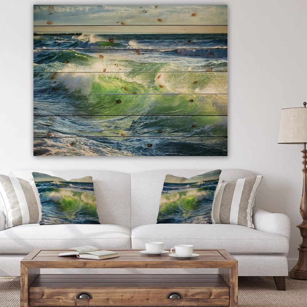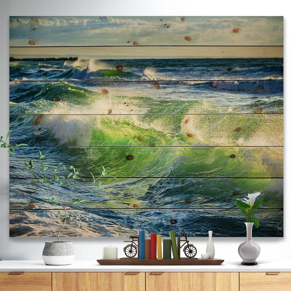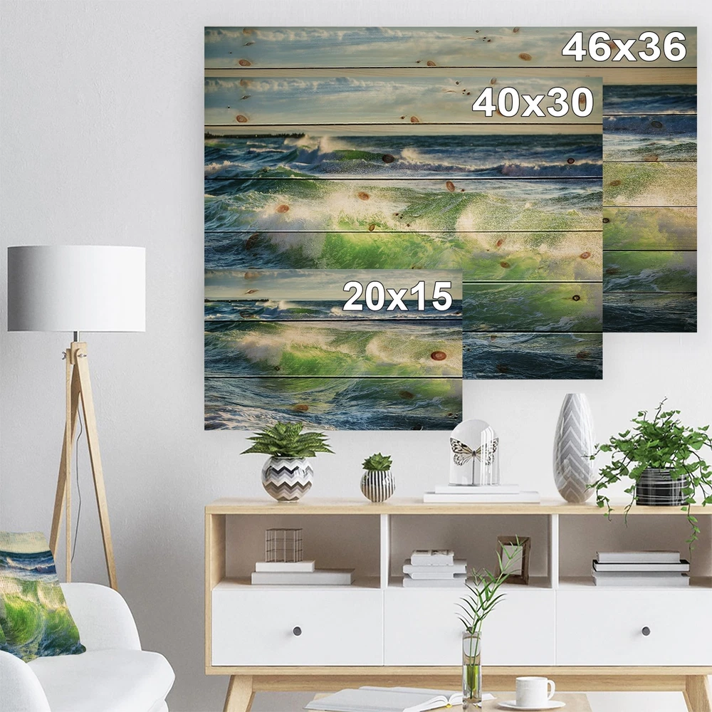 Alas, a modern take on wood wall art. Once typically a wall art piece found only in rustic or farmhouse style decor settings, this Sea & Shore wood wall art will easily fit into even the most contemporary of designs.Using the highest quality 6 Color Canon UV Ink, this Nautical & Coastal wood wall art incorporates several aspects of fine design into one stunning piece. With its slightly visible wood grain appearing through the colors and sleekly finished edges, it is a wonderful choice for any room in your home or office, being it a traditional or modern space. As each piece of wood has natural grain differences from the next, each of these wood wall arts is a truly unique addition to your space.Each Wood wall art is 100% handmade in Canada on Natural pine wood, using the highest quality Free Shipping Over $49.99* Details Designart 'Sunrise and Shining Waves in Ocean' Beach Photo Print on Natural Pine Product Description: Alas, a modern take on wood wall art. Once typically a wall art piece found only in rustic or farmhouse style decor settings, this Sea & Shore wood wall art will easily fit into even the most contemporary of designs. Using the highest quality 6 Color Canon UV Ink, this Nautical & Coastal wood wall art incorporates several aspects of fine design into one stunning piece. With its slightly visible wood grain appearing through the colors and sleekly finished edges, it is a wonderful choice for any room in your home or office, being it a traditional or modern space. As each piece of wood has natural grain differences from the next, each of these wood wall arts is a truly unique addition to your space. Each Wood wall art is 100% handmade in Canada on Natural pine wood, using the highest quality ink which will not fade over time. Available in 3 Differents sizes 20x15, 40x30, 46x36 - OrientationHorizontal - SubjectSea & Shore TypeWood Wall Art, Fine Art, Wood Fine Art, Print on Plaque - Arrives ready to hang on the wall with hanging kit included - MaterialMade with 100% natural pine wood - StyleNautical & Coastal- Number of Pieces1 - SizeMedium, Large, Small - ColorBlue