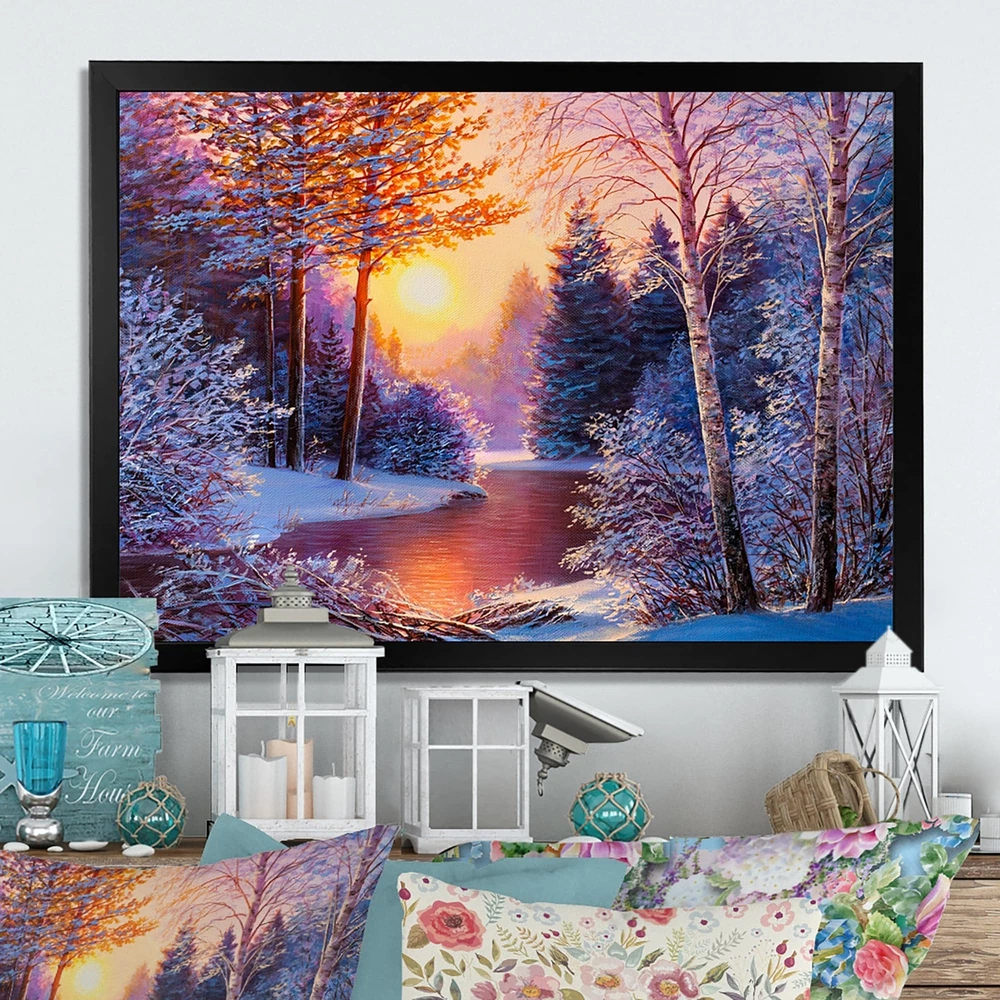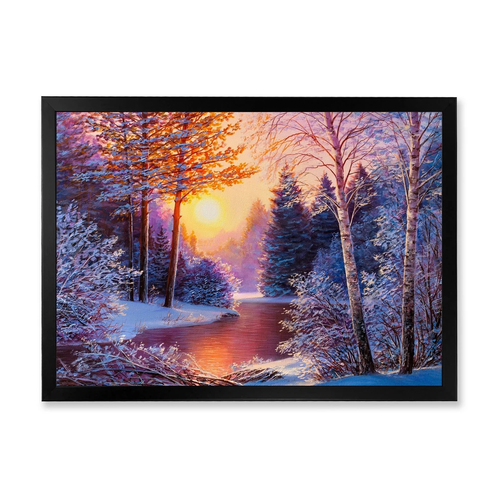 This beautiful Sunset On Winter River Painting II Framed wall Art is printed using the highest quality fade resistant ink on canvas. Every one of our Framed Giclee Prints is printed on premium quality canvas, using the finest quality inks which will not fade over time and then mounted and framed on a 1.5 inch wide frame.This framed art print is available in many different color frames. All of our framed art prints are carefully packaged with corner protectors, fragile labeling, and sturdy boxes to ensure a safe delivery. Every framed art arrives ready to hang on the wall, with the hanging kit included.Features:- Style : Traditional- Subject : Landscapes, Landscape & Nature, Floral & Botanical, Trees, Lakes & Rivers, Forest, Snow, SunriseSunset- Color : Blue- Premium quality cotton canvas Free Shipping Over $49.99* Details Designart "Sunset On Winter River Painting II" Traditional Framed Wall Art Product Description: This beautiful Sunset On Winter River Painting II Framed wall Art is printed using the highest quality fade resistant ink on canvas. Every one of our Framed Giclee Prints is printed on premium quality canvas, using the finest quality inks which will not fade over time and then mounted and framed on a 1.5 inch wide frame. This framed art print is available in many different color frames. All of our framed art prints are carefully packaged with corner protectors, fragile labeling, and sturdy boxes to ensure a safe delivery. Every framed art arrives ready to hang on the wall, with the hanging kit included. Features: - Style Traditional - Subject Landscapes, Landscape & Nature, Floral & Botanical, Trees, Lakes & Rivers, Forest, Snow, SunriseSunset - Color Blue - Premium quality cotton canvas mounted. - Available in several frame colors. - Arrives with instructions and hanging kit