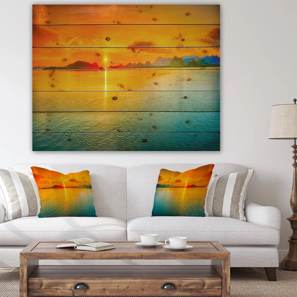 Alas, a modern take on wood wall art. Once typically a wall art piece found only in rustic or farmhouse style decor settings, this Sea & Shore wood wall art will easily fit into even the most contemporary of designs.Using the highest quality 6 Color Canon UV Ink, this Nautical & Coastal wood wall art incorporates several aspects of fine design into one stunning piece. With its slightly visible wood grain appearing through the colors and sleekly finished edges, it is a wonderful choice for any room in your home or office, being it a traditional or modern space. As each piece of wood has natural grain differences from the next, each of these wood wall arts is a truly unique addition to your space.Each Wood wall art is 100% handmade in Canada on Natural pine wood, using the highest quality Free Shipping Over $49.99* Details Designart 'Sunset Over Sea Panorama' Seascape Photography Print on Natural Pine Product Description: Alas, a modern take on wood wall art. Once typically a wall art piece found only in rustic or farmhouse style decor settings, this Sea & Shore wood wall art will easily fit into even the most contemporary of designs. Using the highest quality 6 Color Canon UV Ink, this Nautical & Coastal wood wall art incorporates several aspects of fine design into one stunning piece. With its slightly visible wood grain appearing through the colors and sleekly finished edges, it is a wonderful choice for any room in your home or office, being it a traditional or modern space. As each piece of wood has natural grain differences from the next, each of these wood wall arts is a truly unique addition to your space. Each Wood wall art is 100% handmade in Canada on Natural pine wood, using the highest quality ink which will not fade over time. Available in 3 Differents sizes 20x15, 40x30, 46x36 - OrientationHorizontal - SubjectSea & Shore TypeWood Wall Art, Fine Art, Wood Fine Art, Print on Plaque - Arrives ready to hang on the wall with hanging kit included - MaterialMade with 100% natural pine wood - StyleNautical & Coastal- Number of Pieces1 - SizeMedium, Large, Small - ColorOrange