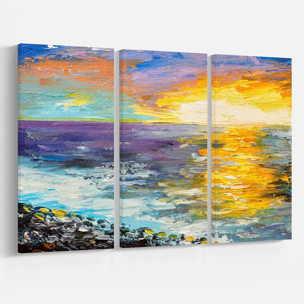 This beautiful Sea & Shore Canvas Art is printed using the highest quality fade resistant ink on canvas. Every one of our fine art giclee canvas prints is printed on premium quality cotton canvas, using the finest quality inks which will not fade over time. Each giclee print is stretched tightly over a 1 inch wood sub frame ensuring the canvas is taught and does not buckle. This canvas art print is gallery-wrapped (the design continues on the sides) , giving it a real art gallery feel. All of our canvas prints are carefully packaged with plastic protection, fragile labeling and sturdy boxes to ensure a safe delivery. Every canvas print arrives ready to hang on the wall, with the hanging kits included.- Style : Nautical & Coastal- Subject : Sea & Shore, Nautical- Color : Blue- This canvas Free Shipping Over $49.99* Details Designart "Sunset on the Coast" Sea & Shore Print on Wrapped Canvas set - 36x28 Product Description: This beautiful Sea & Shore Canvas Art is printed using the highest quality fade resistant ink on canvas. Every one of our fine art giclee canvas prints is printed on premium quality cotton canvas, using the finest quality inks which will not fade over time. Each giclee print is stretched tightly over a 1 inch wood sub frame ensuring the canvas is taught and does not buckle. This canvas art print is gallery-wrapped (the design continues on the sides) , giving it a real art gallery feel. All of our canvas prints are carefully packaged with plastic protection, fragile labeling and sturdy boxes to ensure a safe delivery. Every canvas print arrives ready to hang on the wall, with the hanging kits included. - Style Nautical & Coastal - Subject Sea & Shore, Nautical - Color Blue - This canvas giclee print is gallery-wrapped (the design continues on the sides) , giving it a real art gallery feel. - Premium quality cotton canvas. - Arrives ready to hang on the wall - Easy to Hang