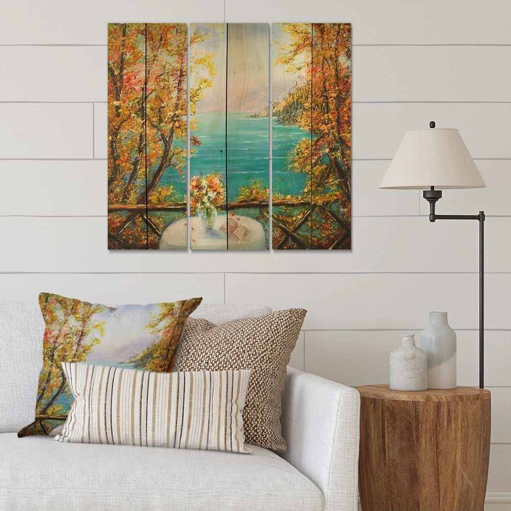Alas, a modern take on wood wall art. Once typically a wall art piece found only in rustic or farmhouse style decor settings, this Beach wood wall art will easily fit into even the most contemporary of designs.Using the highest quality 6 Color Canon UV Ink, this Nautical & Coastal wood wall art incorporates several aspects of fine design into one stunning piece. With its slightly visible wood grain appearing through the colors and sleekly finished edges, it is a wonderful choice for any room in your home or office, being it a traditional or modern space. As each piece of wood has natural grain differences from the next, each of these wood wall arts is a truly unique addition to your space.Each Wood wall art is 100% handmade in Canada on Natural pine wood, using the highest quality ink Free Shipping Over $49.99* Details Designart 'Terrace VIew By The Blue Ocean' Nautical & Coastal Print on Natural Product Description: Alas, a modern take on wood wall art. Once typically a wall art piece found only in rustic or farmhouse style decor settings, this Beach wood wall art will easily fit into even the most contemporary of designs. Using the highest quality 6 Color Canon UV Ink, this Nautical & Coastal wood wall art incorporates several aspects of fine design into one stunning piece. With its slightly visible wood grain appearing through the colors and sleekly finished edges, it is a wonderful choice for any room in your home or office, being it a traditional or modern space. As each piece of wood has natural grain differences from the next, each of these wood wall arts is a truly unique addition to your space. Each Wood wall art is 100% handmade in Canada on Natural pine wood, using the highest quality ink which will not fade over time. - OrientationHorizontal - SubjectBeach TypeWood Wall Art, Fine Art, Wood Fine Art, Print on Plaque - Arrives ready to hang on the wall with hanging kit included - MaterialMade with 100% natural pine wood - StyleNautical & Coastal - Number of Pieces3 - ColorBlue