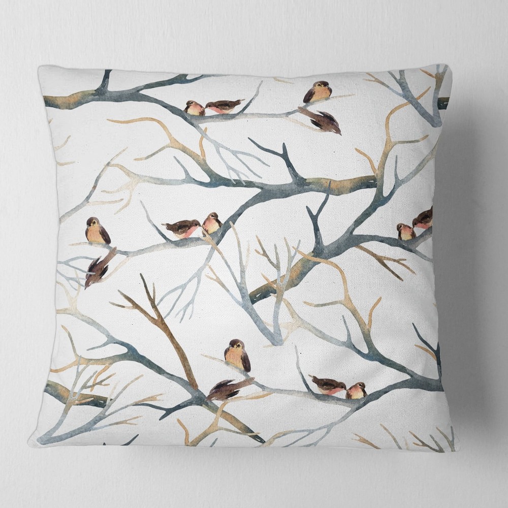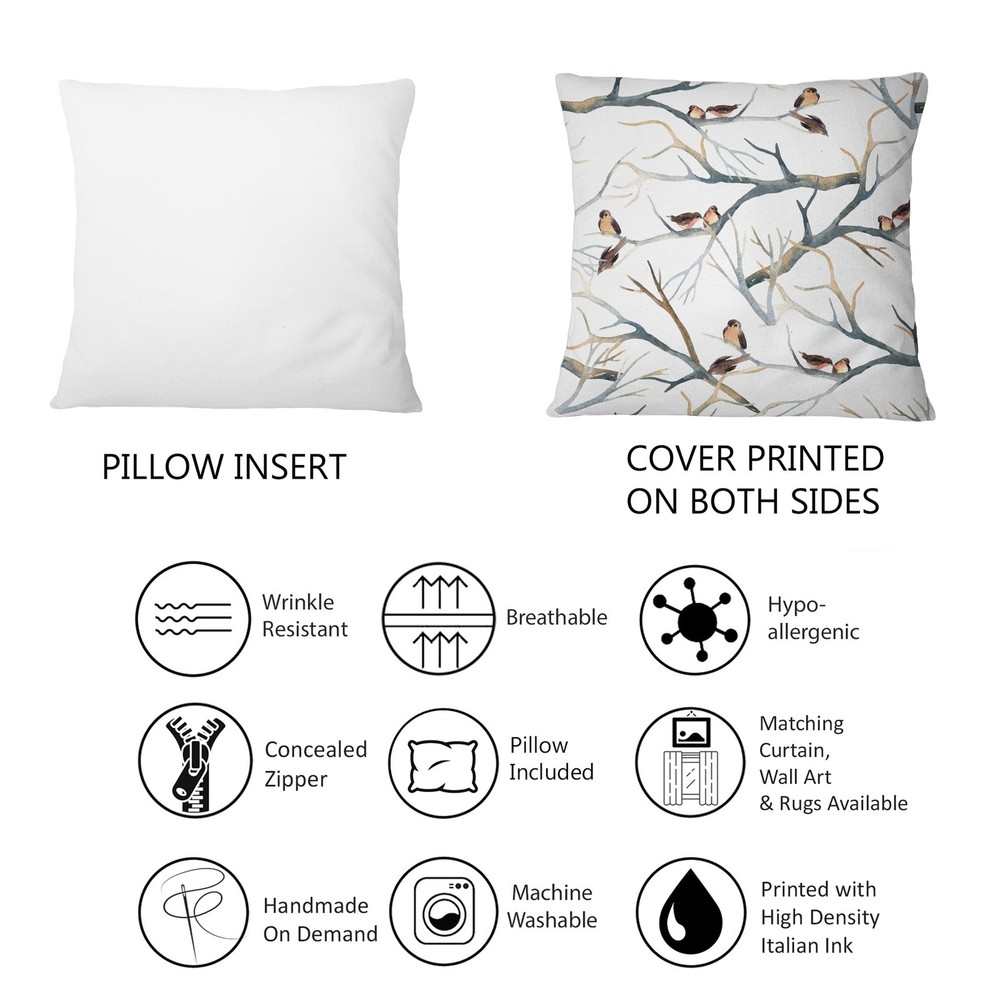 Decorative Throw Pillows for Couch Bed Sofa with Zip CoversAn easy, fun way to add a pop of color or bring new life to any room in your home or office is with these beautiful Traditional throw pillows. Dress up your bed, sofa or lounger with this decorative design art pillows. Perfect as Traditional bedroom decor, lounge decor Farmhouse living room decor. It adds a fun accent to any room. Throw pillows really do work wonders: they can transform any room from uninviting discomfort to warm and welcoming. And they really do go almost anywhere - arrange a couple on the couch or sofa, place one in your overstuffed chair for extra coziness, toss a couple on the bed and prop yourself up for a great read. These Animals pillow is printed using High Color Density Italian inks to create a vibrantly Free Shipping Over $49.99* Details Designart 'Little Birds On The Tree Branches I' Traditional Printed Throw Pillow Product Description: Decorative Throw Pillows for Couch Bed Sofa with Zip Covers An easy, fun way to add a pop of color or bring new life to any room in your home or office is with these beautiful Traditional throw pillows. Dress up your bed, sofa or lounger with this decorative design art pillows. Perfect as Traditional bedroom decor, lounge decor Farmhouse living room decor. It adds a fun accent to any room. Throw pillows really do work wondersthey can transform any room from uninviting discomfort to warm and welcoming. And they really do go almost anywhere - arrange a couple on the couch or sofa, place one in your overstuffed chair for extra coziness, toss a couple on the bed and prop yourself up for a great read. These Animals pillow is printed using High Color Density Italian inks to create a vibrantly colored, sharp artwork. Features: - Perfect accent to any furniture piece - Basic shapes with a modern graphic design twist - Printed on 100% light weight polyester - Cushion filled with 100% polyester fill - Wrinkle resistant fabric - Zip Closure so you can remove the pillow from its' cover - Down-like comfort - Odorless - 100% Hypoallergenic - Machine Wash Cold Separately, Gently Cycle Only, No bleach, hang to dry - Print on Demand with High Density Italian Ink - Available in Several sizes - Attribute :Traditional - Subject Animals, Floral,