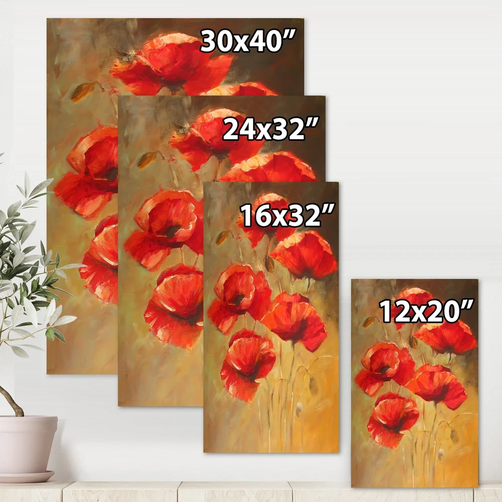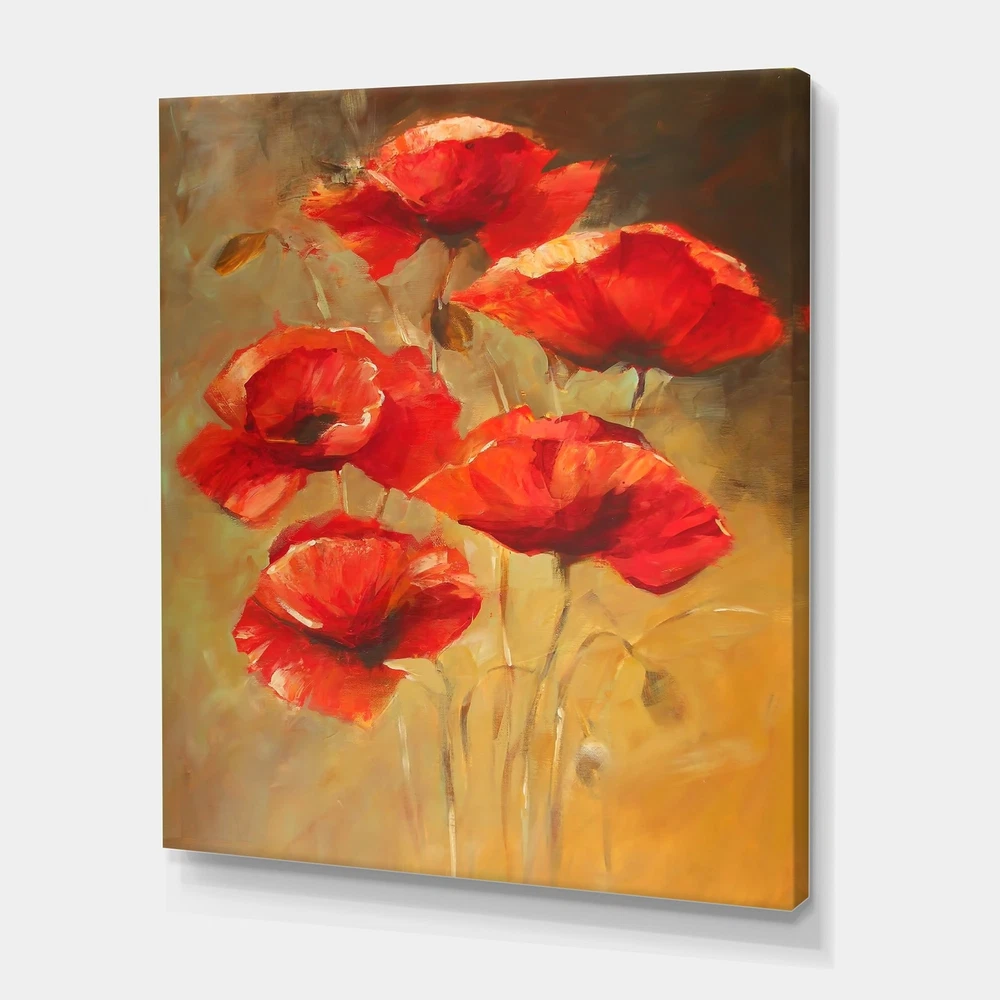 This beautiful Traditional Canvas Art is printed using the highest quality fade resistant ink on canvas. Every one of our fine art giclee canvas prints is printed on premium quality cotton canvas, using the finest quality inks which will not fade over time. Each giclee print is stretched tightly over a 1 inch wood sub frame for small size prints or a 1.5 inch wood sub frame for large size prints (40x30 36x36 ...) ensuring the canvas is taught and does not buckle. This canvas art print is gallery-wrapped (the design continues on the sides) , giving it a real art gallery feel. All of our canvas prints are carefully packaged with plastic protection, fragile labeling and sturdy boxes to ensure a safe delivery. Every canvas print arrives ready to hang on the wall, with the hanging kits Free Shipping Over $49.99* Details Designart "Vintage Blooming Poppies II" Traditional Canvas Wall Art Print Product Description: This beautiful Traditional Canvas Art is printed using the highest quality fade resistant ink on canvas. Every one of our fine art giclee canvas prints is printed on premium quality cotton canvas, using the finest quality inks which will not fade over time. Each giclee print is stretched tightly over a 1 inch wood sub frame for small size prints or a 1.5 inch wood sub frame for large size prints (40x30 36x36 ...) ensuring the canvas is taught and does not buckle. This canvas art print is gallery-wrapped (the design continues on the sides) , giving it a real art gallery feel. All of our canvas prints are carefully packaged with plastic protection, fragile labeling and sturdy boxes to ensure a safe delivery. Every canvas print arrives ready to hang on the wall, with the hanging kits included. - Style Traditional,Farmhouse - Subject Floral, Landscapes - Color Red,Brown - This canvas giclee print is gallery-wrapped (the design continues on the sides) , giving it a real art gallery feel. - Premium quality cotton canvas. - Arrives ready to hang on the wall - Easy to Hang