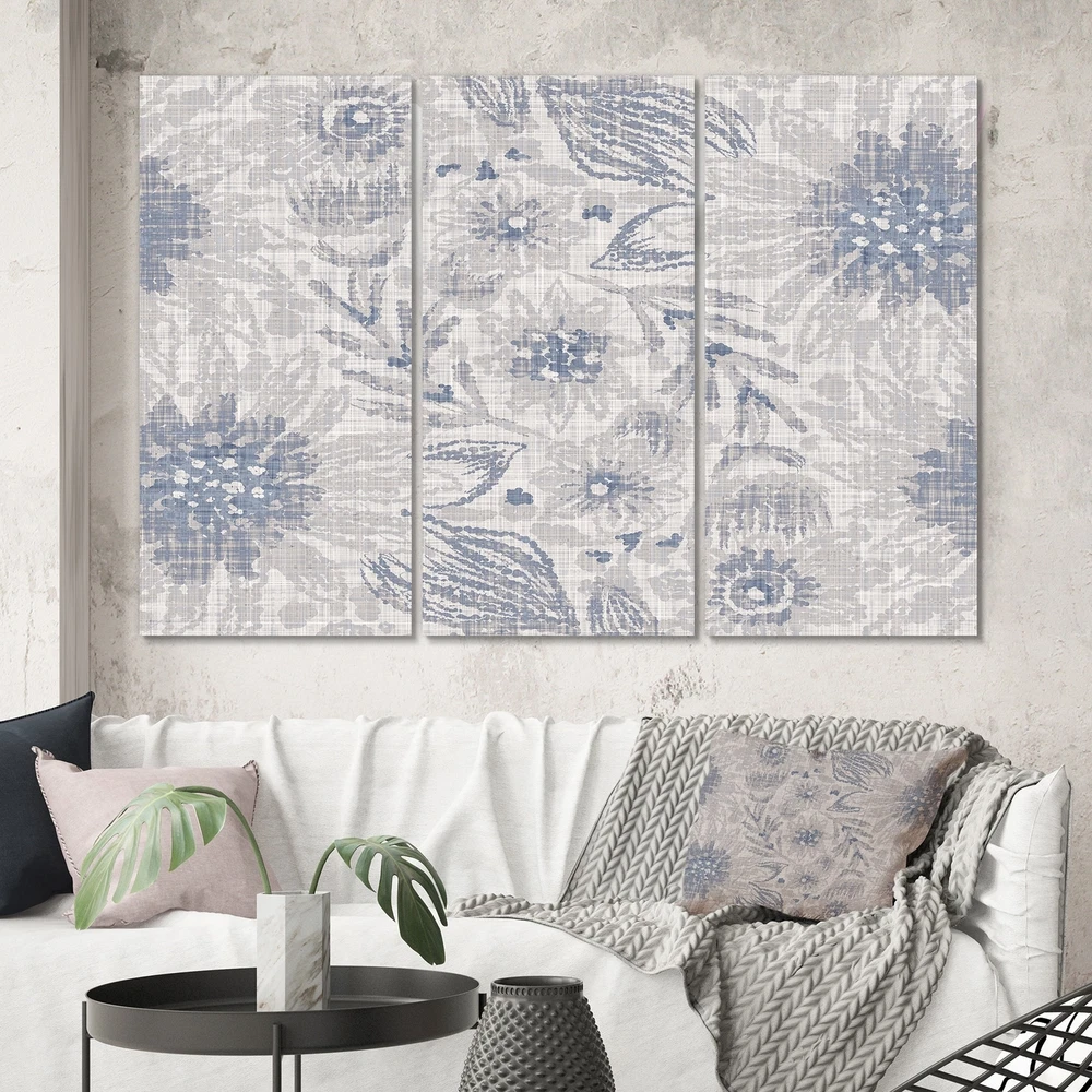 This beautiful Vintage Blue Farmhouse Flower V Multipanels canvas art is printed using the highest quality fade-resistant ink on canvas. Every one of our fine art giclee canvas prints is printed on premium quality cotton canvas, using the finest quality inks which will not fade over time. Each giclee print is stretched tightly over a 1-inch wood subframe ensuring the canvas is taught and does not buckle. This canvas art print is gallery-wrapped (the design continues on the sides), giving it a real art gallery feel. All of our canvas prints are carefully packaged with plastic protection, fragile labeling, and sturdy boxes to ensure safe delivery. Every canvas print arrives ready to hang on the wall, with the hanging kits included.- Style : Patterned- Subject : Floral, - Color : Grey- This Free Shipping Over $49.99* Details Designart "Vintage Blue Farmhouse Flower V" Patterned Canvas Wall Art Print Product Description: This beautiful Vintage Blue Farmhouse Flower V Multipanels canvas art is printed using the highest quality fade-resistant ink on canvas. Every one of our fine art giclee canvas prints is printed on premium quality cotton canvas, using the finest quality inks which will not fade over time. Each giclee print is stretched tightly over a 1-inch wood subframe ensuring the canvas is taught and does not buckle. This canvas art print is gallery-wrapped (the design continues on the sides), giving it a real art gallery feel. All of our canvas prints are carefully packaged with plastic protection, fragile labeling, and sturdy boxes to ensure safe delivery. Every canvas print arrives ready to hang on the wall, with the hanging kits included. - Style Patterned - Subject Floral, - Color Grey - This canvas giclee print is gallery-wrapped (the design continues on the sides) , giving it a real art gallery feel. - Premium quality cotton canvas. - Arrives ready to hang on the wall - Easy to Hang
