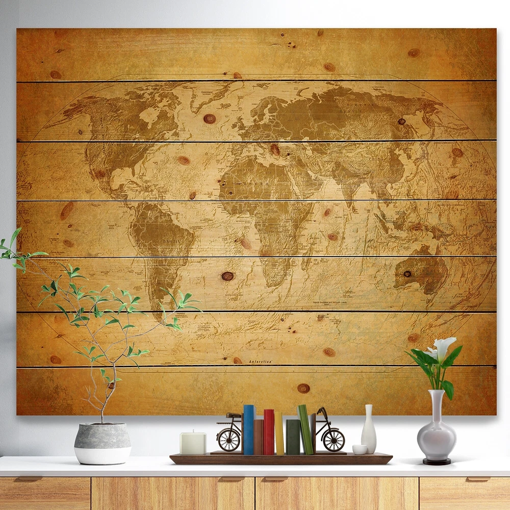Accessorize global-inspired decor with this wall art print depicting a map of the world. Slatted pinewood takes the place of a traditional canvas to add an inventive note to your decor, while non-fading ink ensures lasting clarity. This artwork comes with hanging hardware for convenient installation. Free Shipping Over $49.99* Details Designart 'Vintage Classic Map' Contemporary Print on Natural Pine Wood - beige Product Description: Accessorize global-inspired decor with this wall art print depicting a map of the world. Slatted pinewood takes the place of a traditional canvas to add an inventive note to your decor, while non-fading ink ensures lasting clarity. This artwork comes with hanging hardware for convenient installation.