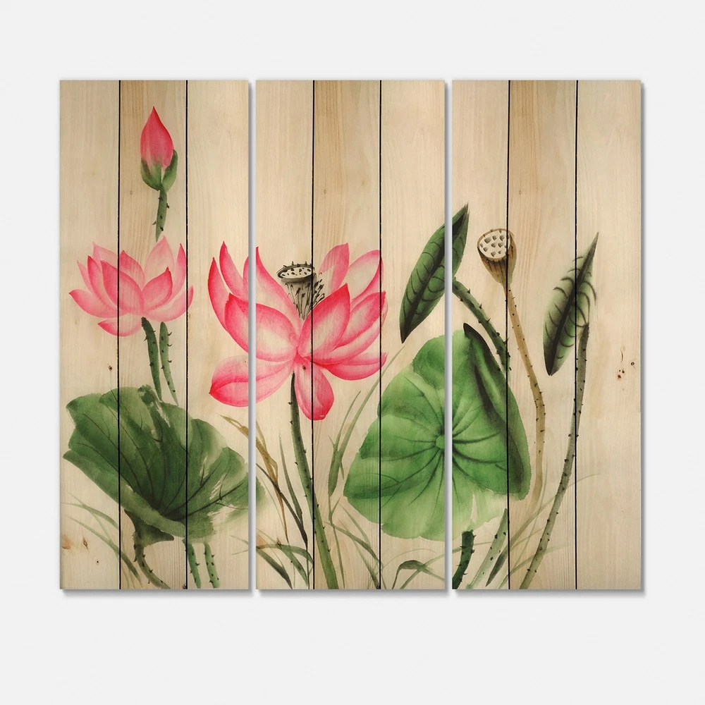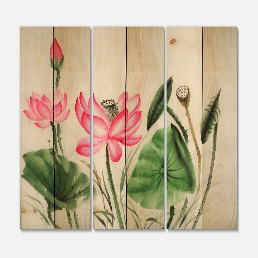 Alas, a modern take on wood wall art. Once typically a wall art piece found only in rustic or farmhouse style decor settings, this Floral wood wall art will easily fit into even the most contemporary of designs.Using the highest quality 6 Color Canon UV Ink, this Traditional wood wall art incorporates several aspects of fine design into one stunning piece. With its slightly visible wood grain appearing through the colors and sleekly finished edges, it is a wonderful choice for any room in your home or office, being it a traditional or modern space. As each piece of wood has natural grain differences from the next, each of these wood wall arts is a truly unique addition to your space.Each Wood wall art is 100% handmade in Canada on Natural pine wood, using the highest quality ink which will Free Shipping Over $49.99* Details Designart 'Vintage Pink Lotuses In The Pond II' Traditional Print on Natural Product Description: Alas, a modern take on wood wall art. Once typically a wall art piece found only in rustic or farmhouse style decor settings, this Floral wood wall art will easily fit into even the most contemporary of designs. Using the highest quality 6 Color Canon UV Ink, this Traditional wood wall art incorporates several aspects of fine design into one stunning piece. With its slightly visible wood grain appearing through the colors and sleekly finished edges, it is a wonderful choice for any room in your home or office, being it a traditional or modern space. As each piece of wood has natural grain differences from the next, each of these wood wall arts is a truly unique addition to your space. Each Wood wall art is 100% handmade in Canada on Natural pine wood, using the highest quality ink which will not fade over time. - OrientationHorizontal - SubjectFloral TypeWood Wall Art, Fine Art, Wood Fine Art, Print on Plaque - Arrives ready to hang on the wall with hanging kit included - MaterialMade with 100% natural pine wood - StyleTraditional - Number of Pieces3 - ColorPink