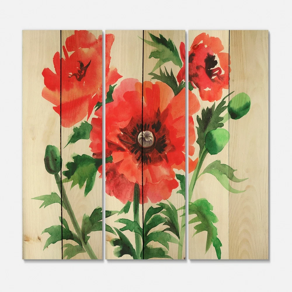 Alas, a modern take on wood wall art. Once typically a wall art piece found only in rustic or farmhouse style decor settings, this Floral wood wall art will easily fit into even the most contemporary of designs.Using the highest quality 6 Color Canon UV Ink, this Traditional wood wall art incorporates several aspects of fine design into one stunning piece. With its slightly visible wood grain appearing through the colors and sleekly finished edges, it is a wonderful choice for any room in your home or office, being it a traditional or modern space. As each piece of wood has natural grain differences from the next, each of these wood wall arts is a truly unique addition to your space.Each Wood wall art is 100% handmade in Canada on Natural pine wood, using the highest quality ink which will Free Shipping Over $49.99* Details Designart 'Vintage Red Poppies II' Traditional Print on Natural Pine Wood - 3 Product Description: Alas, a modern take on wood wall art. Once typically a wall art piece found only in rustic or farmhouse style decor settings, this Floral wood wall art will easily fit into even the most contemporary of designs. Using the highest quality 6 Color Canon UV Ink, this Traditional wood wall art incorporates several aspects of fine design into one stunning piece. With its slightly visible wood grain appearing through the colors and sleekly finished edges, it is a wonderful choice for any room in your home or office, being it a traditional or modern space. As each piece of wood has natural grain differences from the next, each of these wood wall arts is a truly unique addition to your space. Each Wood wall art is 100% handmade in Canada on Natural pine wood, using the highest quality ink which will not fade over time. - OrientationHorizontal - SubjectFloral TypeWood Wall Art, Fine Art, Wood Fine Art, Print on Plaque - Arrives ready to hang on the wall with hanging kit included - MaterialMade with 100% natural pine wood - StyleTraditional - Number of Pieces3 - ColorRed